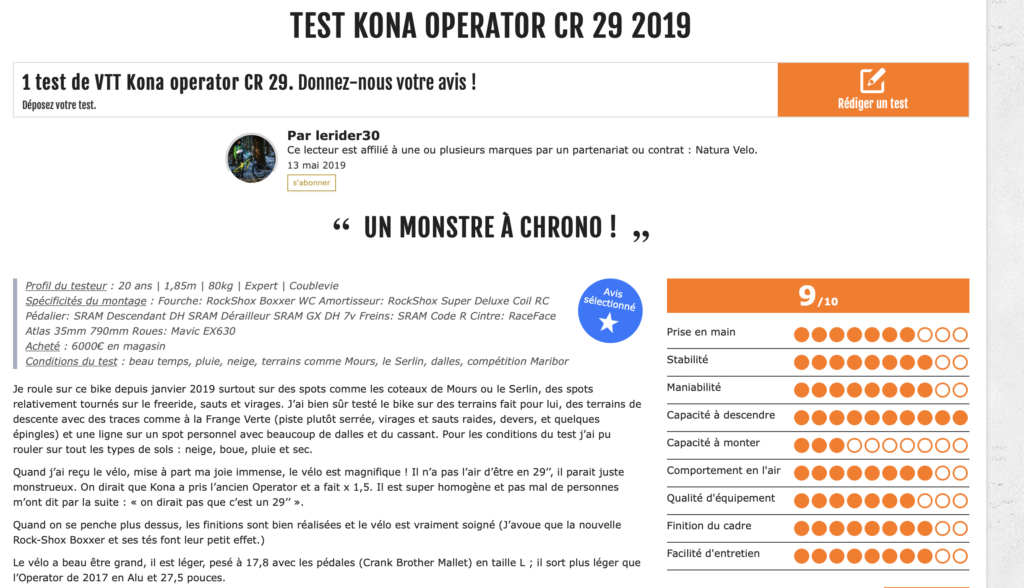 The french website www.26in.fr has reviewed our Operator CR. The originality of their test is that they are made directly by the consumer ! They gave it a rating of 9 out of 10 and loved how fast, precise, agile and stable our downhill weapon is.