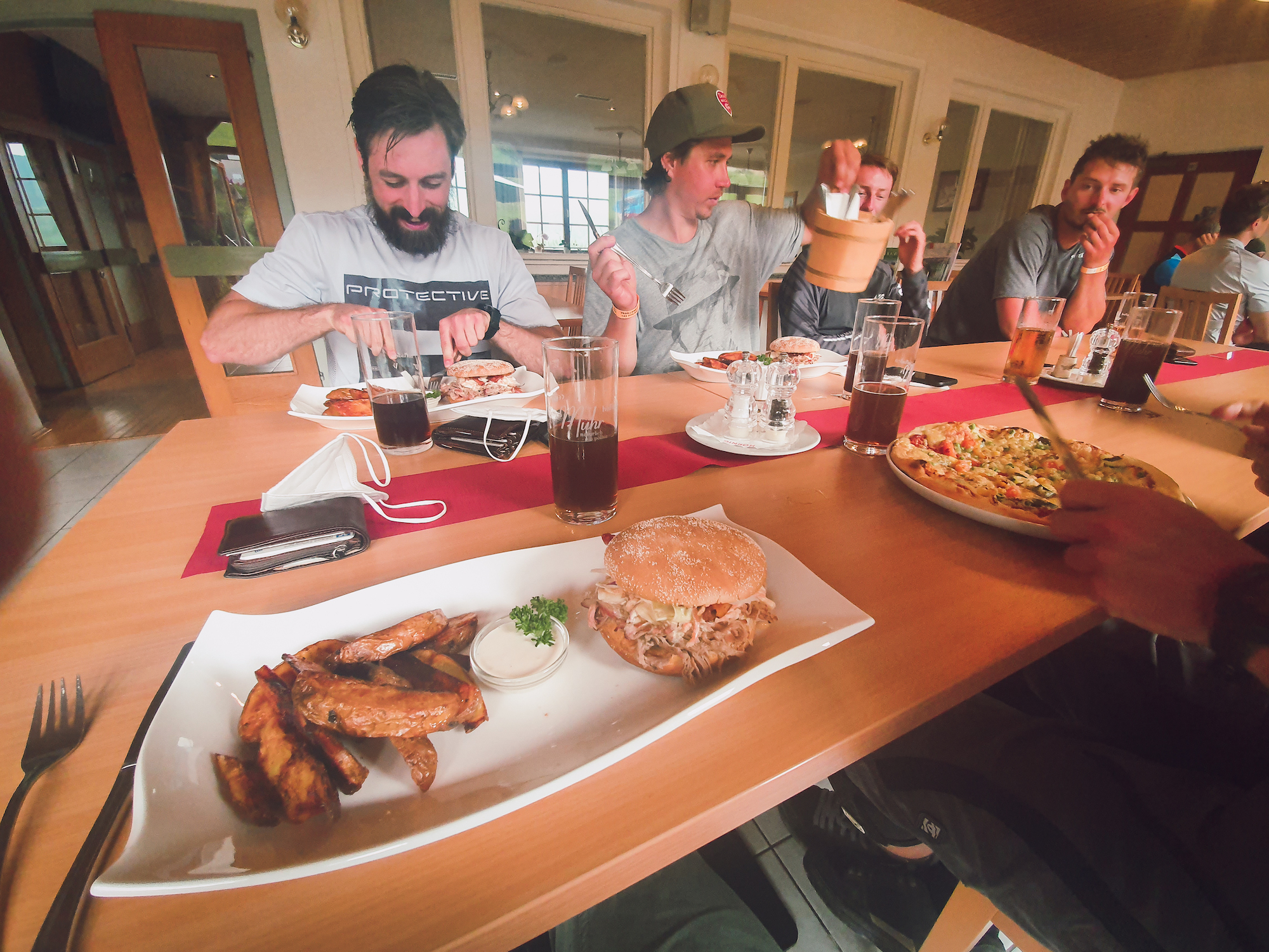 After a nice morning on the bikes a thunderstorm came down and we stopped riding. The restaurant next to the park served us with some tasty burgers and pizza and we celebrated our first successful bike trip in 2021.