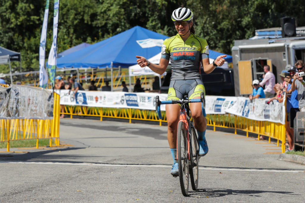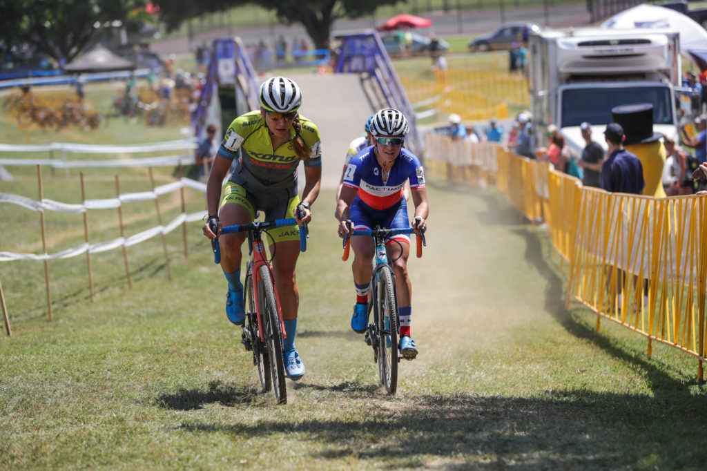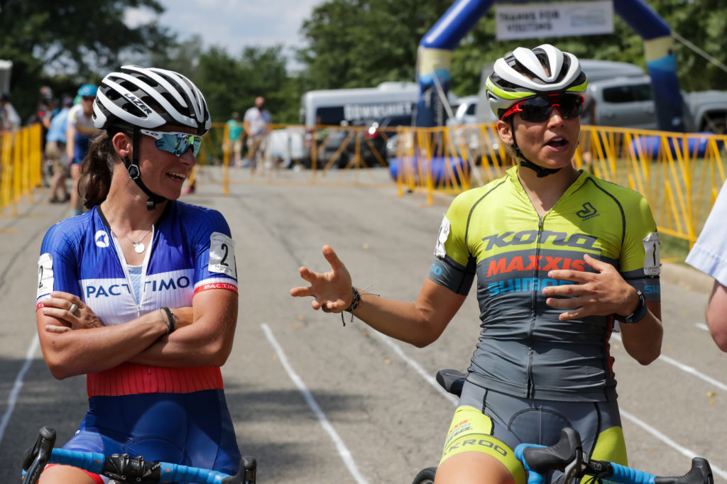 Caroline Mani had the best start, but mine wasn’t too bad – I even took myself off guard. Finding myself in the front group not having to pass anyone, I took advantage and went straight to the front. Pretty soon into the first lap it was just a group of three of us, myself, Caroline Mani, and Sunny Gilbert. Throughout the second lap or so Caroline was trying to coach her teammate towards the front of the group. When Caroline said “go Sunny” I said “no sunny”. I would like to think that it was my verbal deterrent that gapped Sunny from the two of us. She was clearly intimidated. With Sunny out of the picture, it was just Caroline and I battling at the front. We exchanged leads multiple times. I had to convince myself that I can’t let her out of my sight, I started to drift back once, but I reminded myself that Caroline doesn’t fade, Caroline doesn’t crash. If I wanted to stay in the race, I would need to keep myself in it. After getting dropped off a little bit, I rallied and chased back on.