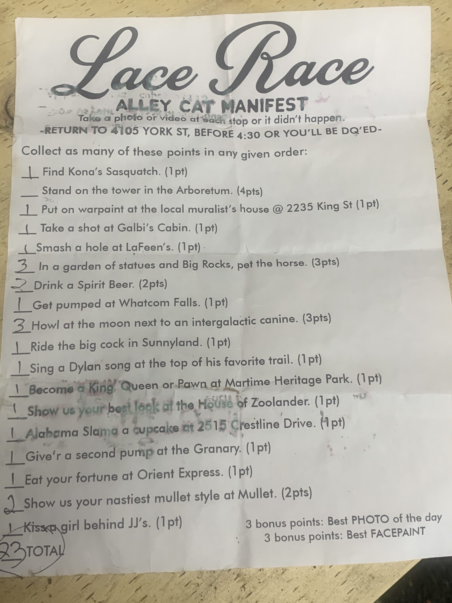 The checkpoints encompassed a large portion of our local moutain bike trails on Galbraith as well as a bunch of urban riding, so bike choice was also key. Would you choose to ride a gravel bike and skip some of the more technical singetrack? Or would you choose your enduro sled and slog a bit slower through the streets? Also, no ebikes were allowed in this one. All human-powered (and beer powered), all day! We also added in bonus points for the team that turned in the best photo or video of the day and the team that had the best face painting of the day,