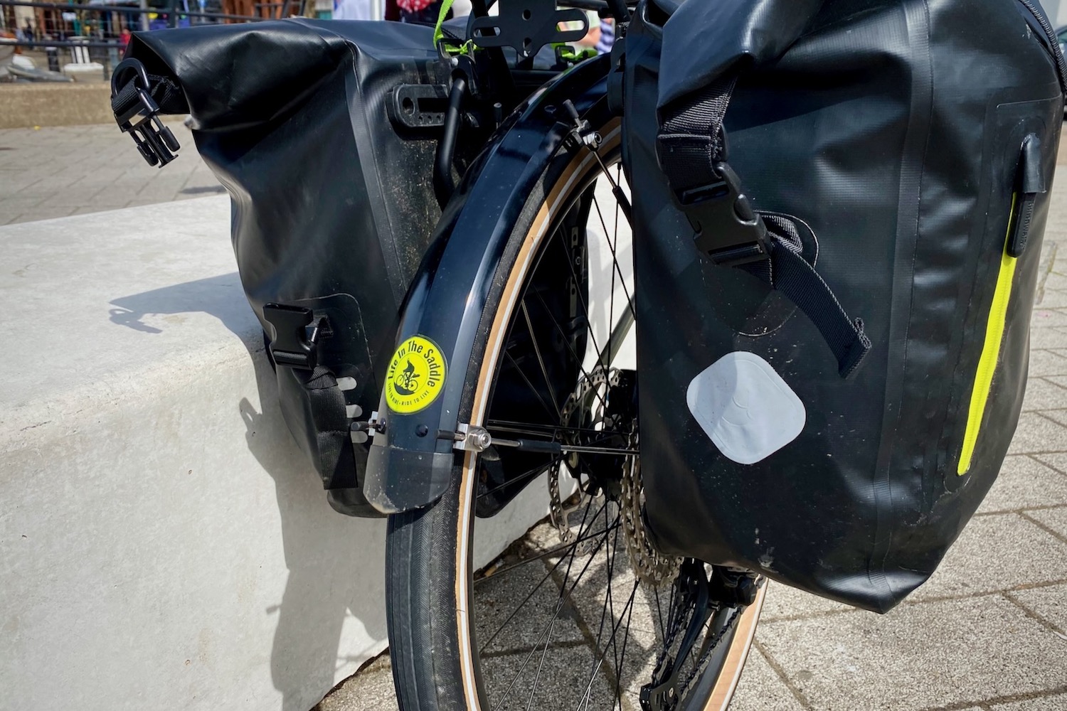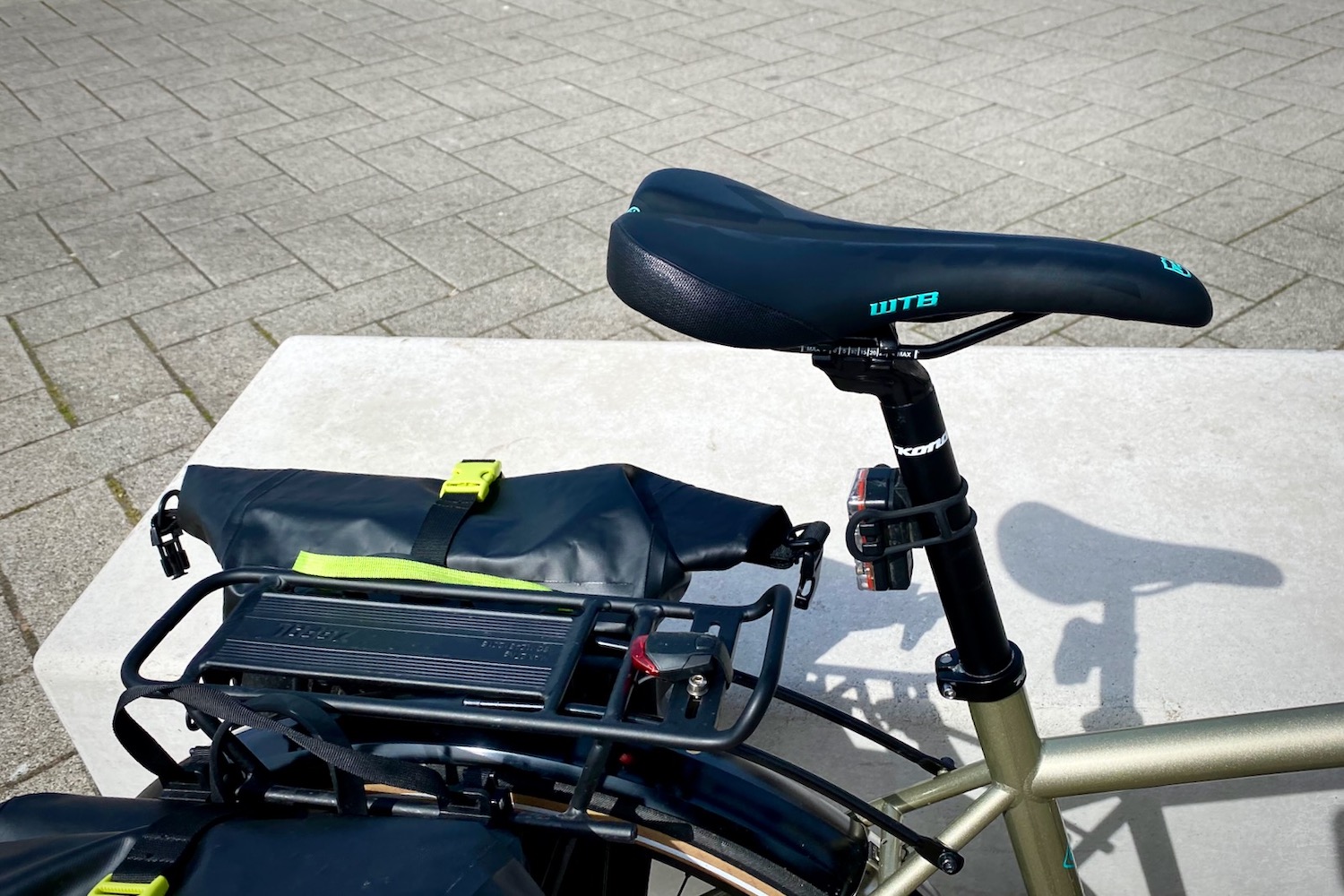 I have fitted my Kona Dr Dew with a rear rack and panniers for extra load-lugging capabilities, as well as daytime running lights for added safety.