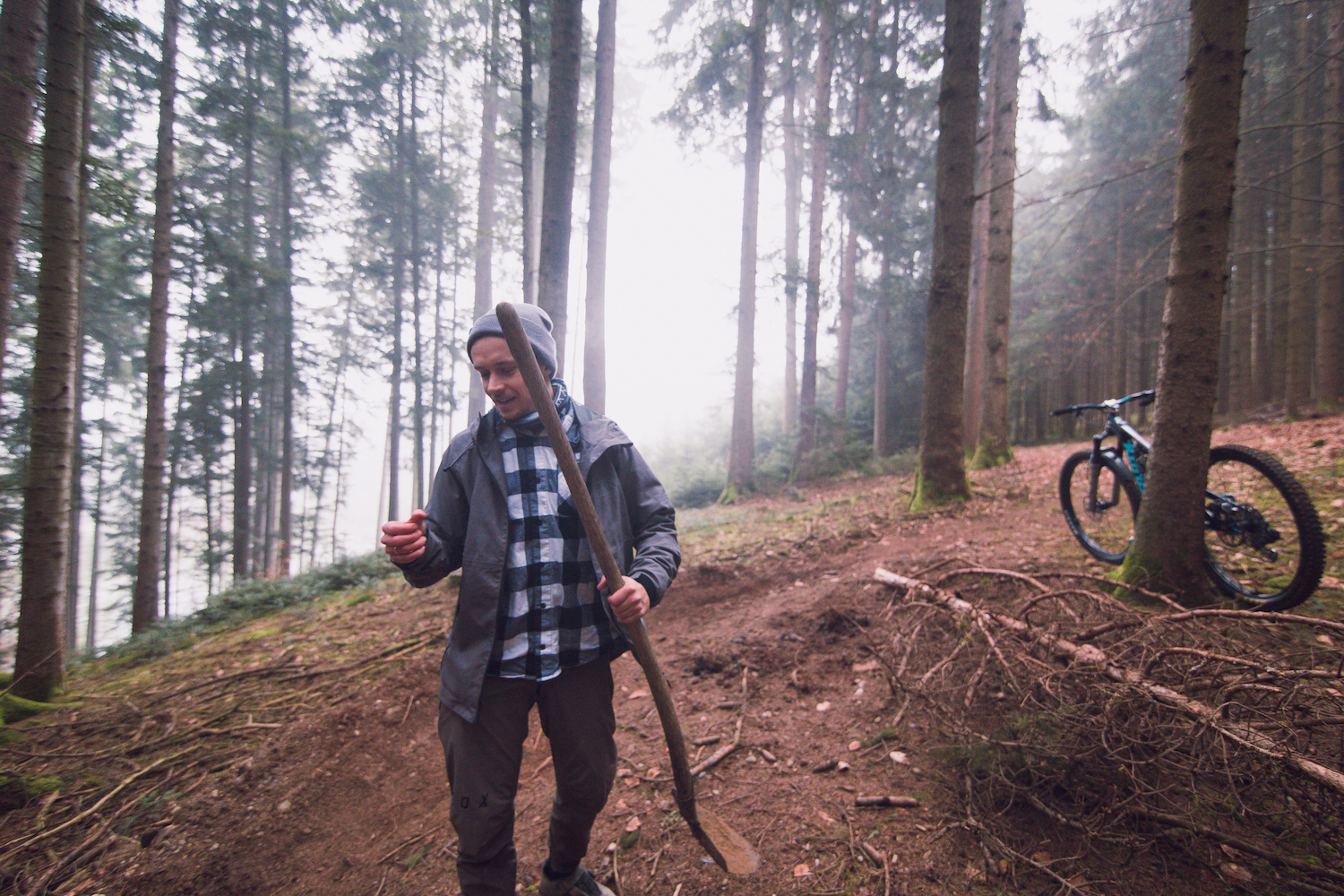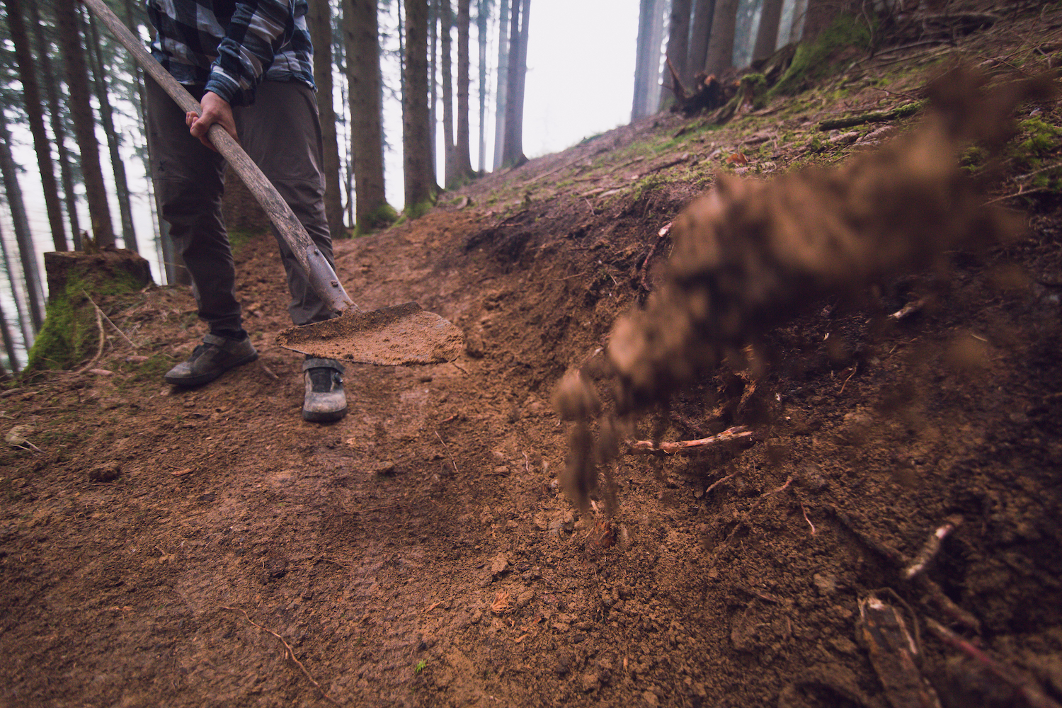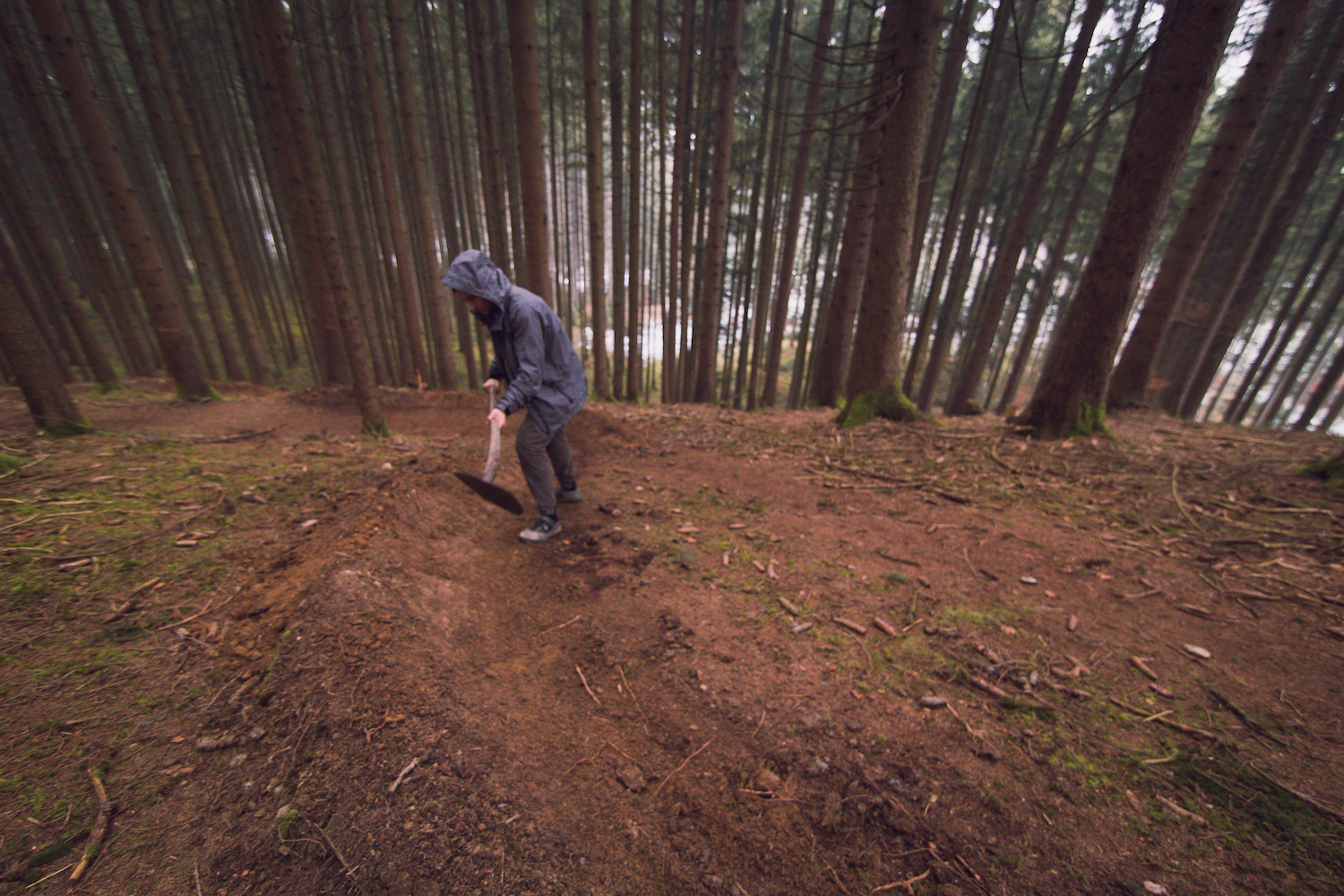 I found this spot last season while strolling around in my local forests. There were some tire tracks and implied shovel marks back then. I returned there until I found the landowner—a mountain biker himself, who left the traces. He kindly gave me permission to extend the spot on his property and to continue digging. Since then, my plan has been to create a *winter riding spot.*
