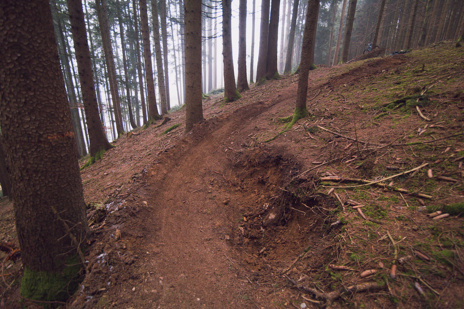 After months of wet and muddy digging sessions, some weeks off and on due to darkness after work, Christmas days and so on it was finally time to bring out the camera for the first real riding session there. The spot is located low enough not to be snow-covered right now. The recent mostly wet and muddy berms were completely frozen. The ground was hard and grippy like asphalt. It rolled faster than ever. I already had to revise some sections immediately because of the speed gain. Every time I rolled through I found a small spot where I could change something, or do some work to make the trail ride and flow better.