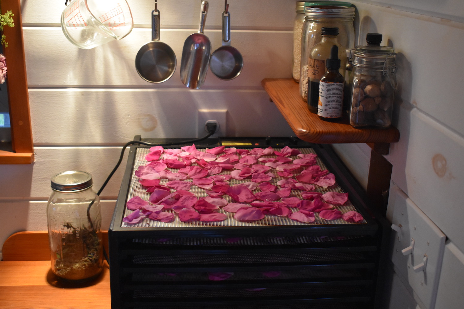 - Dry the rose petals and the mint. You can do this in a solar or electric dehydrator. Or you can just lay or hang the plants in a warm, dark, dry place with plenty of airflow.
