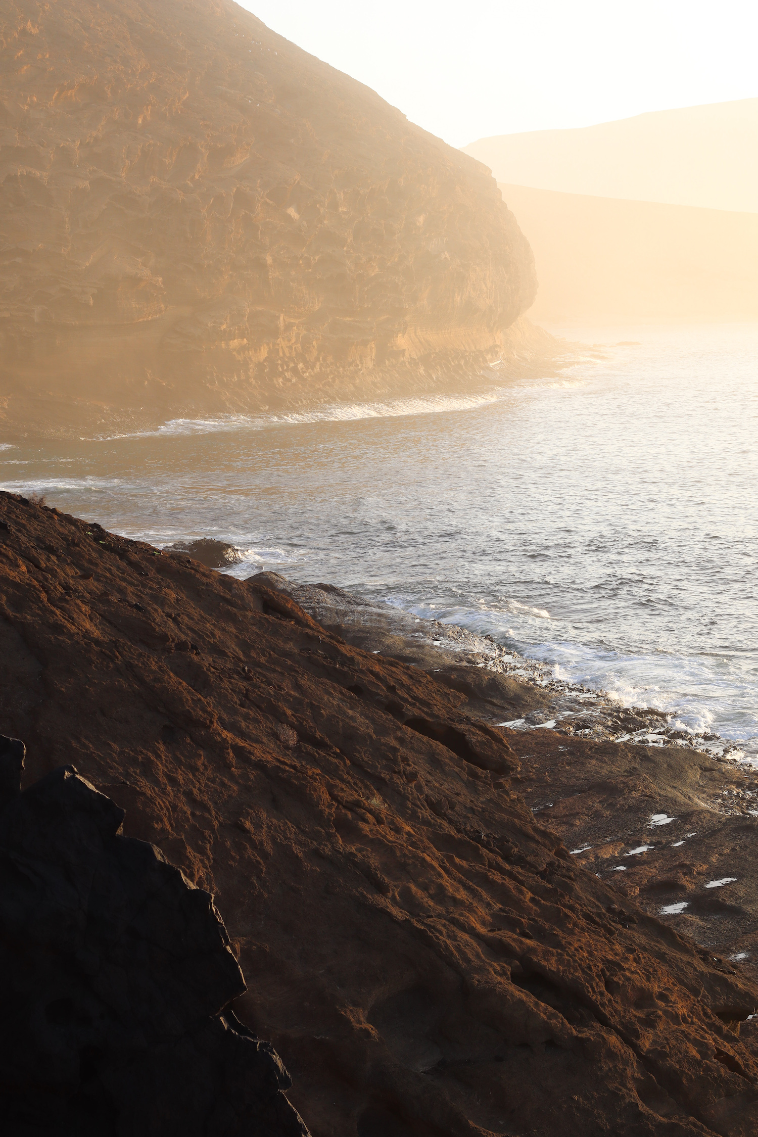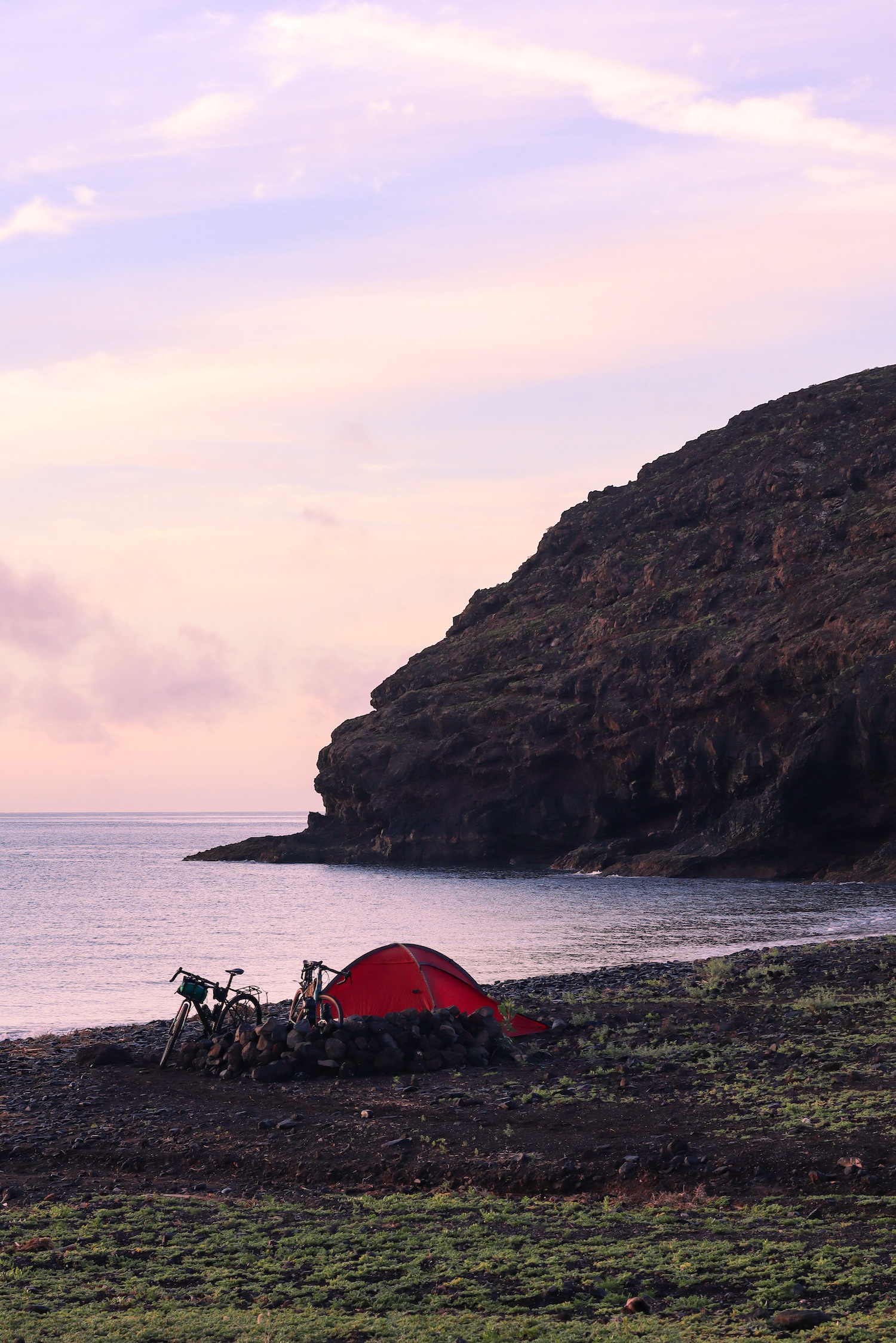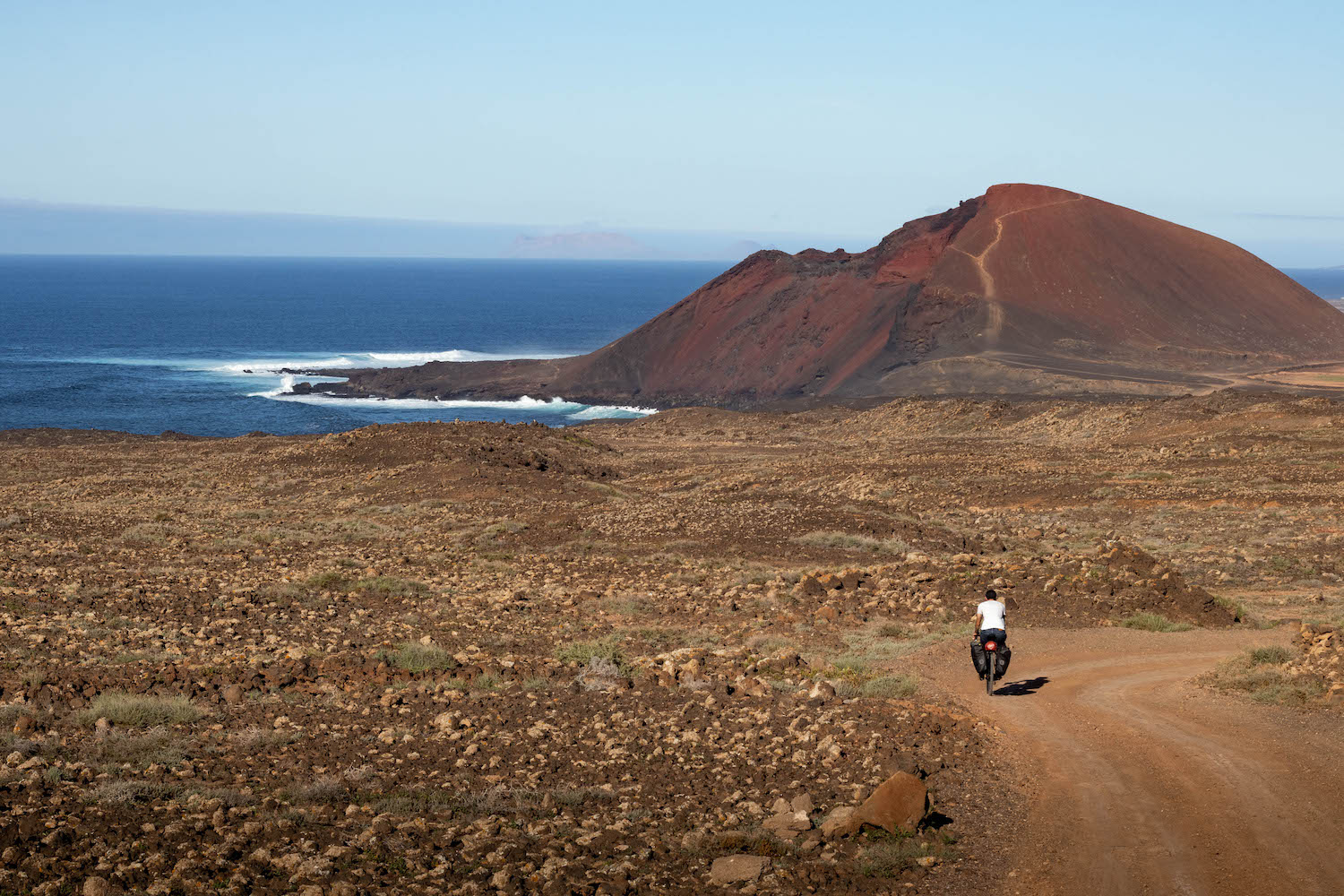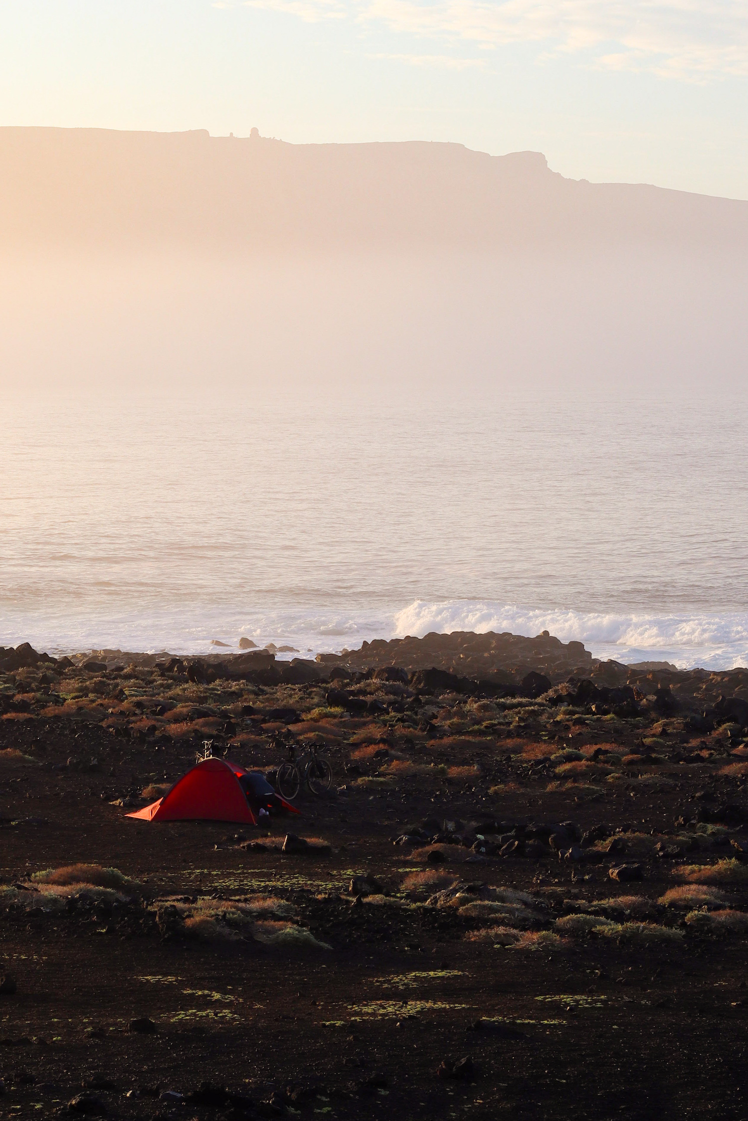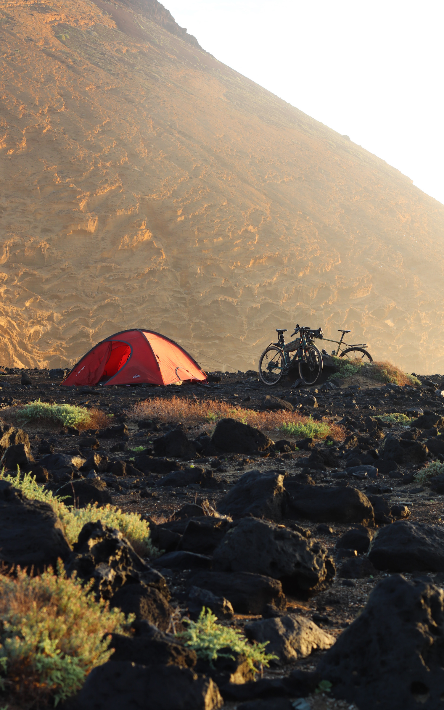 Riding there was one of the most beautiful experiences I’ve had traveling by bike. A few kilometers later, we were immersed in the Timanfaya and Volcanoes National Park. Departing a bit from conventional routes, we found some paths that, although they made the journey longer, and sometimes led us to be exhausted, made it more fun and enriching. We were practically alone, we were looking for that solitude a bit, and we were in no hurry to get anywhere. We would stop when we wanted to have a coffee or explore something on foot, and we would sleep where we thought was a good place to pitch the tent. That day we cycled to Famara after leaving Timanfaya, through a mixture of paths made of beach sand and volcanic gravel. Famara is famous for its huge beach and the quality of its waves for surfers. It is a town with a lot of people, which receives a lot of tourism, but once again we decided to get away from the masses, exchange the restaurant for the gas stove and seek refuge at the end of the walk that continues where the beach ends, under the shelter of its huge cliffs that fall straight into the sea.