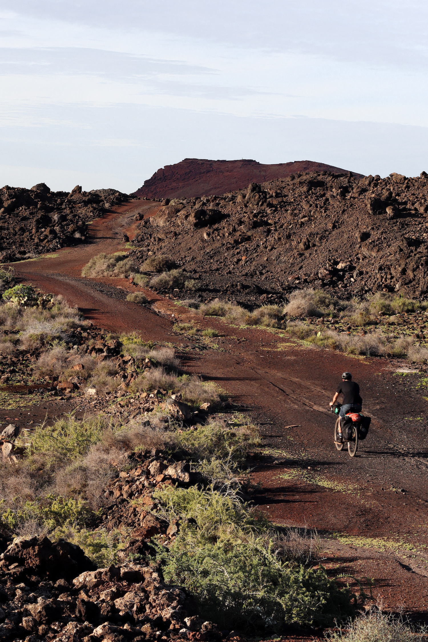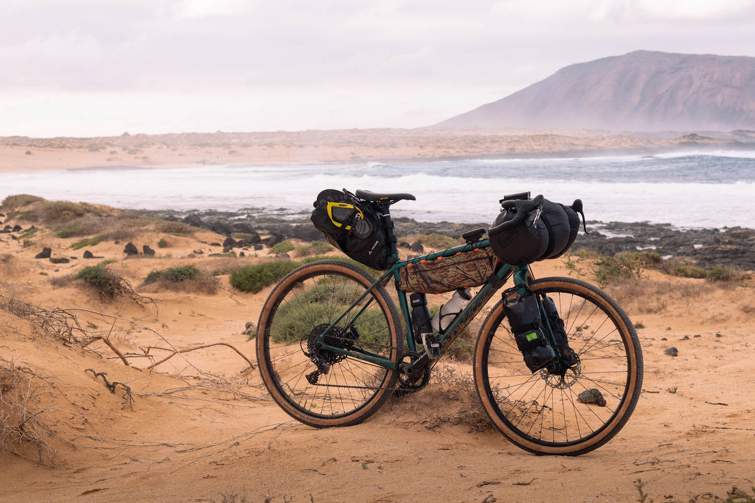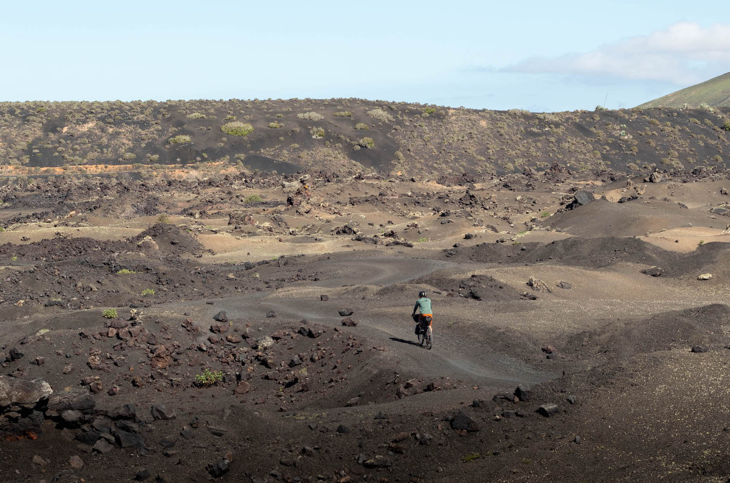 The sun completely illuminated us at dawn, showing us that we had chosen a great place to spend the night and gave us an incredible awakening. What we didn’t know is that shortly after we started riding that morning, the path we were riding up a mountain disappeared due to a storm, and we ended up rolling through a dry riverbed until it became impossible and we had to hike the bikes with loads, for approximately two and a half kilometers. But as another good friend of mine often says, gravel and bikepacking is an adventure, and this was definitely part of the game. That day we covered the entire southwest and we entered the northern part of the island along paths where navigation, at some point, was quite complicated and entering the first lunar terrain that we crossed on the way to Yaiza. Once there, we began to see a landscape full of contrasts, which would be what awaited us in the next stage, full of unevenness, volcanic peaks, beaches, rivers of solidified lava and an endless number of paths that touched all of our senses.
