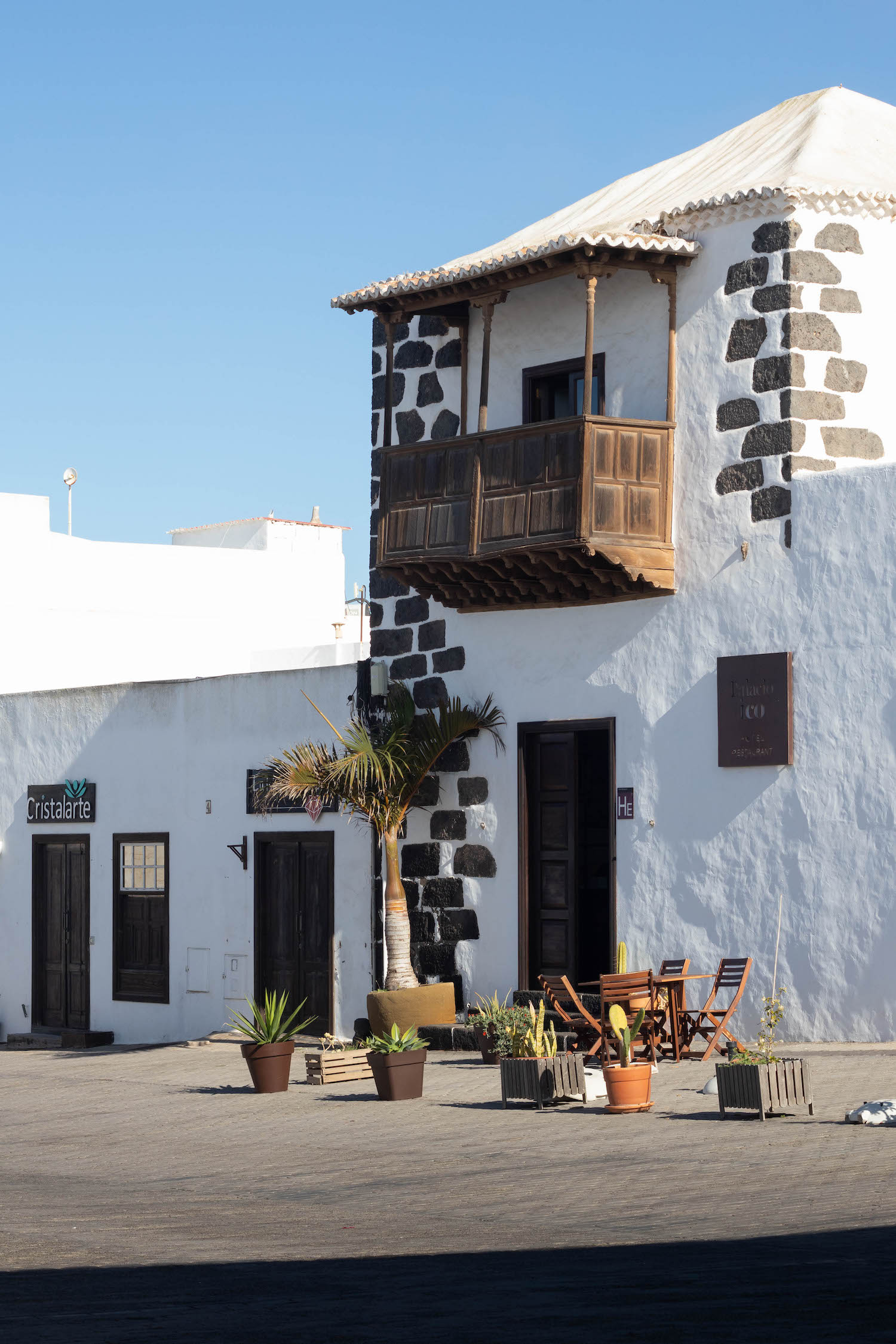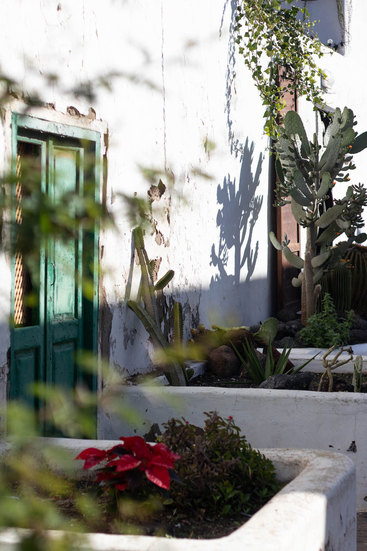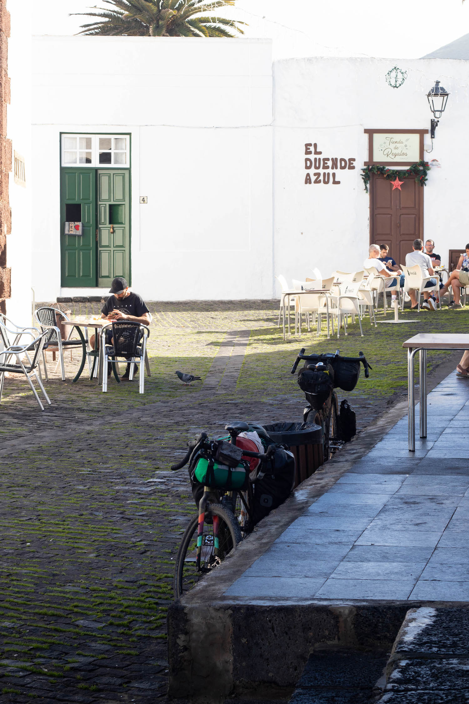 The next morning, we had a quick coffee in front of the waves and headed to Teguise along a zigzagging gravel road that also served as breakfast for our legs. Once in Teguise, we took a break to appreciate a real coffee and a good breakfast in one of the bars in the local square. Teguise is a town worth visiting. It has curious architecture, with white walls and an endless number of old doors painted mostly in green. It is a good place to take a walk through its streets and soak up a bit of the local culture.