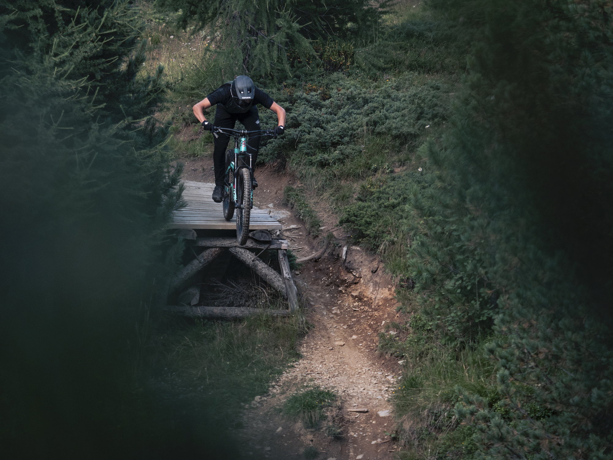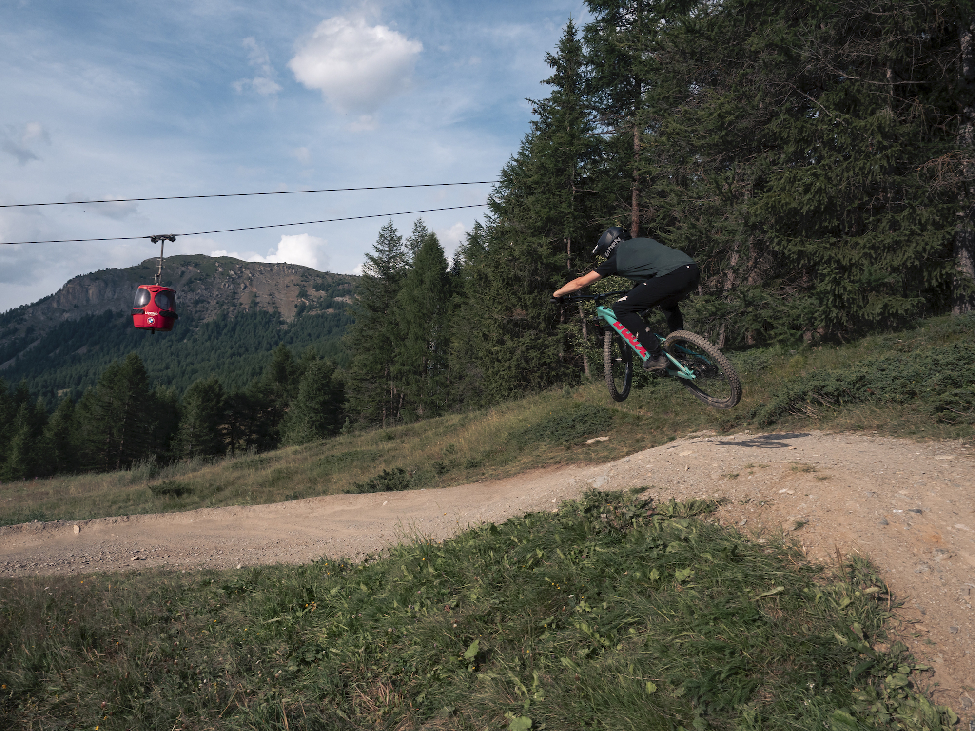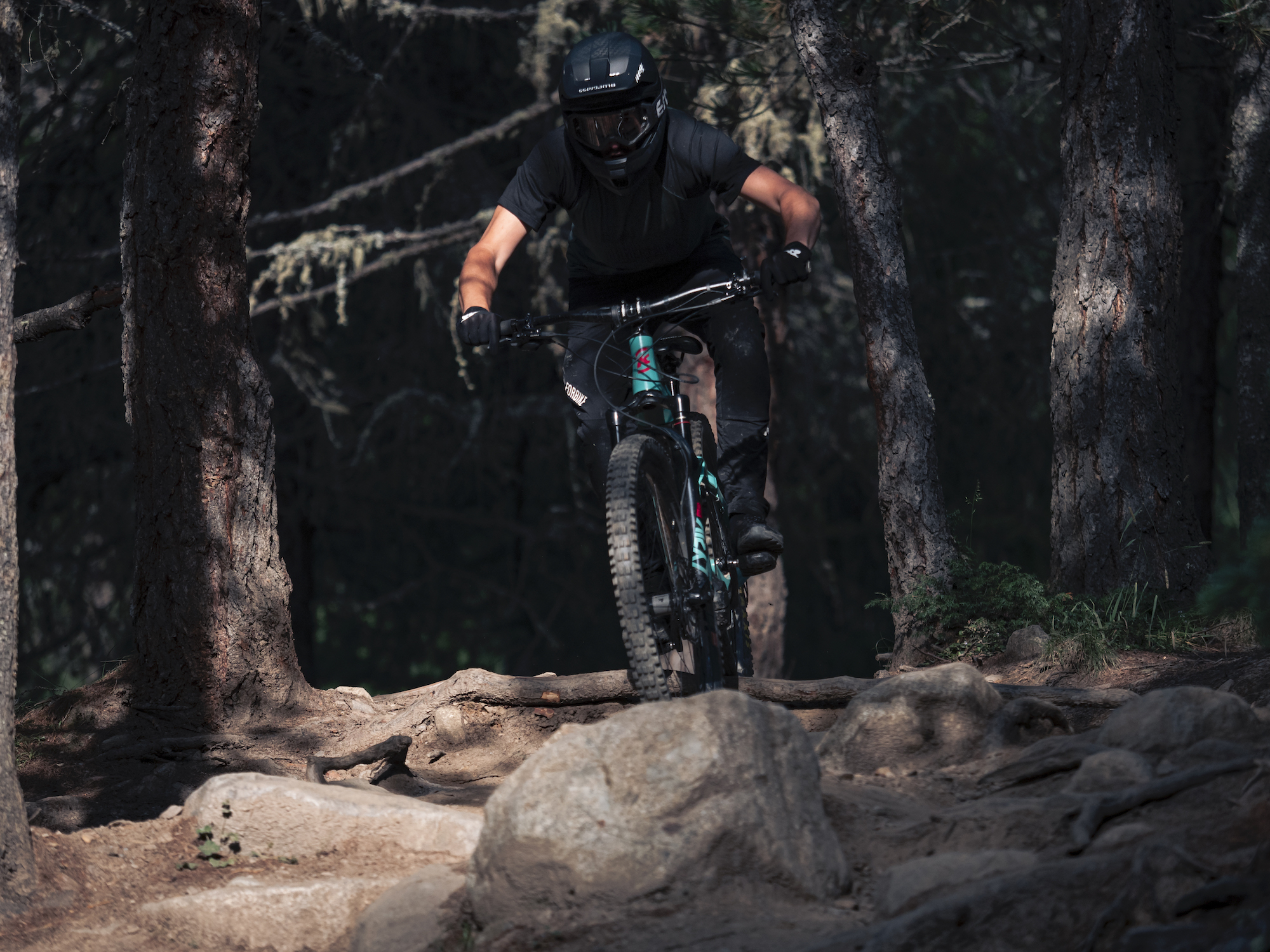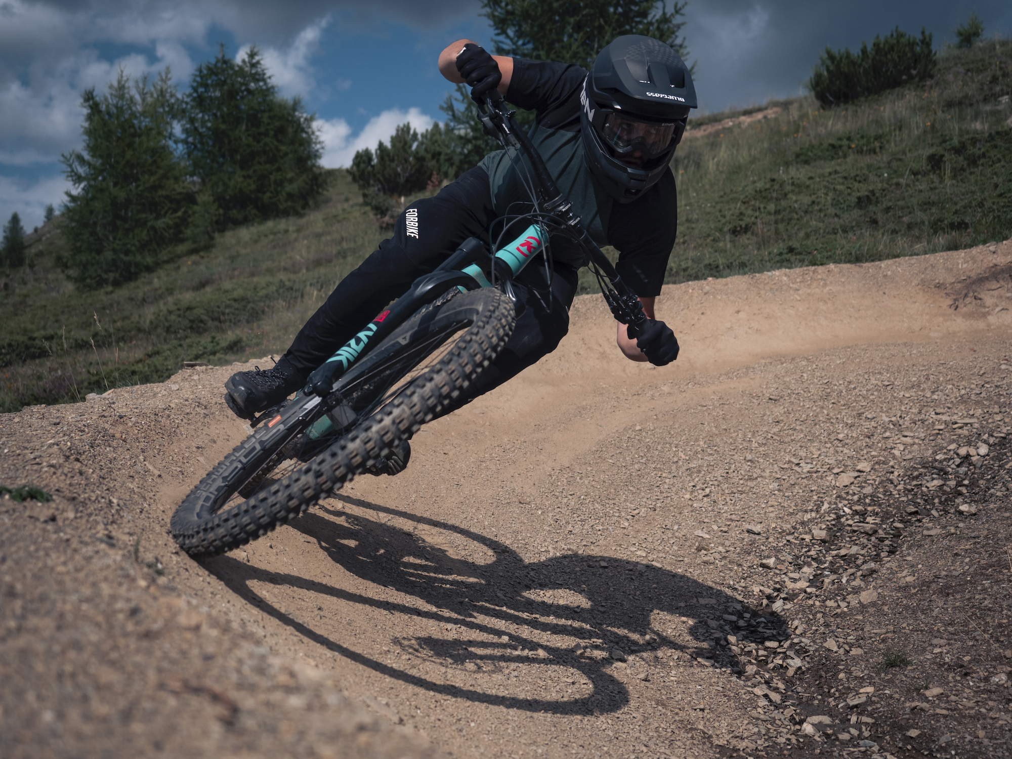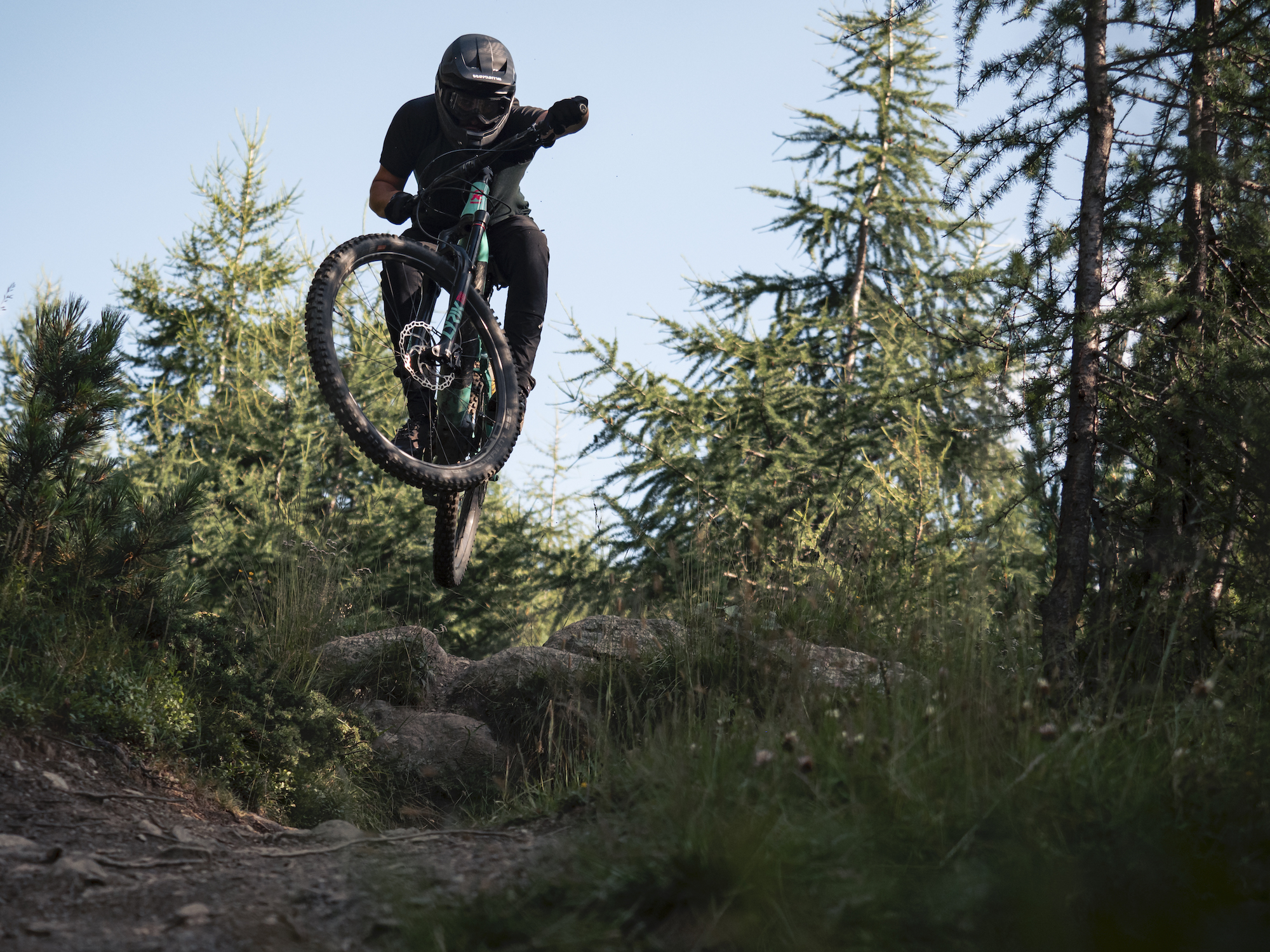 It takes flight on the jumps-tables our doubles. It stays manageable and plaful in the berms.