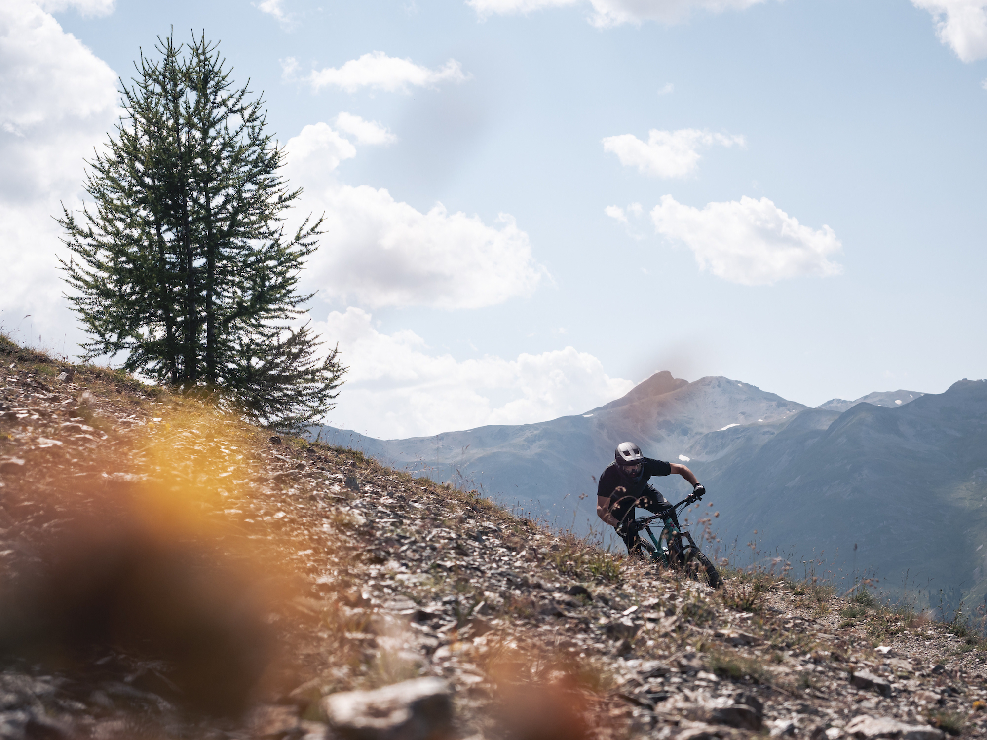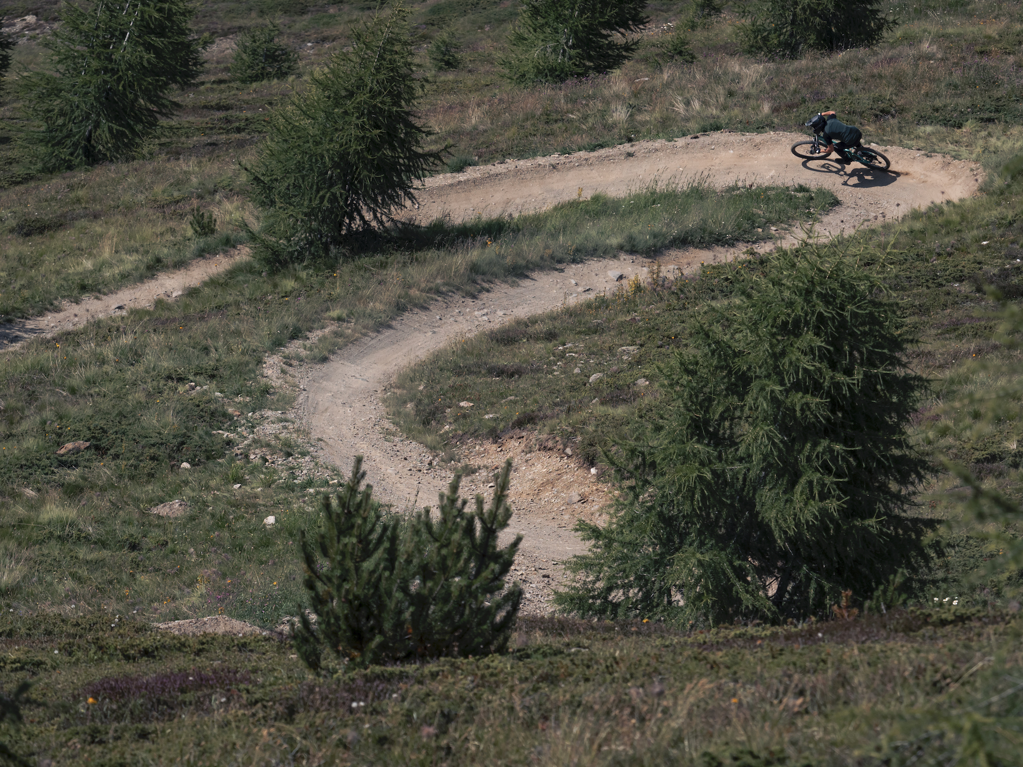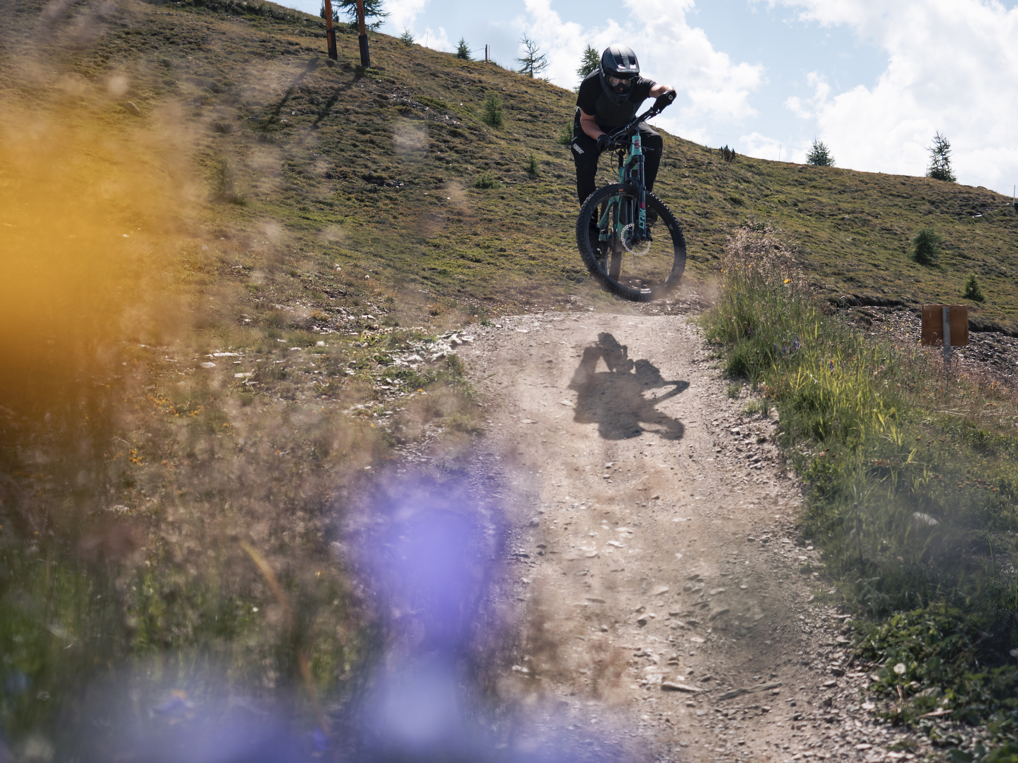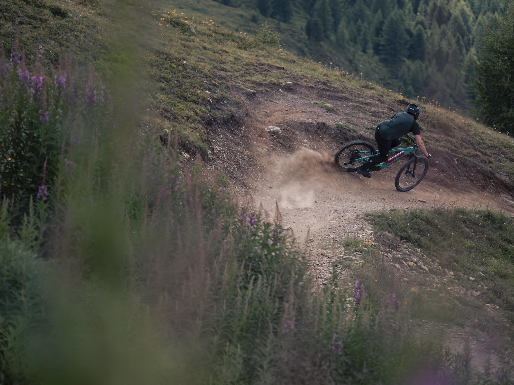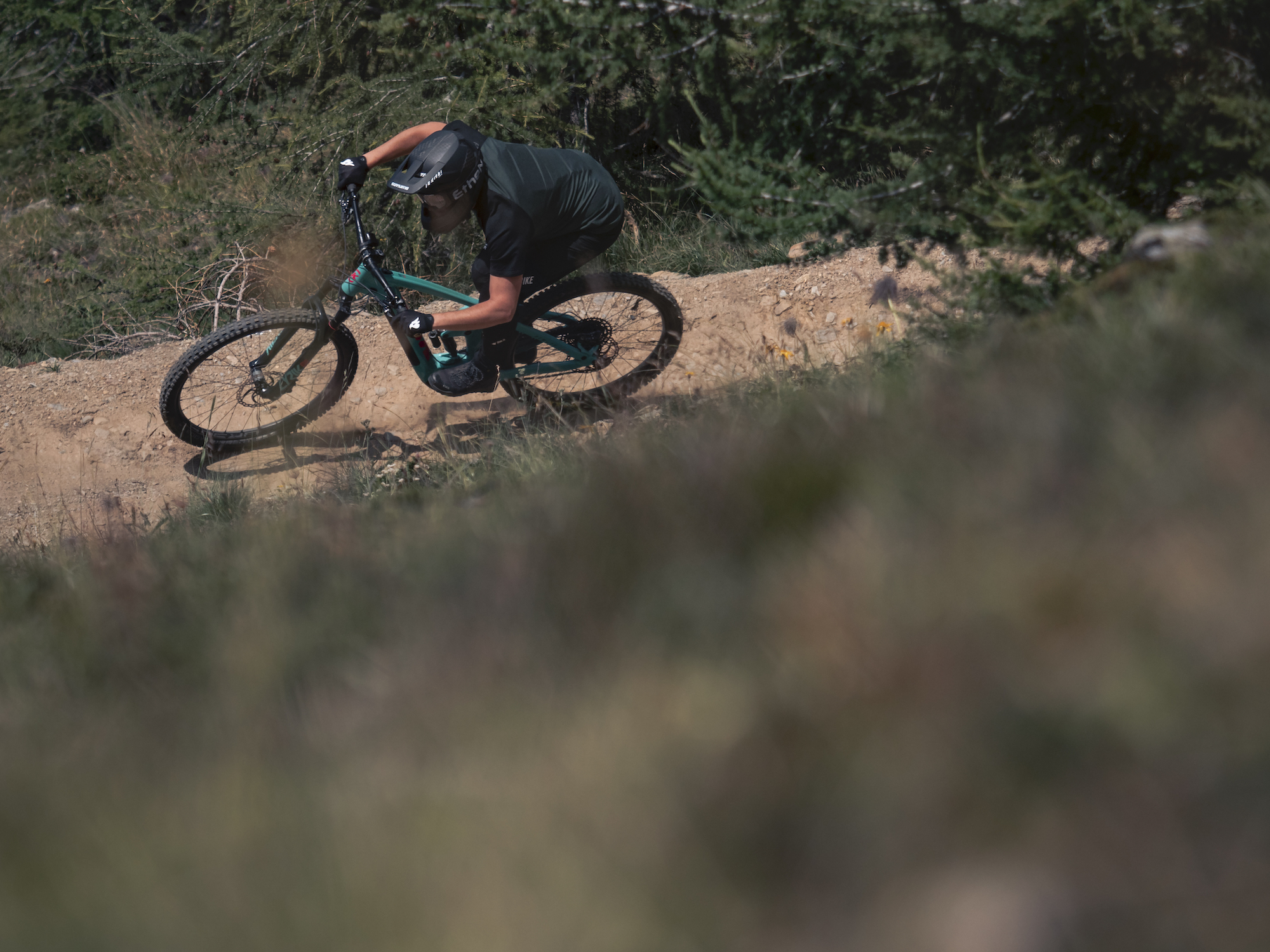 It takes flight on the jumps-tables our doubles. It stays manageable and plaful in the berms.