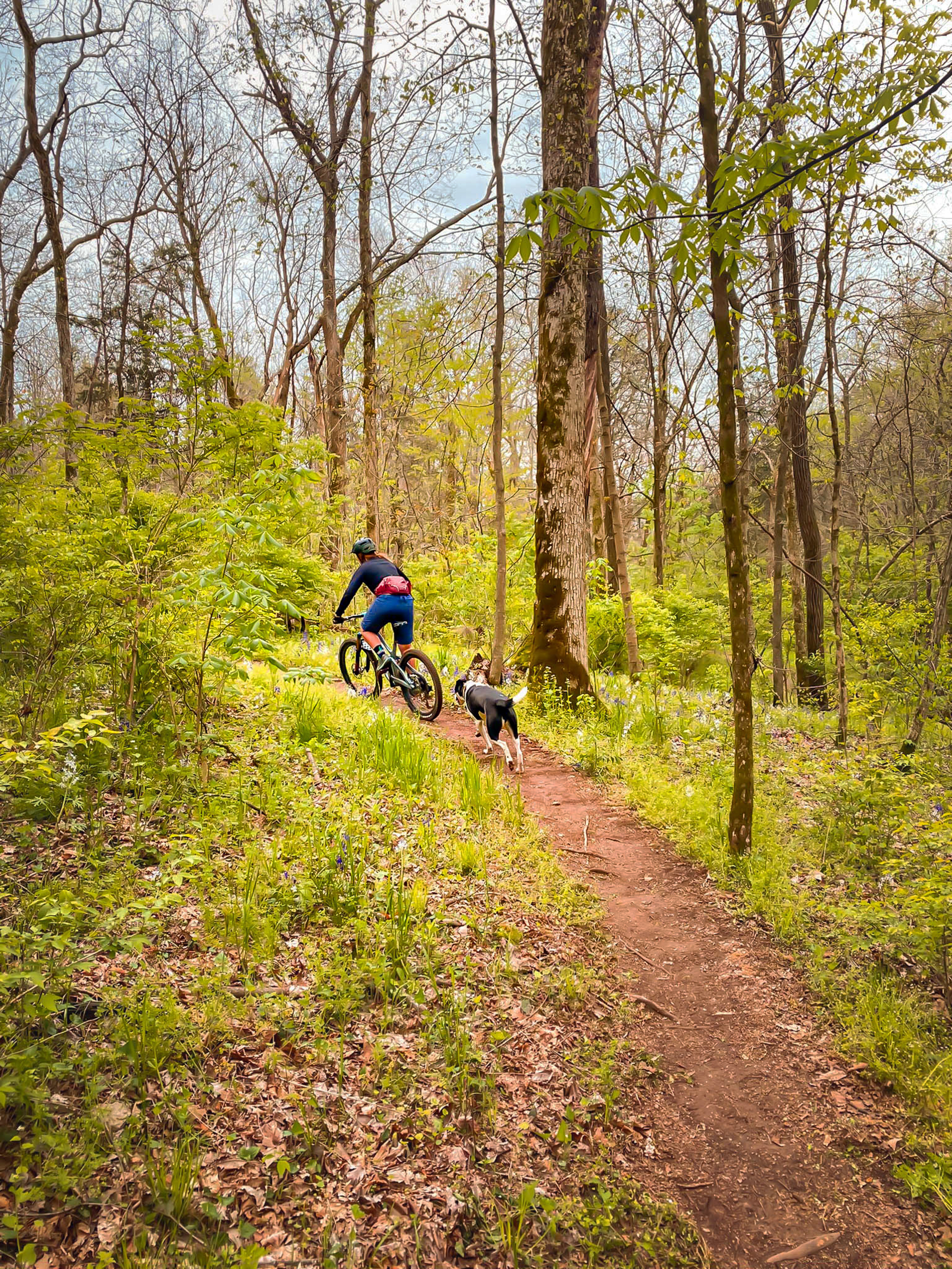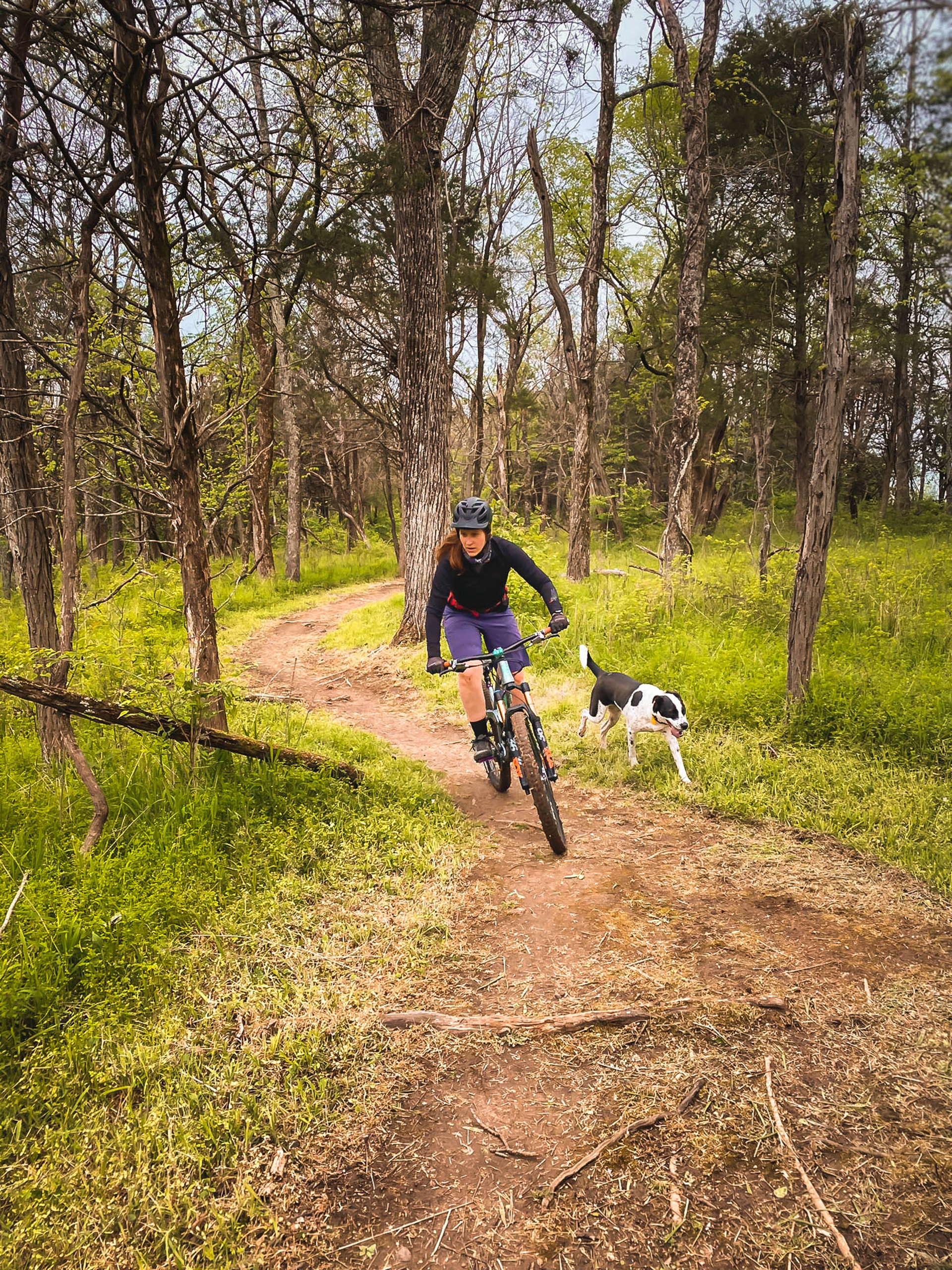 We adopted our spotty dog Stevie about a year and a half ago from a local animal shelter with the hope that she’d be able to spend time with us in the woods. Training a trail dog isn’t an overnight process and it took time, effort and teamwork to teach a puppy to stay close when there were so many wonderous smells and sights off trail. At the beginning, rides with Stevie were short with Kate and I constantly playing zone defense to keep her on trail and out of trouble, but she learned quickly and we discovered ways to set her up for success. Since then, afternoons spent chasing her through the brush and working to keep her out of filthy ponds have morphed into longer rides with a few breaks for her to grab a drink and sniff until her heart’s content. She still loves exploring and will occasionally bolt after a critter or splash around in a creek, but she is quick to lock on to the sound of a whizzing freehub and will drop into her spot between the two of us, tail and tongue wagging. After a year of regular practice, she recognizes the signs that we’re gearing up for a ride, and if we don’t take her along, will aggressively throw shade at us for days.