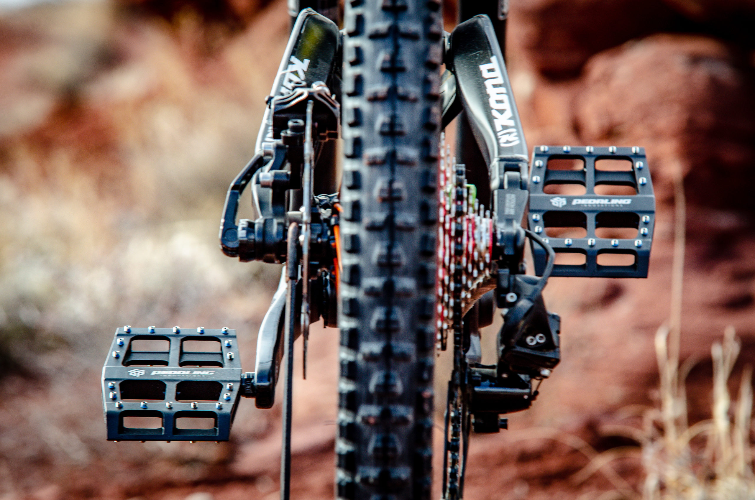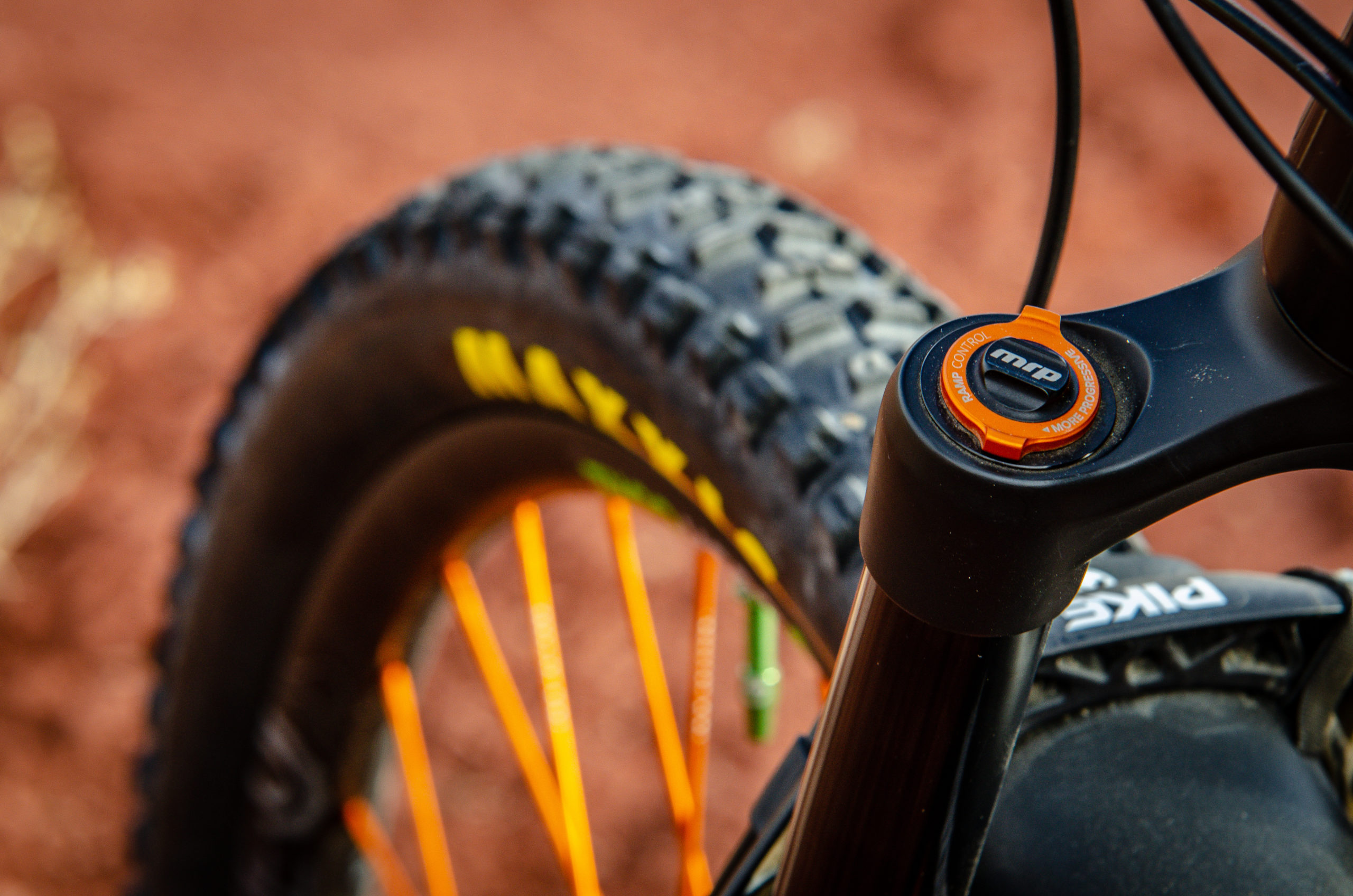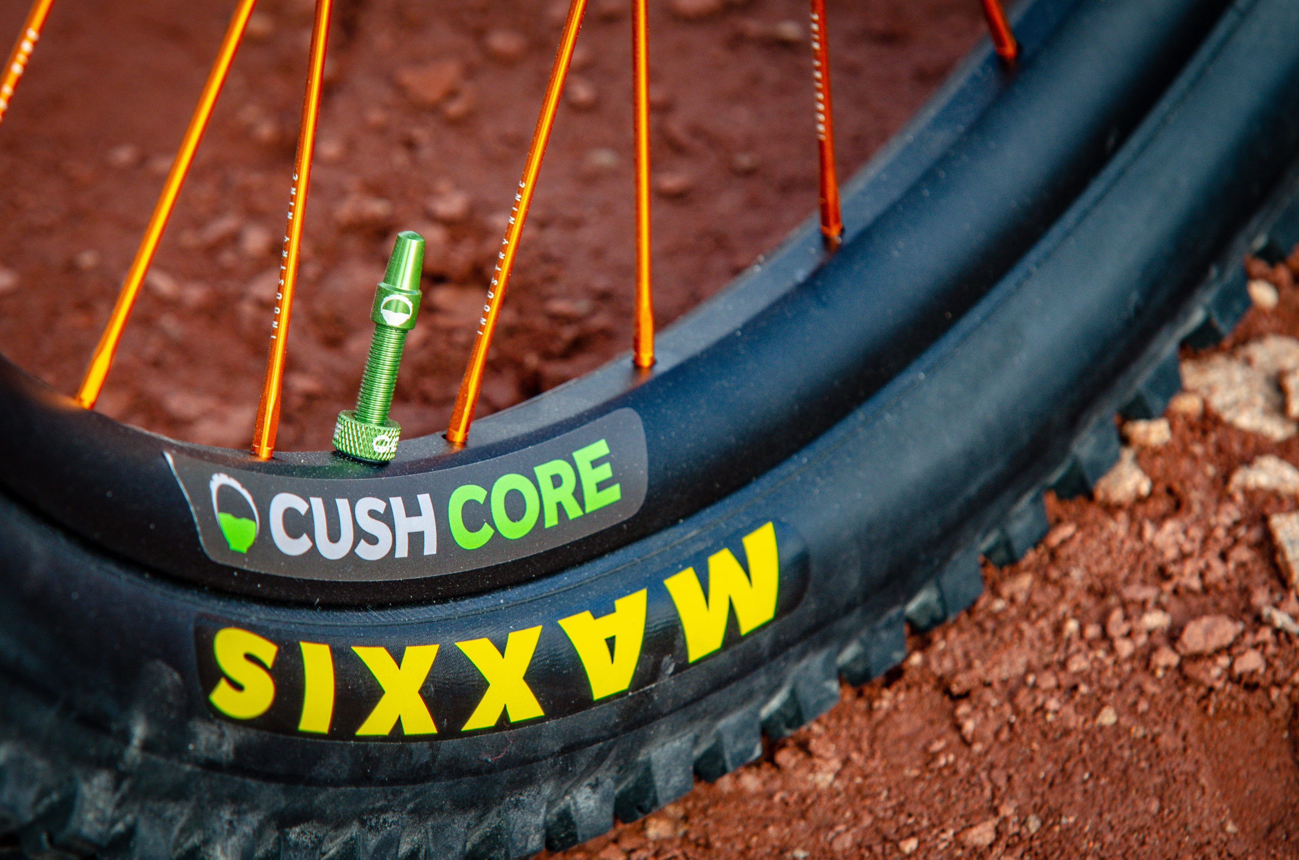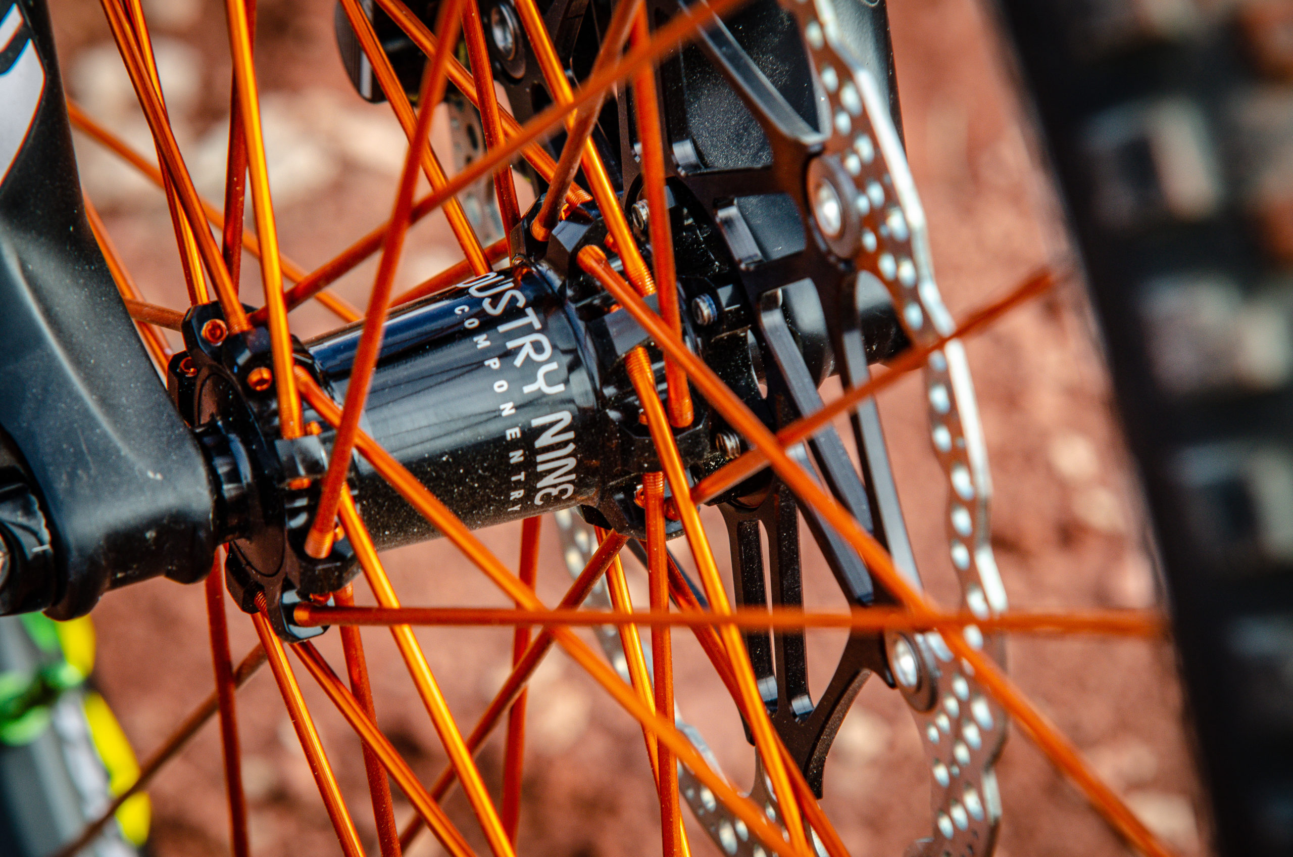 Topping the list for parts are my Grade 300’s from Industry Nine. I’ve ran their Enduro 27.5 wheels on my trail bike for nearly 6 years now and they are still phenomenal performing wheels. Plus, those spokes! Inside the Maxxis High Roller in back and the Minion DHR up front you’ll find CushCore tire inserts, because I like to ride stupid lines and eat pizza.