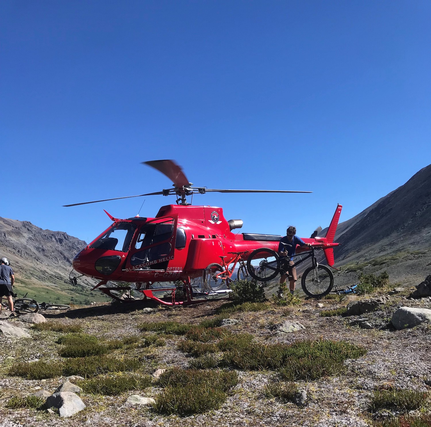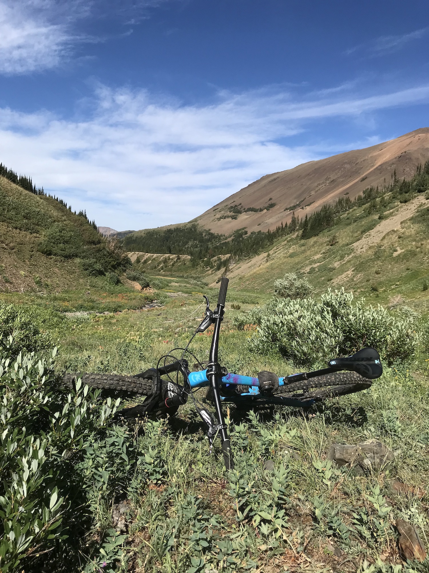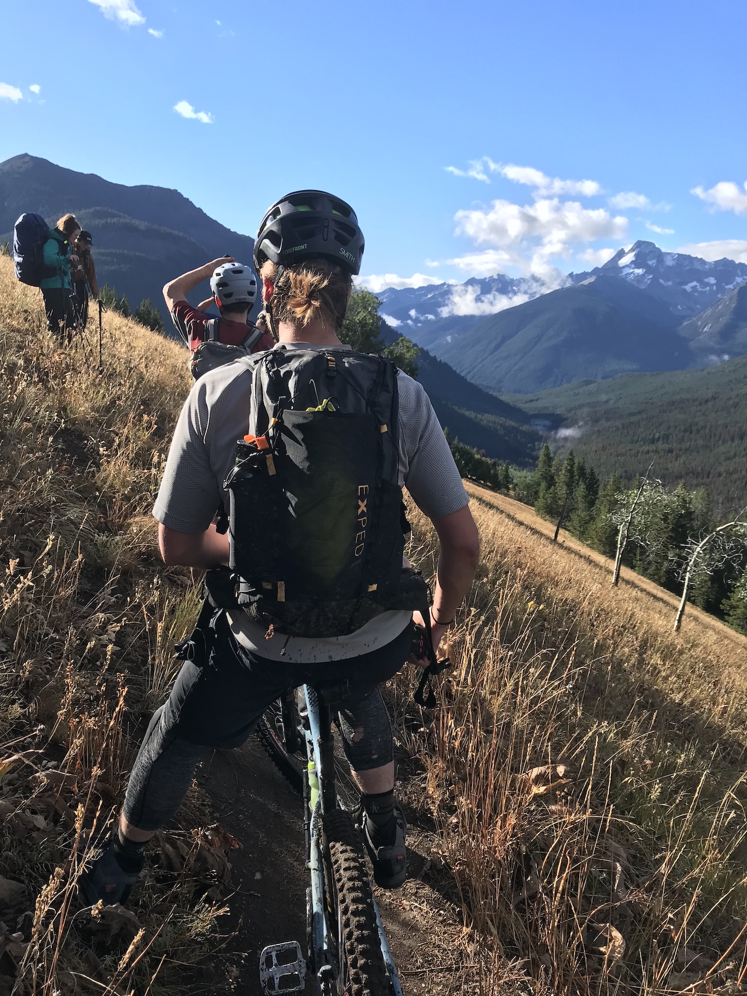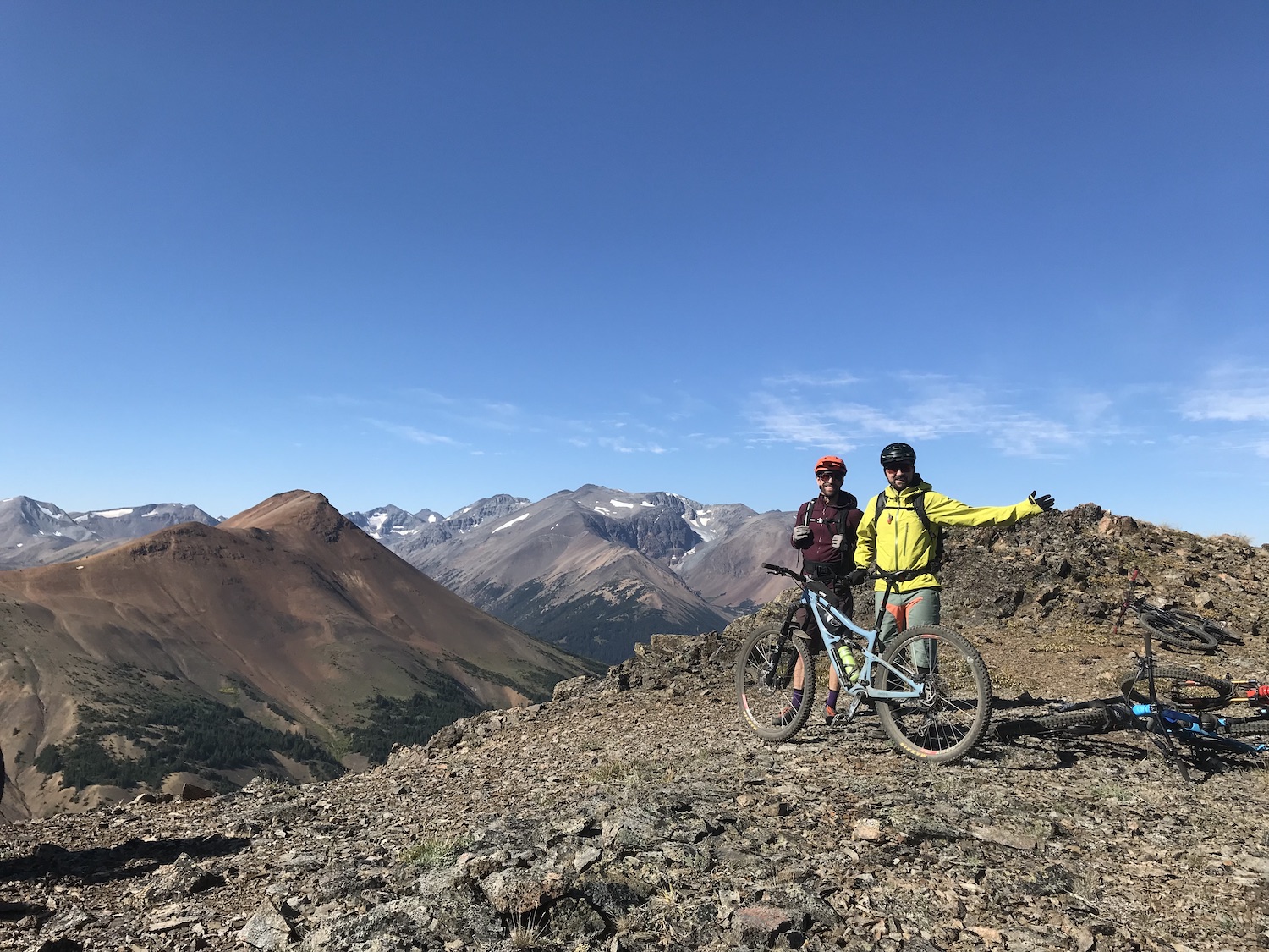 Day two would be a loop that would take us back to Bear Paw so we were able to ride with lighter packs than the first day. We headed out the Manson Creek trail and made it out to Relay Col in order to take a look at a possible long loop called Manson Castle but it was decided that this would be too much for us and we were happy with this decision when we found out later about the number of downed trees on one section of this trail. We did still have a couple of exciting things happen when our guide Nate had the heli swap a different bike for him at Relay Col since his brakes weren’t working. The heli happened to be flying in the area so was able to drop his bike while we were having lunch! Also we saw a mother grizzly bear with two cubs on the way back from Relay Col to Manson Col which was a little scary at first but she immediately turned and headed in the opposite direction and we kept a safe distance getting back to Manson Col. Once there we took the typical route that is done on day two which is to descend down the Little Paradise Valley and then up and over to the Little Graveyard Creek trail. Both of these have steep and fun descents before climbing at the bottom. My choice to bring the Process 134 paid off with these fun descents as it felt the best going down but made the climbing much easier than if I had been on a bigger bike. From the end of Little Graveyard Creek trail we ended back in Graveyard Valley and headed back up to Elbow Pass to descend back to Bear Paw camp which was a fun repeat from the day before.