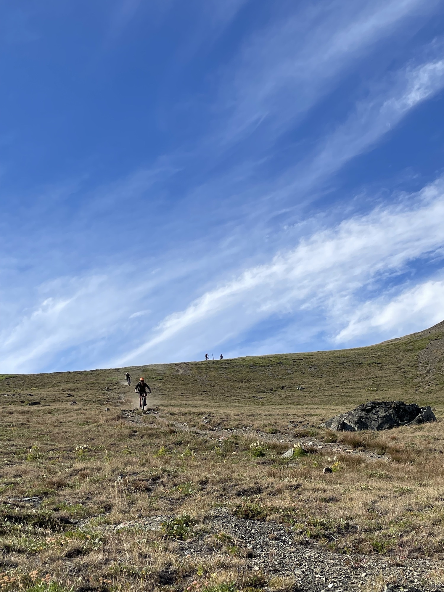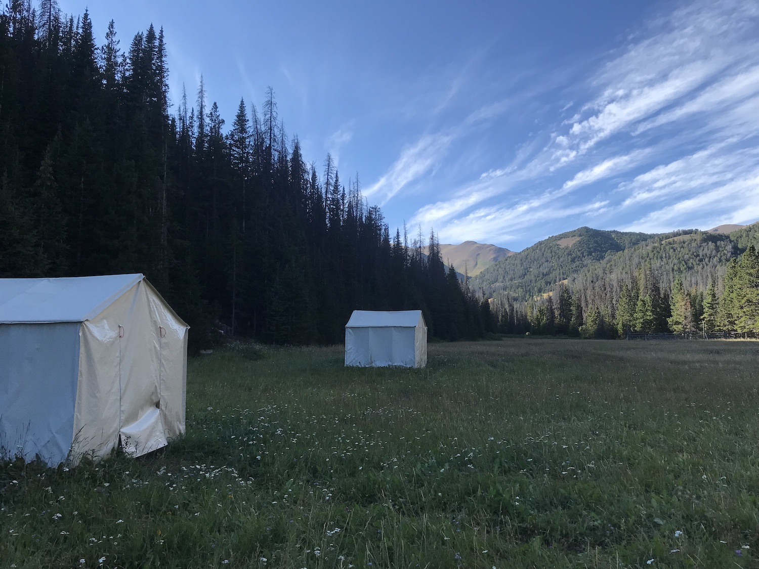 The ride on day one took us through the Big Creek Valley and over to the Graveyard Valley which is named for the marked and unmarked graves of ancient warriors in the tribes of this region. The views in both of the valleys are gorgeous and the riding was flowy with a moderate amount of climbing in between the descents. At the end of the Graveyard Valley is a long climb up to Elbow Pass before a long and fast descent to the Tyax Bear Paw camp where we were greeted with appetizers, a tasty dinner, and a warm fire before getting to sleep in the canvas tents that are set up for guests and guides.