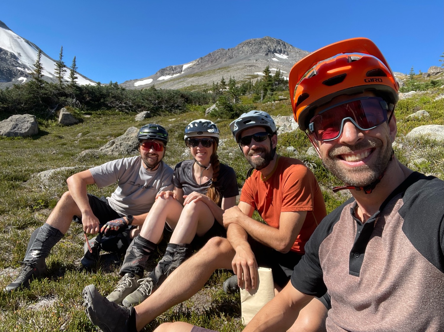 After a 3 year forced break from riding bikes in Canada due to the pandemic I was very happy to get back to this side of the border for a 4-day, 3-night heli accessed and guided/catered trip in the South Chilcotins with Tyax Adventures. My husband Jackson and I had done a similar trip in 2019 so we knew we were in for a treat especially when we saw some sunny days in the forecast leading up to the trip. We joined our friends Adam and Eric for this trip and lucked out with a great guide Nate for this adventure.