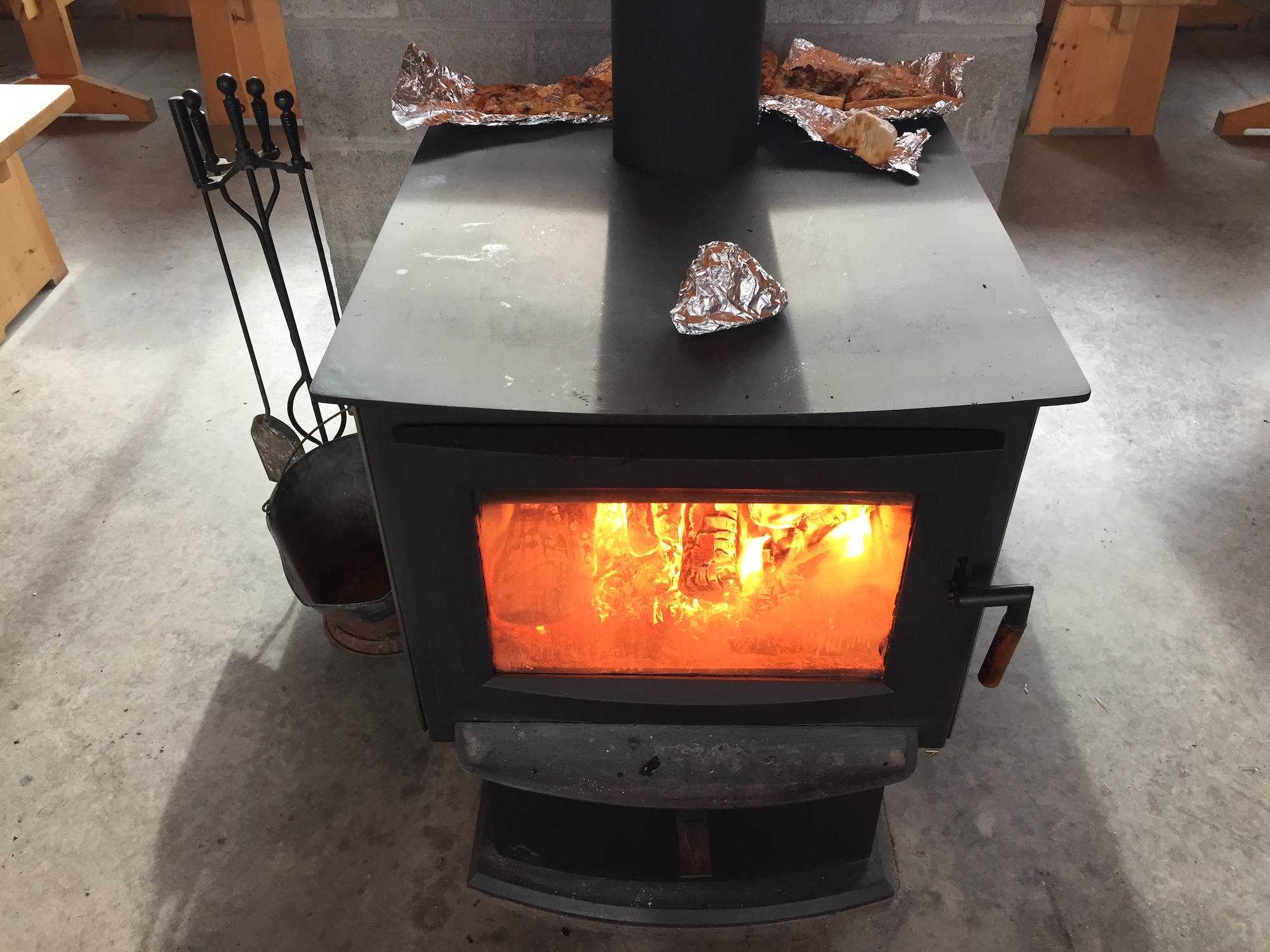 There was already a fire going, so it was nice to dry off our damp clothes and warm up our snacks. Grilled cheese sandwiches, pizza slices and samosas are some of my favorite things to warm up on a wood stove.