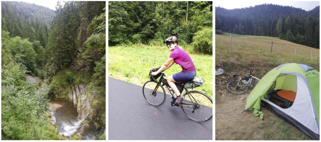The first day we leave for the Jura, which with the Alps is the other mountain range in Switzerland. The goal is to see the “Creux du Van“, a natural rocky circus of about 1,400 meters wide. The bikes are fine. Us? Not so much with a heat that exceeds 30°C (86°F) and we reach the end of 56km ride a little dry. The sky starts being dark and a big storm forms as we arrive at the campsite in the Val de Travers. It’s then a real deluge that falls 20 minutes later and lasts many hours and part of the night, but the tent resists the rain. We will have to come back too see the Creux du Van as it is hidden in the clouds. The next day the sun shines timidly but the conditions are pleasant to ride towards Sainte-Croix and its pass.