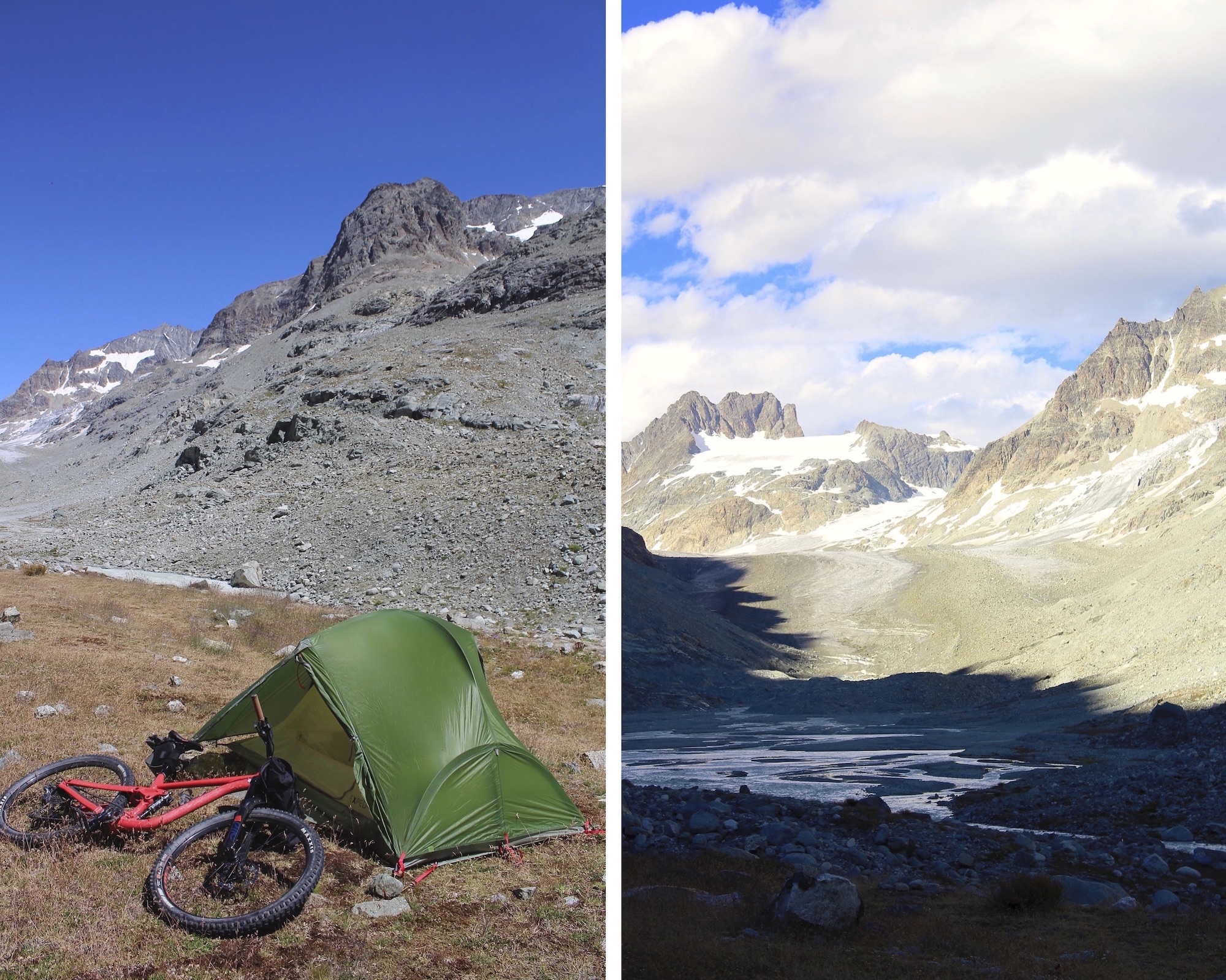 Hiking with the bike is not the most pleasant part of the trip, but the sight of small colourful tents in the distance is motivating.