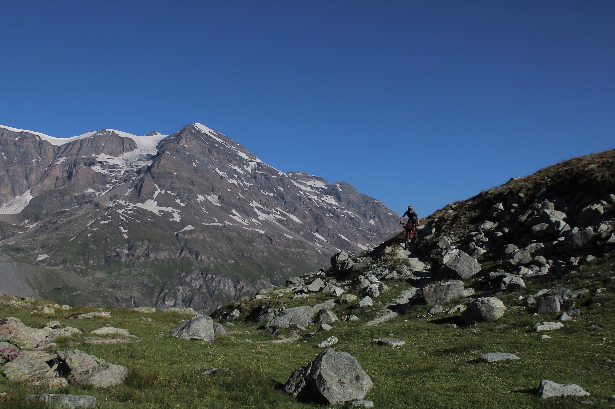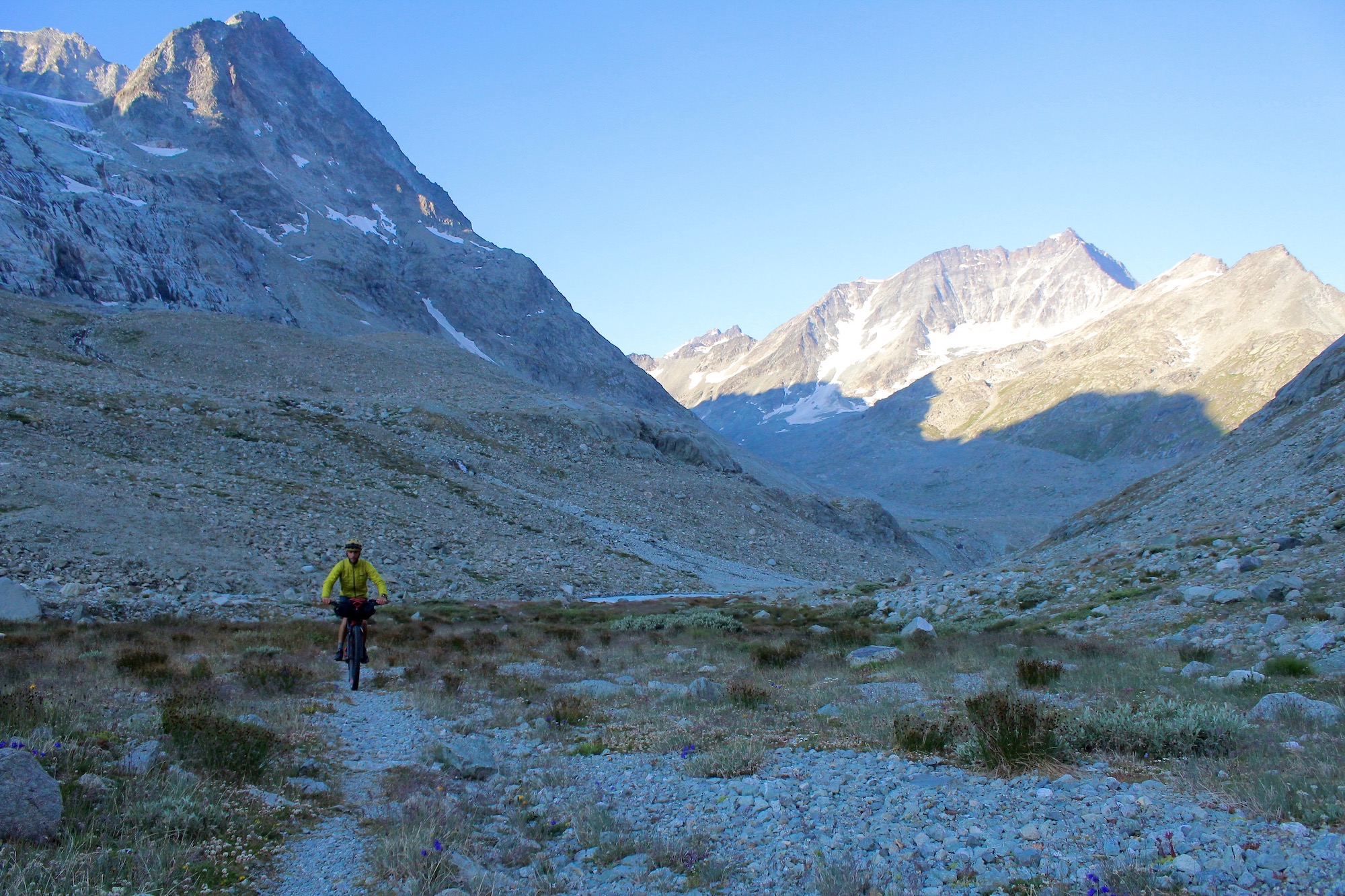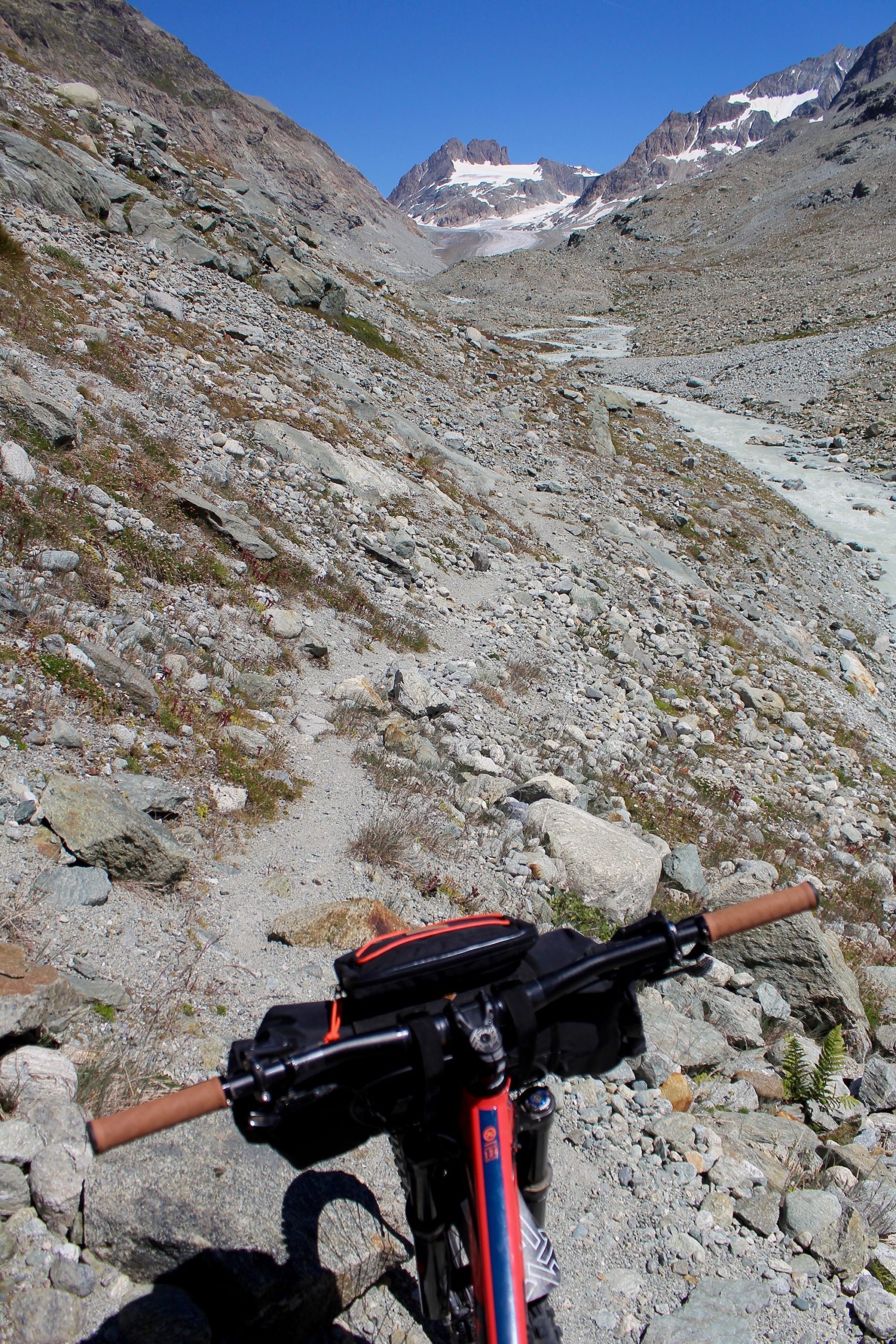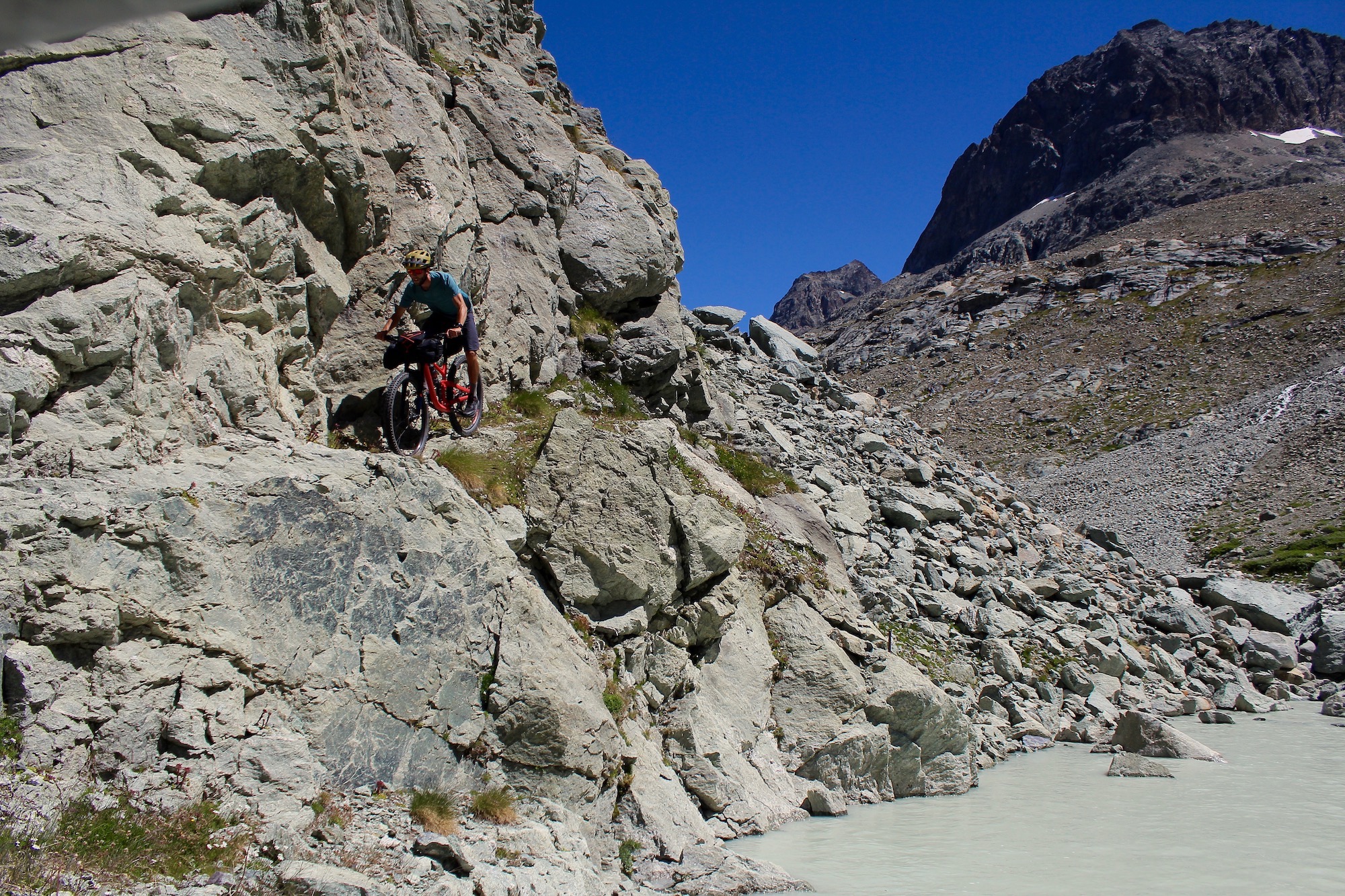 Then begins the only real ascent of the day where 300m have to be climbed. Once done, the alpine path is relatively easy to ride. The previously glaciated landscape is magnificent and the trail passes through magnificent moraines.