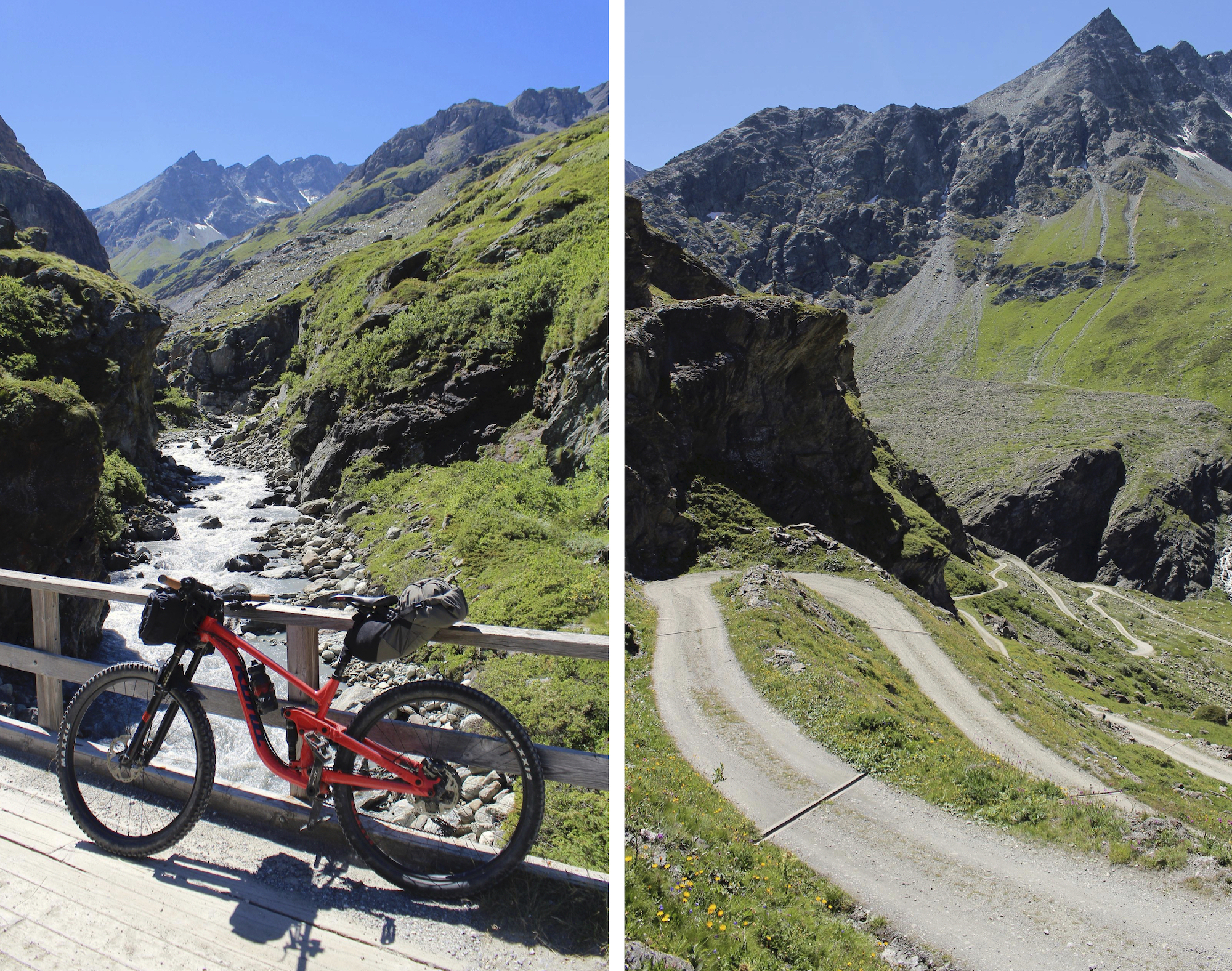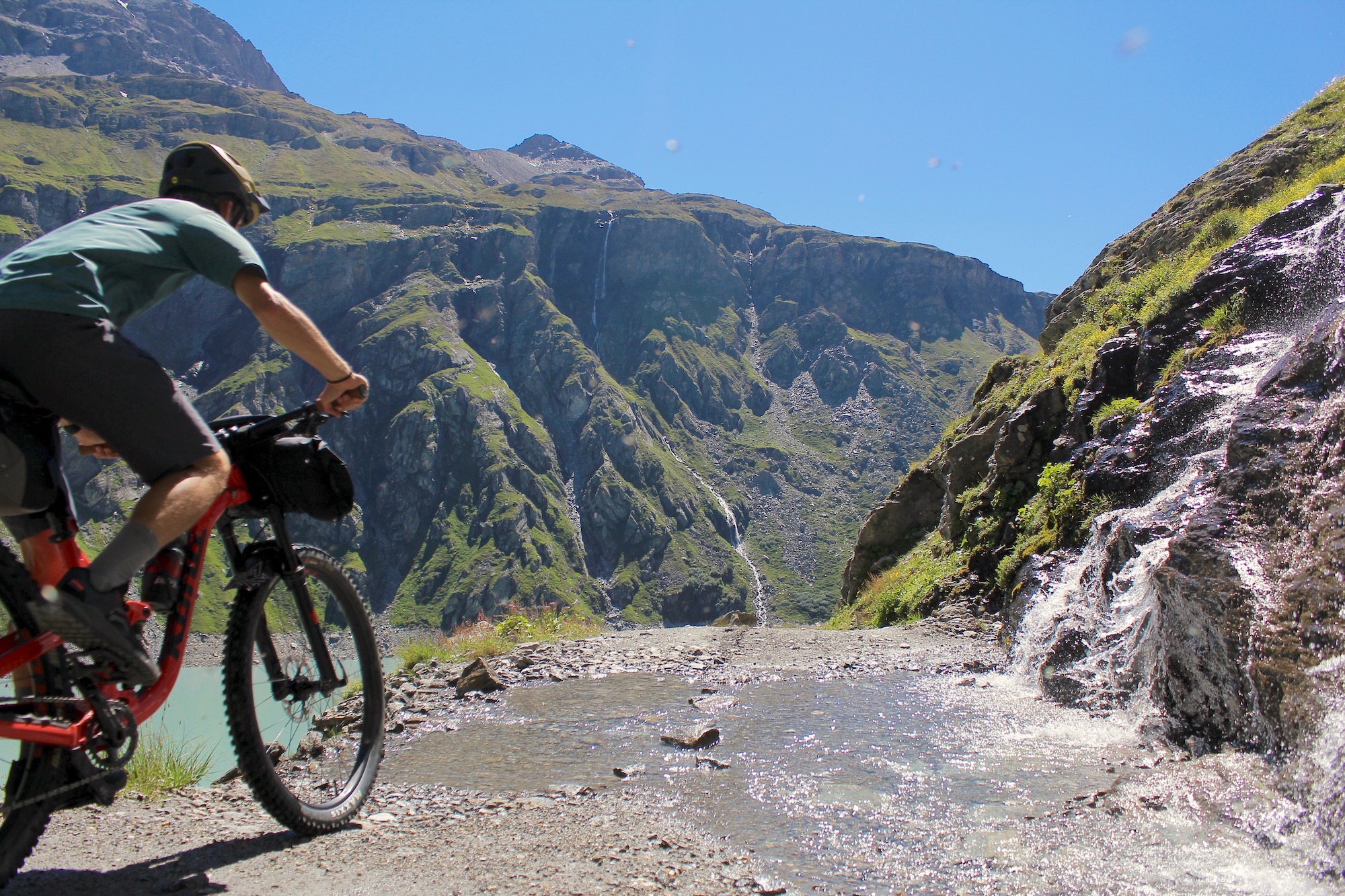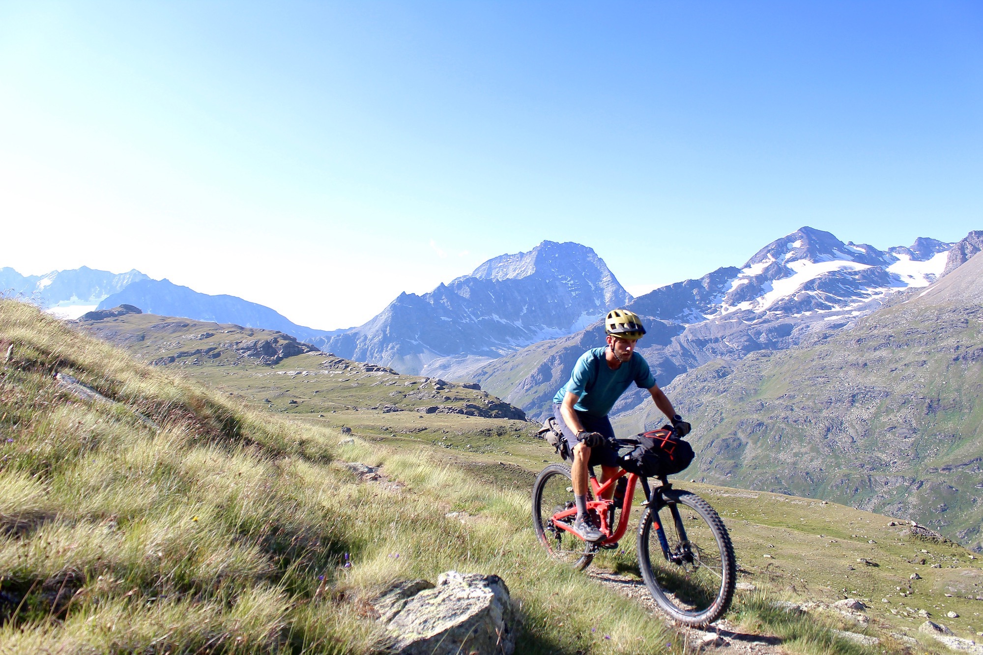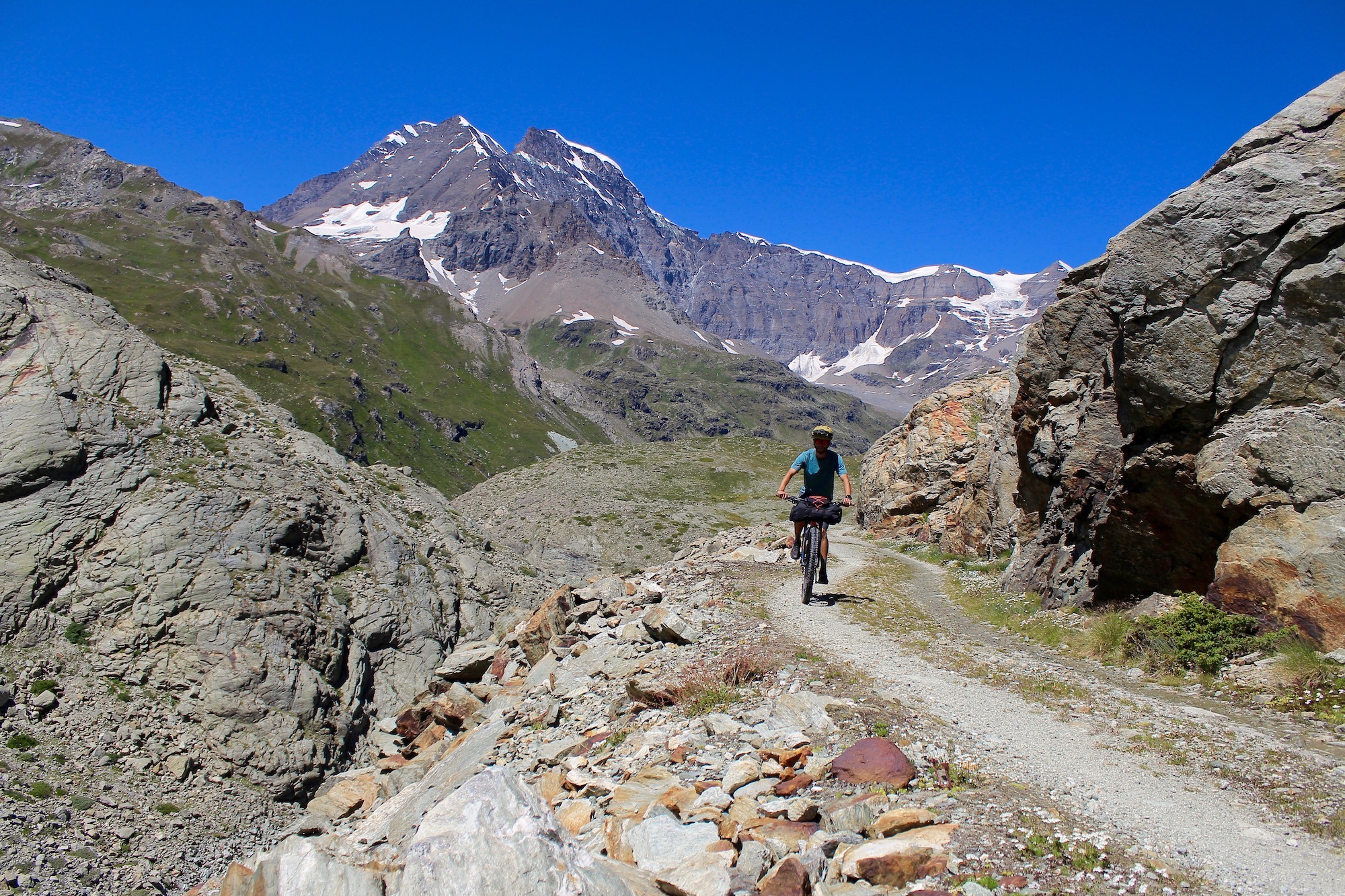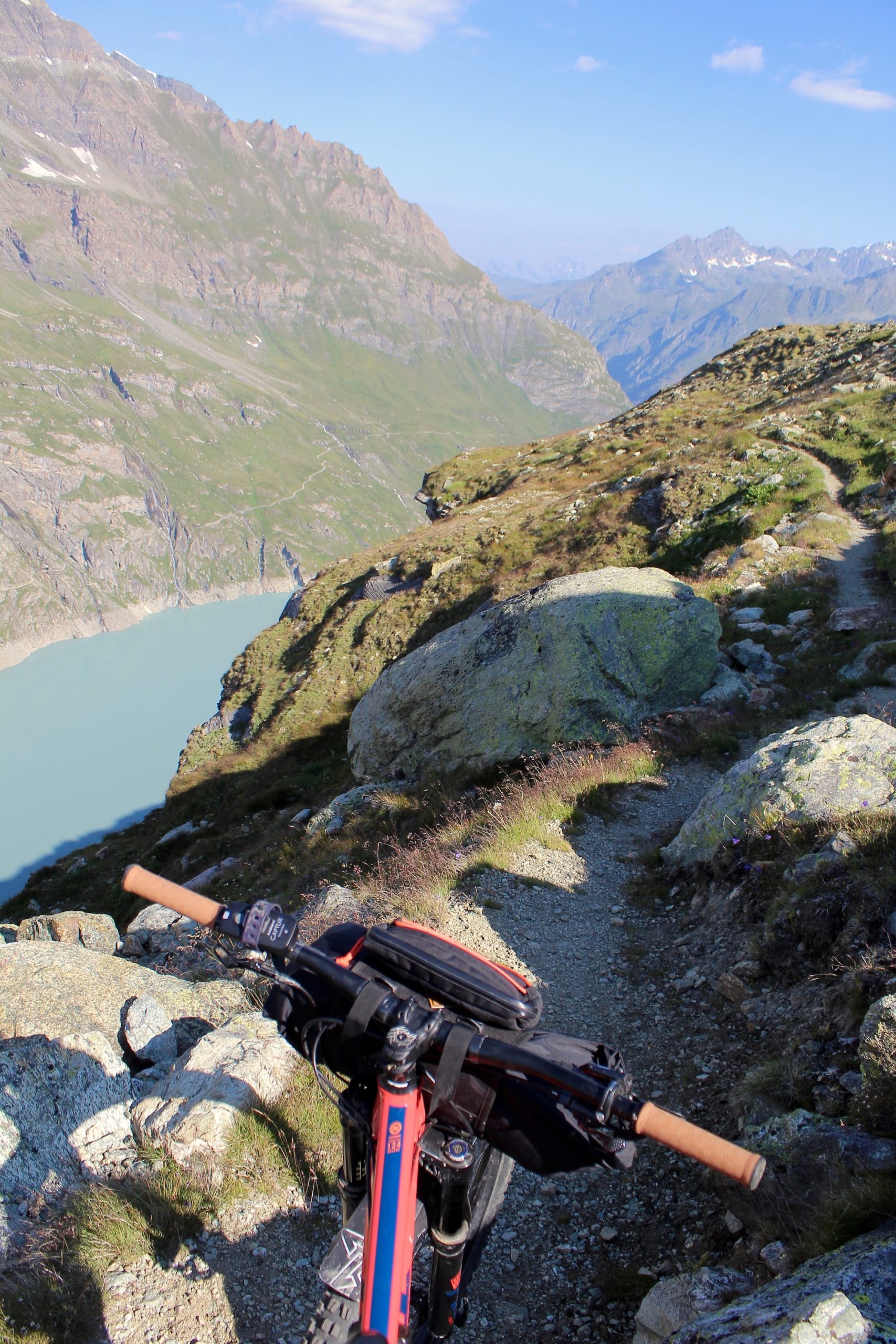 Then begins the only real ascent of the day where 300m have to be climbed. Once done, the alpine path is relatively easy to ride. The previously glaciated landscape is magnificent and the trail passes through magnificent moraines.
