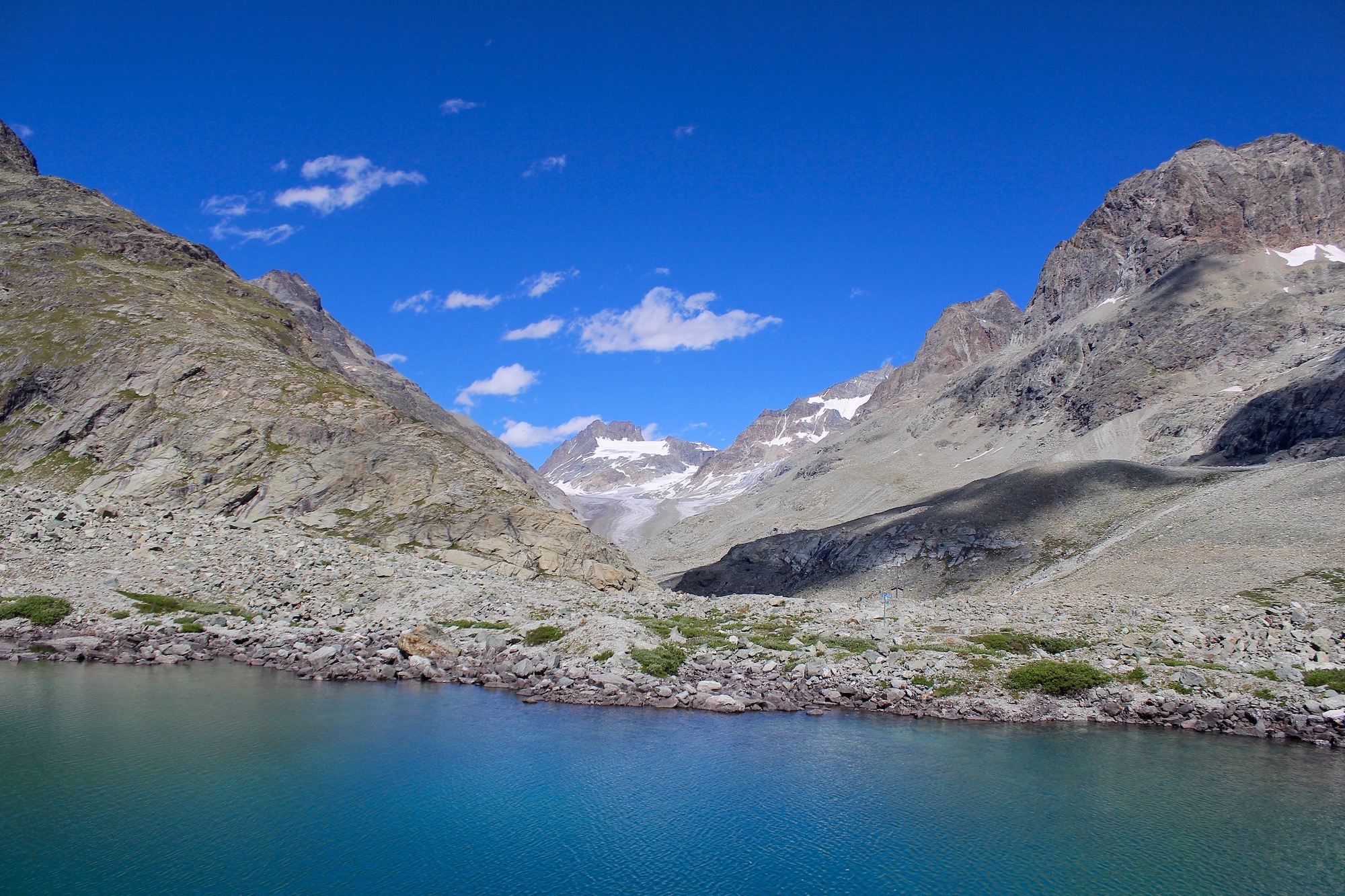 Arrived at the end of the lake, the serious things begin with a climb full of laces. As one climbs, one passes from the alpine meadows to a more mineral environment, shaped by the glaciers.