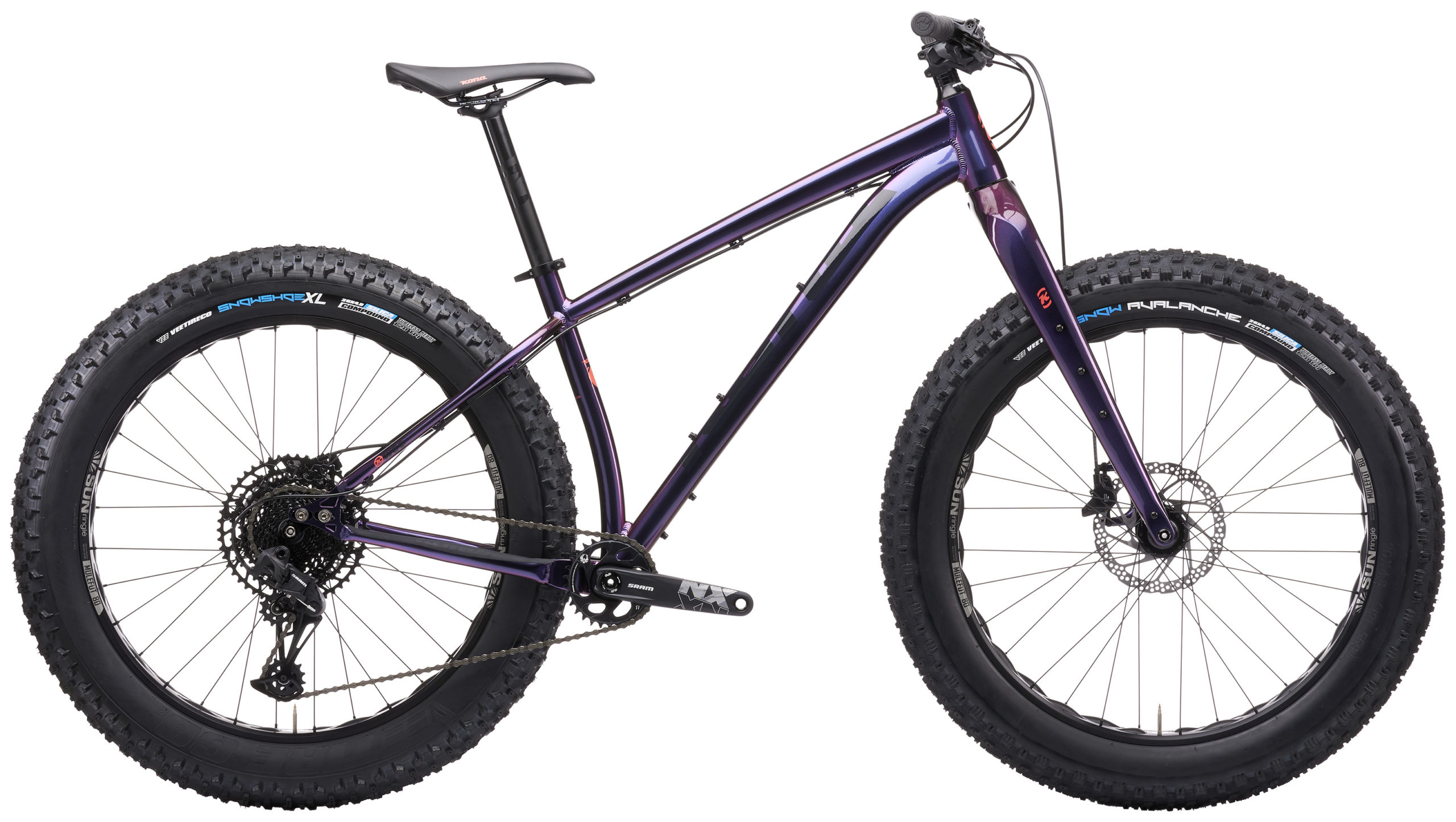 The Woo was one of the hottest bikes on our roster last year. Its ability to carry massive amounts of gear with its three-pack cage mounts aboard its carbon disc fork made it a sand and snow bikepacking favorite. This year the Woo gets Shimano’s new Deore 410 hydraulic disc brakes. A SRAM SX Eagle 12-speed drivetrain keeps the cranks turning and the 4.8” Vee tires ensure that rolling over anything is possible, and the Purple Blue prism paint job will keep heads turning all year long!