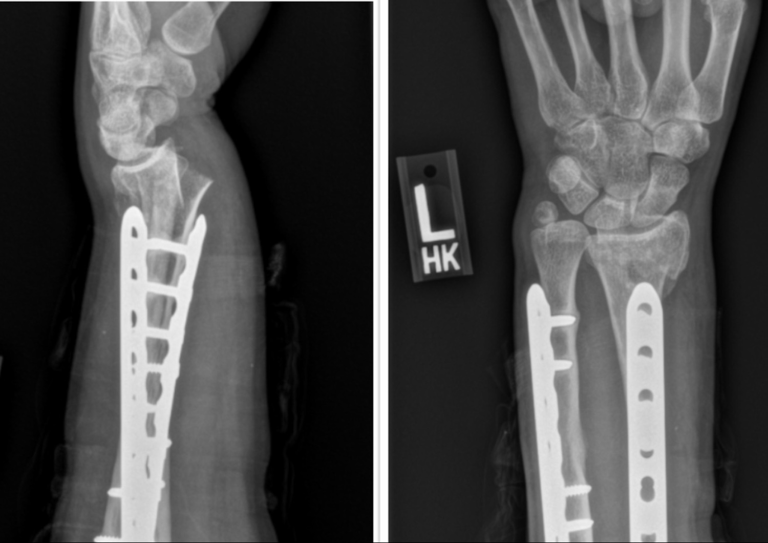 Pre and post reduction of the recent distal radius fracture with plates from the previous arm fracture. Photo credit: St. Joseph Hospital and Polyclinic Orthopedics