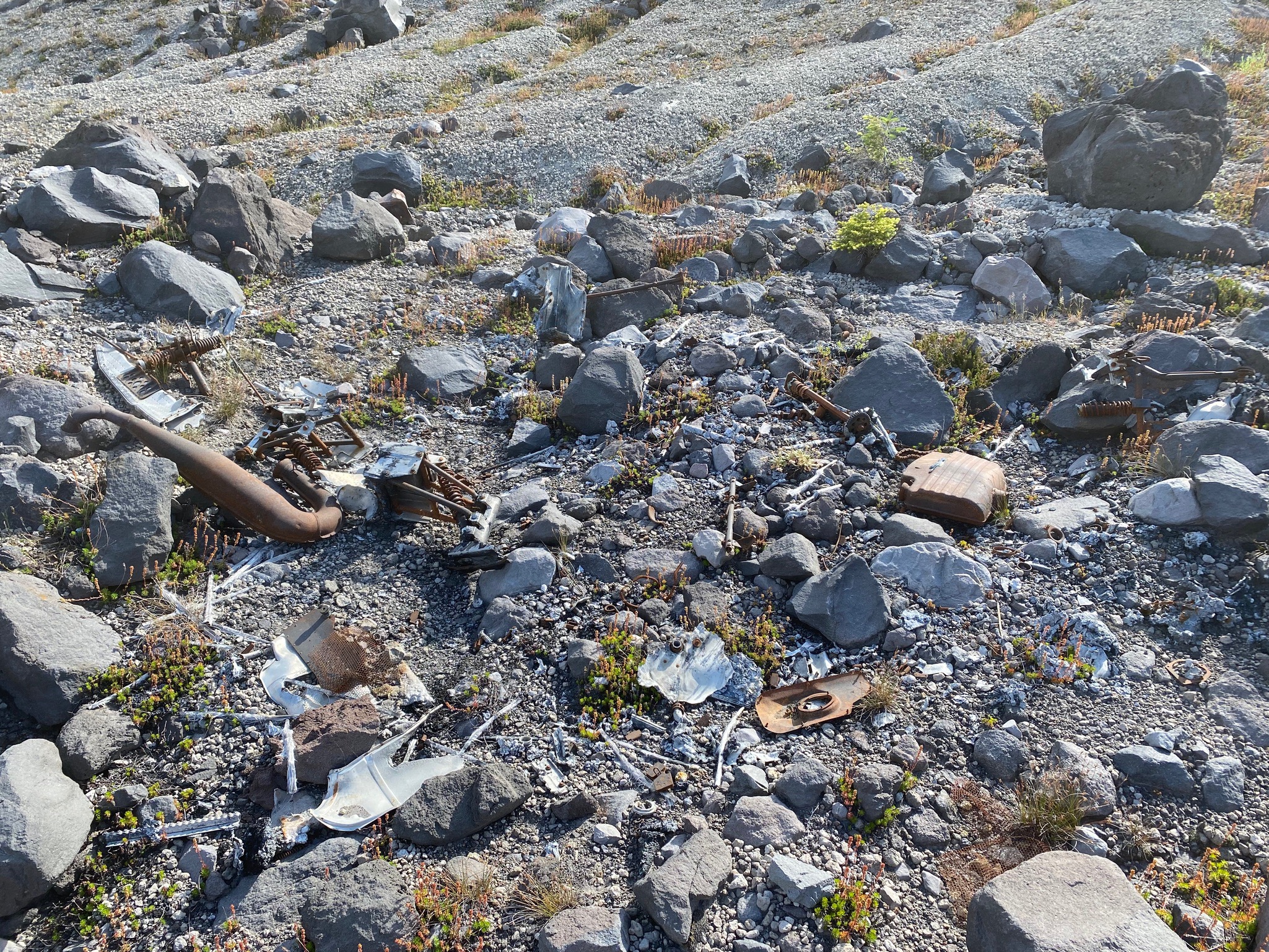 We found a fantastic spot to make camp. Great view and somewhat even ground. We were in full sun and our first priority was to find a water source. Looking around the landscape, we knew that would be tough. My friend Tim had arrived the night before and had found a small stream of water that was coming from a melting glacier. But when we got to that spot it was dry. We continued toward the mountain to see if we could find any stream or pool of water. As we ventured closer we came across what we think was plane wreckage. Tim spotted what may have been landing gear. Some of the metal had melted, what was left was rusty and eroded. When I got home I searched the internet looking for clues as to what may have happened but so far I’ve come up empty.