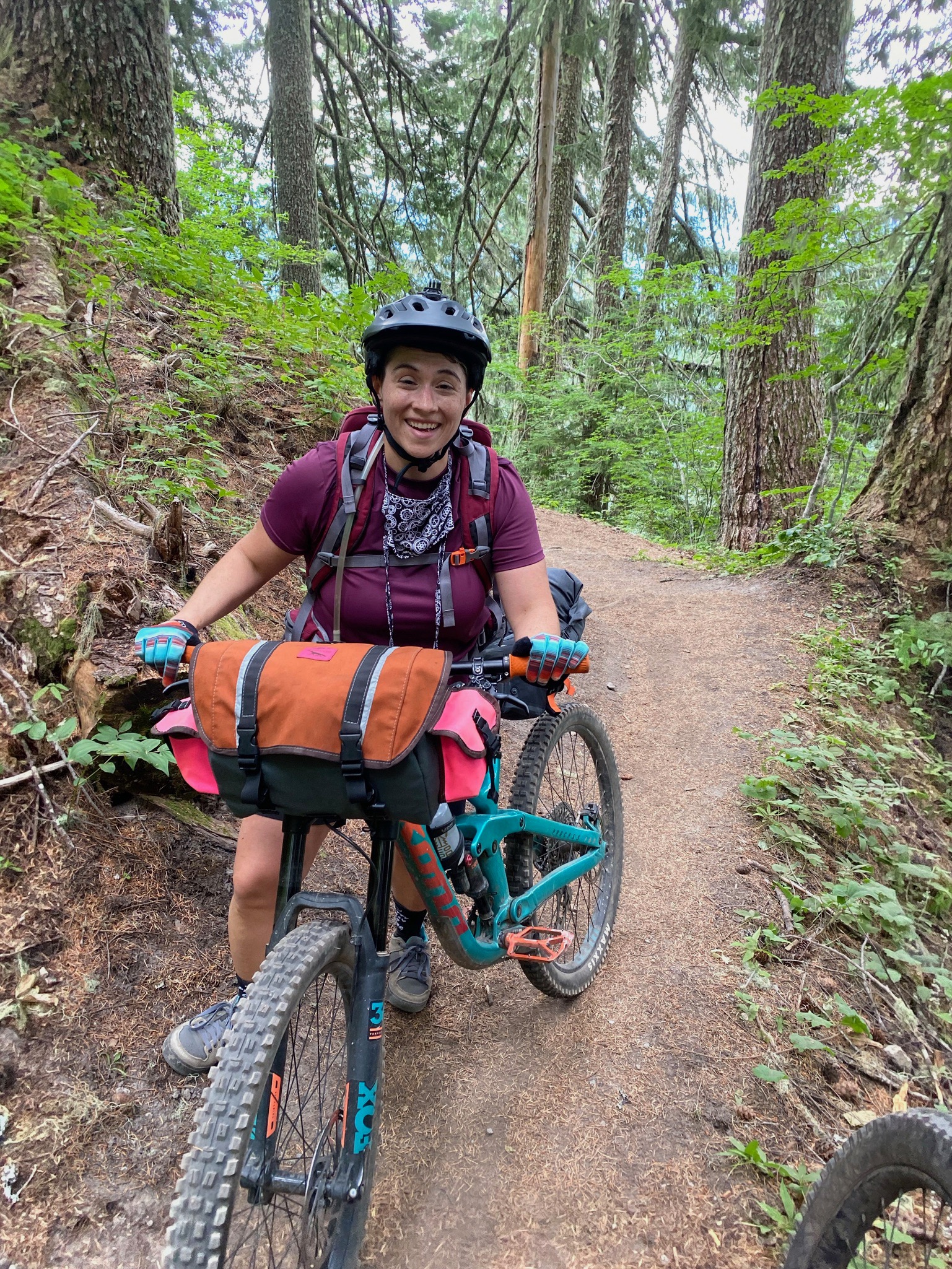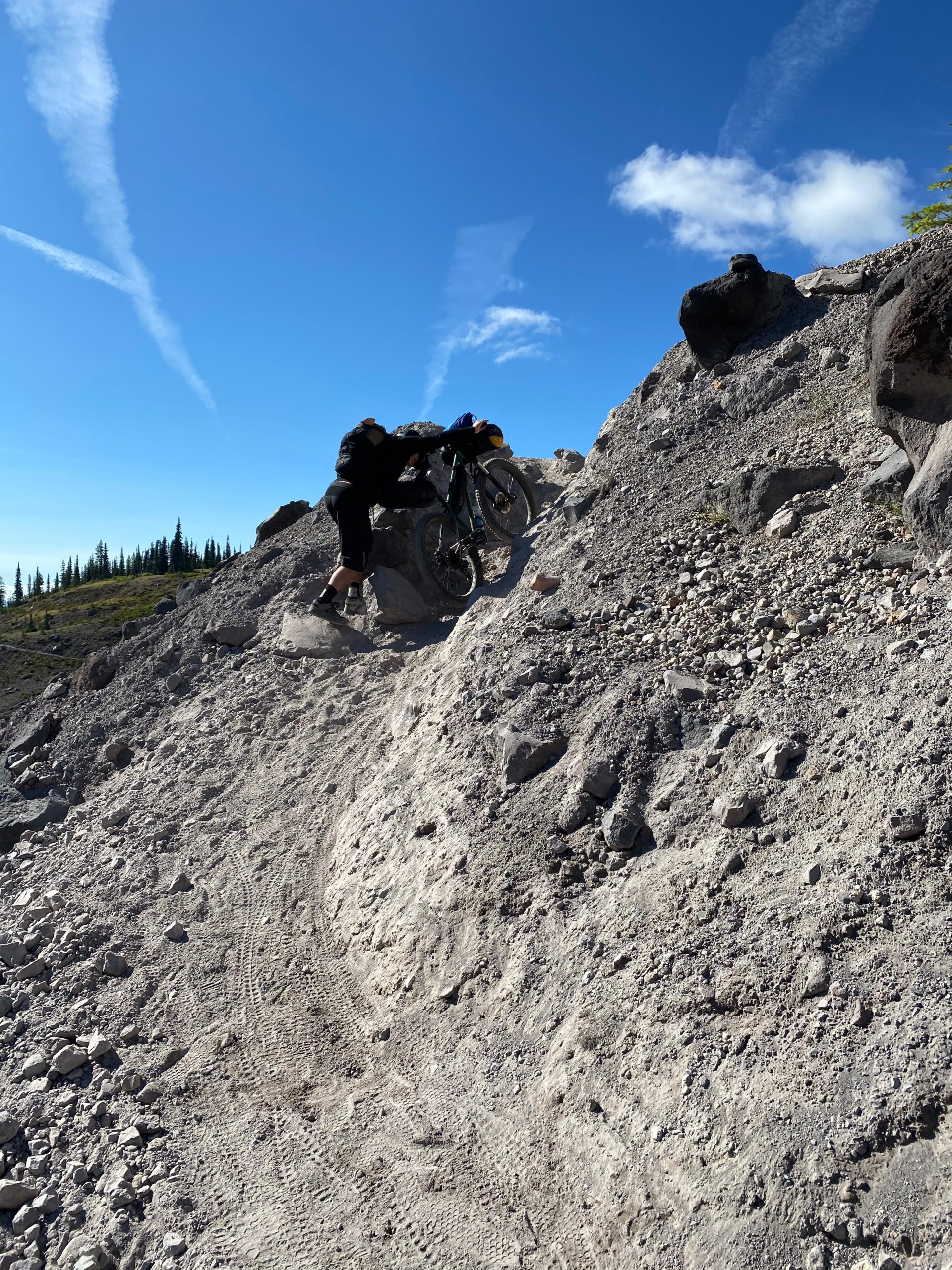 I mounted my Kona Process with a front, stem and seat bag loaded with essentials and we started out on the Ape Canyon trail. The beginning of the trail was made up of hard packed dirt, not a lot of roots or rocks but it did have some punchy climbs. With my bike fully loaded, I ended up walking and pushing my bike up. Walk/pushing gave me the opportunity to take my time and check out the landscape around me. You can still see the devastation the eruption caused. You can see the path the lahar made, filled with huge boulders, and lava rock. You can still see the blast area that toppled trees and left them looking like matchsticks over what was once thick forest.