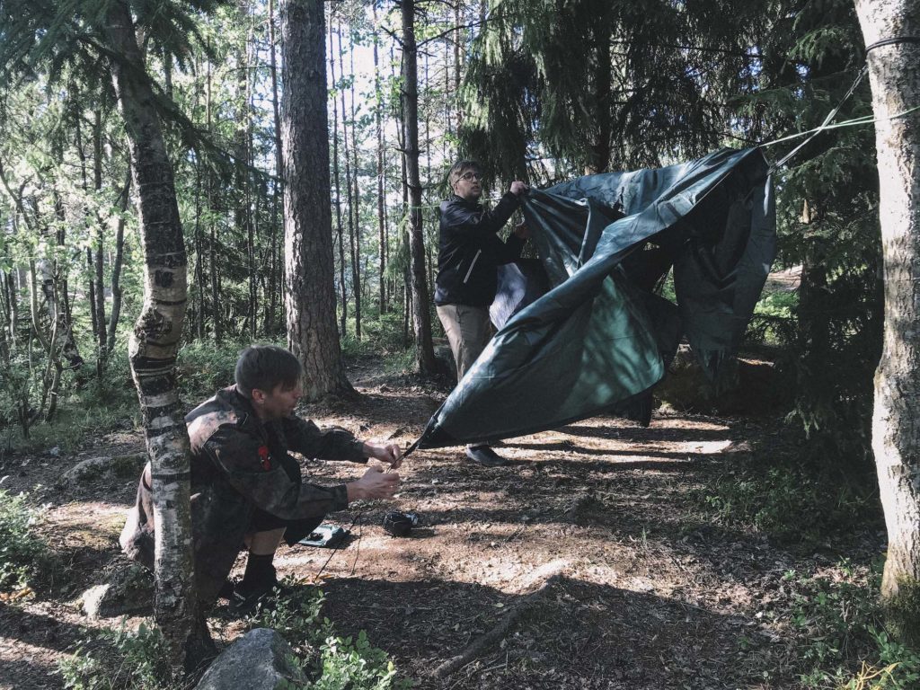 I took the sweeper spot at the end of our convoy and Ville led the way through the suburbs towards Porkkala nature reserve east of Helsinki. We stopped for lunch at Kirkkonummi and bought things for the bbq. After enjoying a rather stiff headwind we arrived at our destination and set up camp. Some of us tried out borrowed hammocks for the night while others had their own refined bike packing setup.