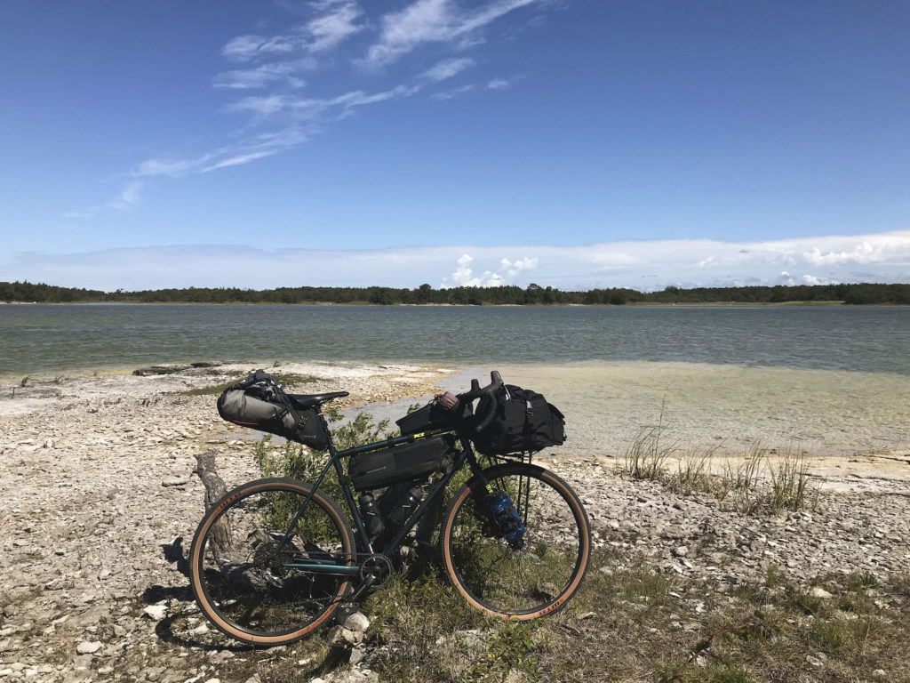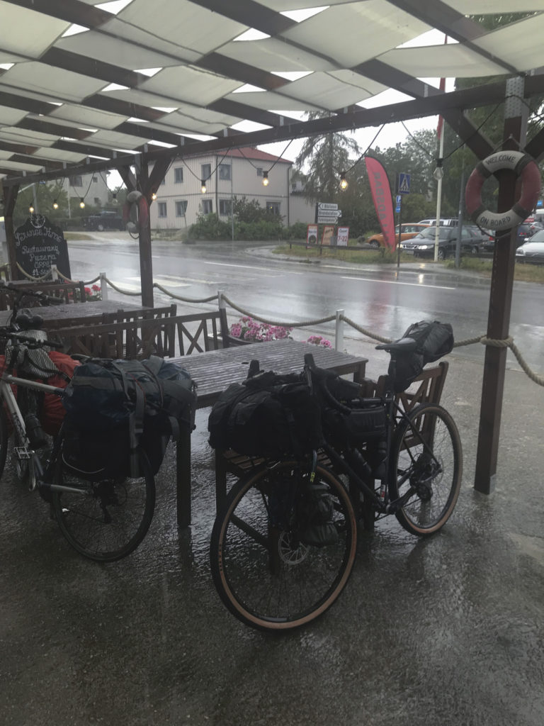 Woke up in the middle of the night to a strong gust of wind and a loud bang. My bike had been leaning against a tree, but it was now hugging the ground. Got going without breakfast since there was a café few km down the road. Enjoyed two wonderful home baked sandwiches and a cinnamon bun. While admiring a quarry with the road running straight through it started to rain. And it came down really hard. When I reached the town of Fårösund the streets were absolutely flooded. Hanging out in the pizzeria looking at weather reports my dreams of riding in sunny Gotland were shattered. The torrential rain would continue until next morning. With the kit already wet I took the ferry over to Fårö island and checked in at the first campsite. They offerred a small cabin for about 40 €. With the temperature down to +12° I cranked the cabin heater up and started the drying operation. Even the stuff in my frame bag and a small dry bag on the fork were wet. The rain continued until the next morning.