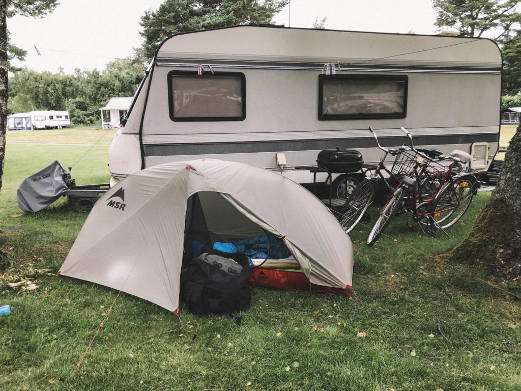 Had a nice fish soup at the Katthammarsvik fish smokery and continued to the eastern tip of the island. Found a great fire pit with great views by the sea. Would have been an awesome spot to set camp, but I had to continue at least another 30 km to keep on track with the plan. In the early evening the wind started to be pretty violent with gusts up to 18 m/s. I had to find some shelter to set up my tent, since the ultralight MSR Carbon Reflex 1 can’t stand such high winds. Came up to Herta camping with quite many trailers but rarely anybody there. The reception was closed too. Eventually found a helpful lady who told me that all the trailers have seasonal spots, but most of the people were home because of the weather. Set up my tent behind a vacant trailer and enjoyed the shelter from the wind.