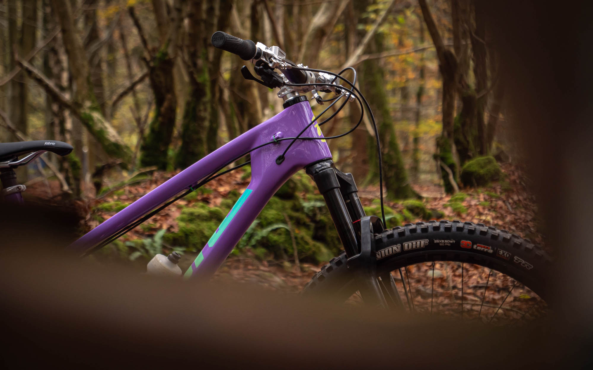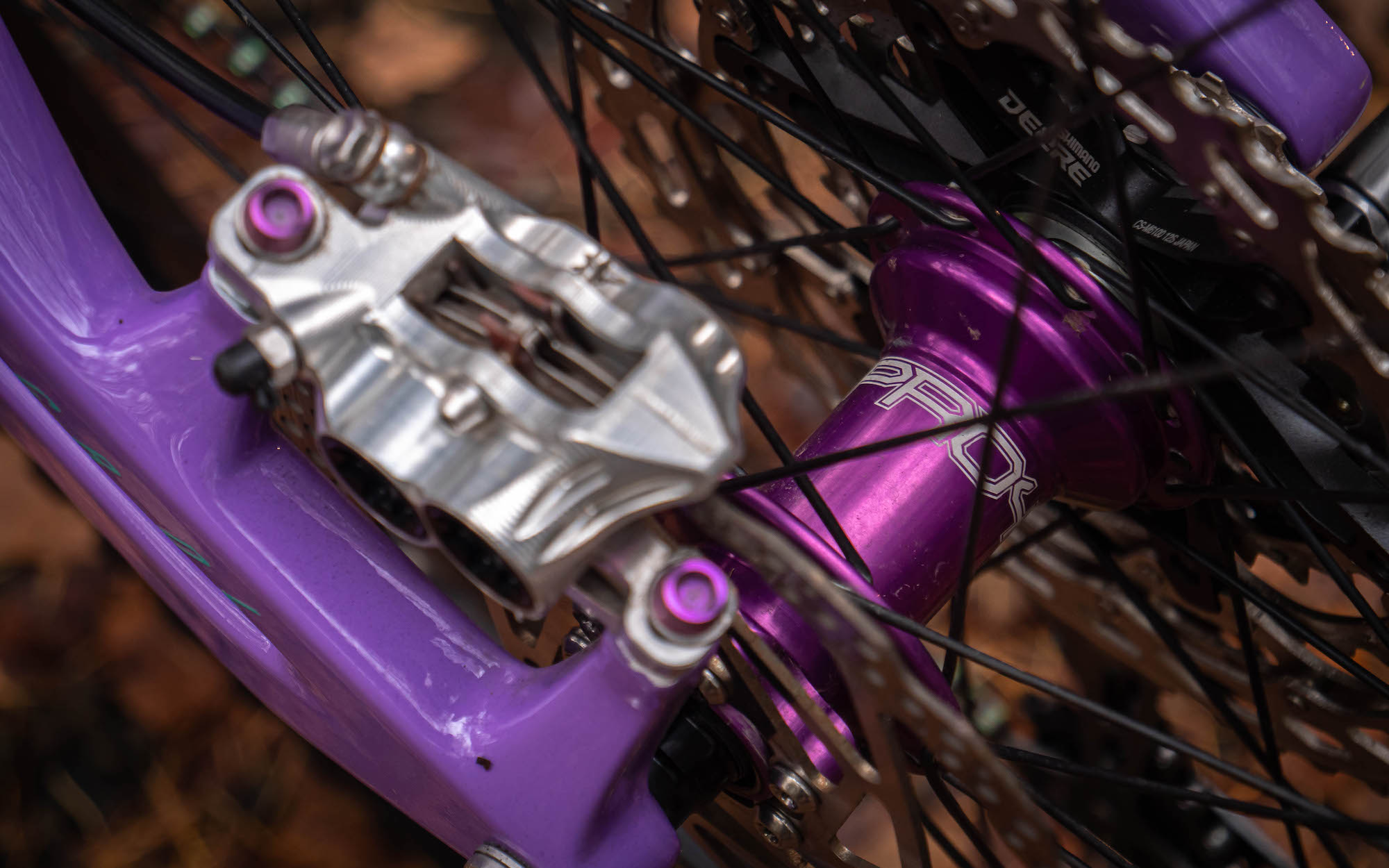 The frame is rolling on a purple Hope Forts 30 wheel set. Brakes are also by Hope-their E4 model.