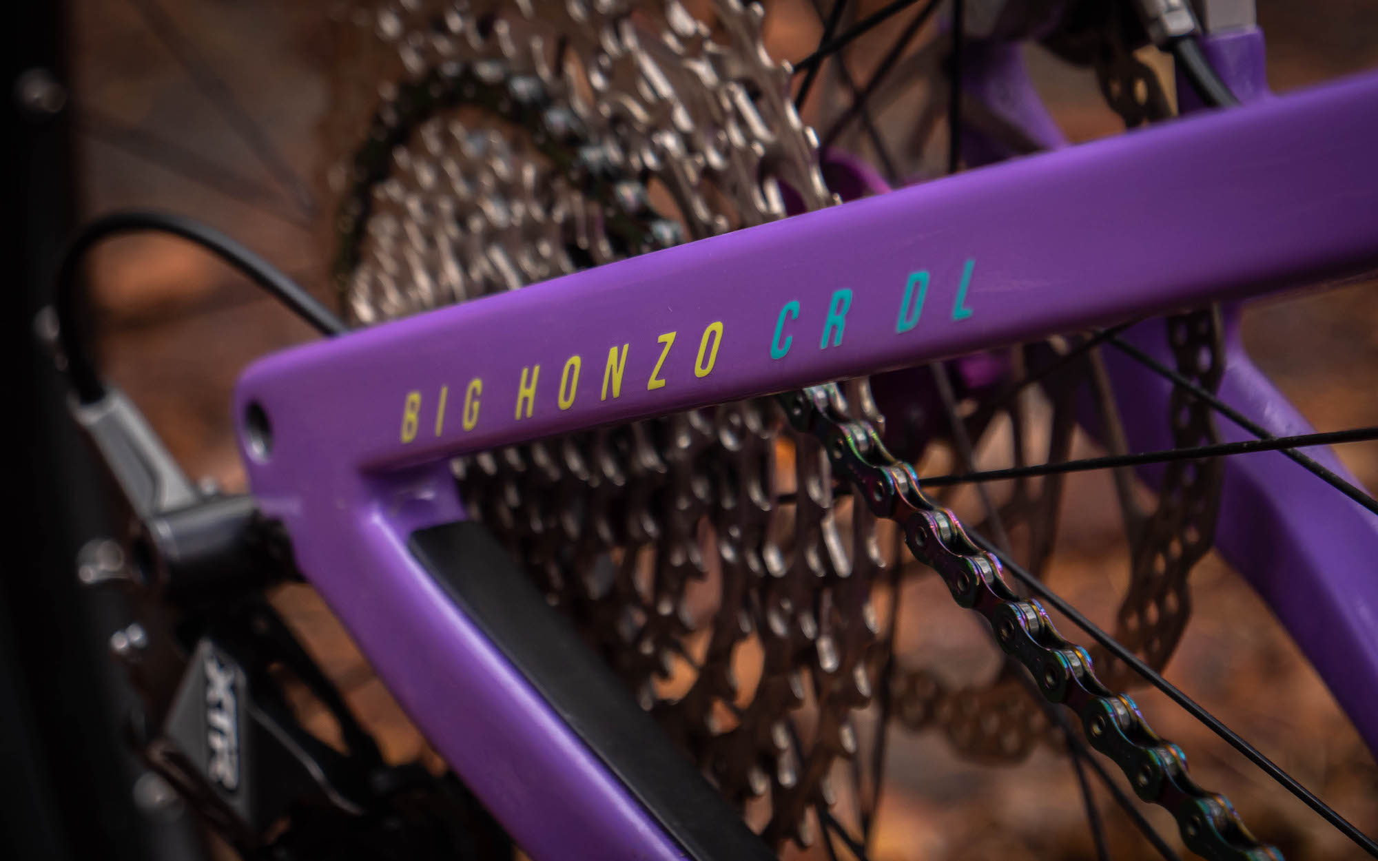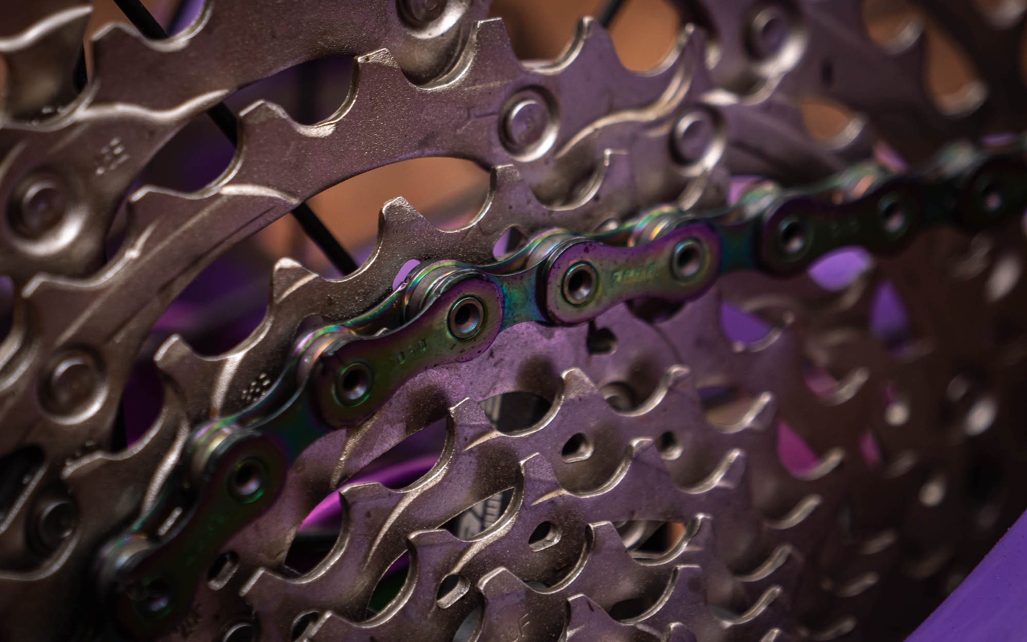 No purple bike is complete without the dreamy SRAM taste-the-rainbow oil slick chain. This sits aboard a Shimano 12-speed cassette.