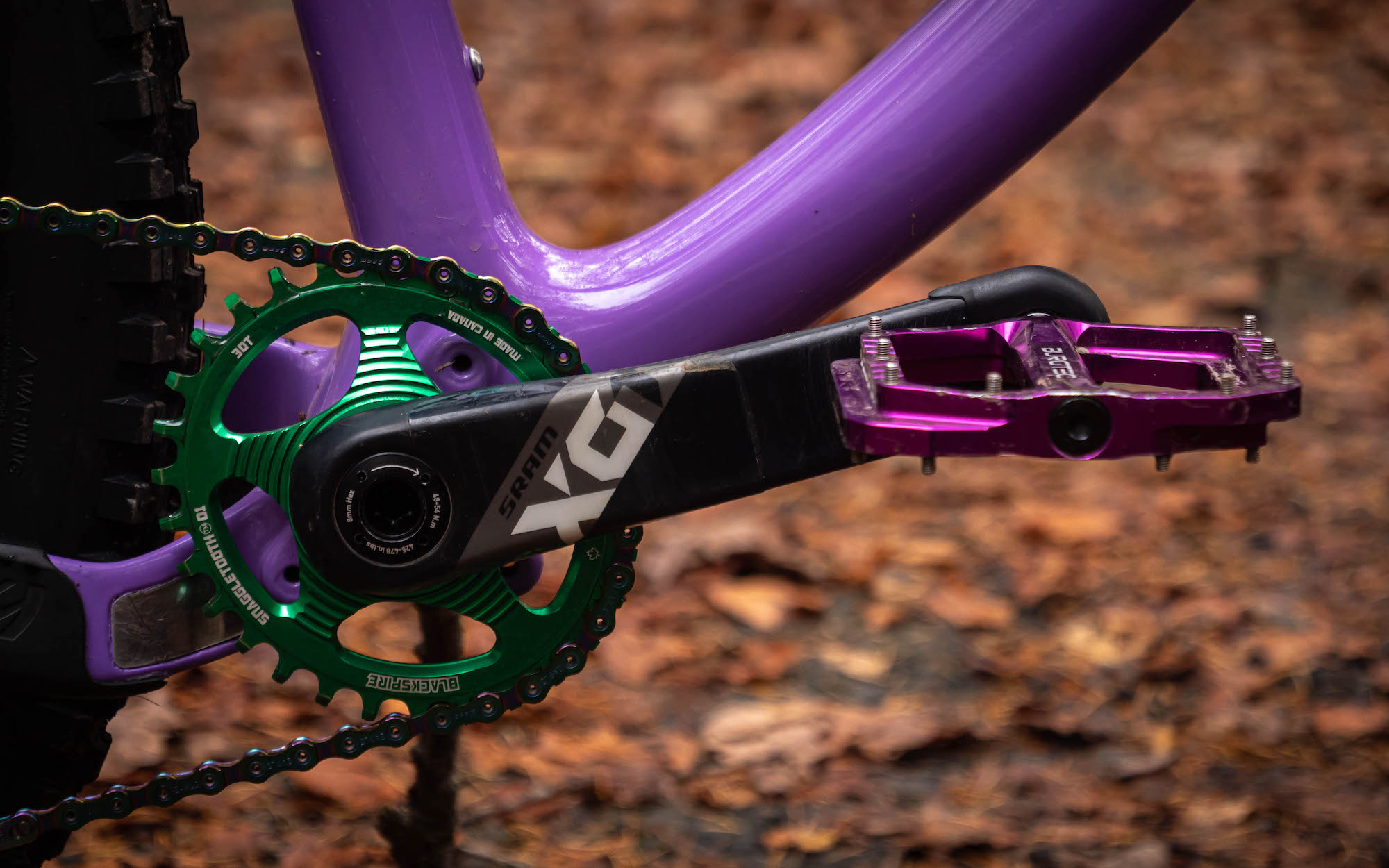 Purple MK5 Burgtec pedals sit on SRAM 170mm carbon cranks.