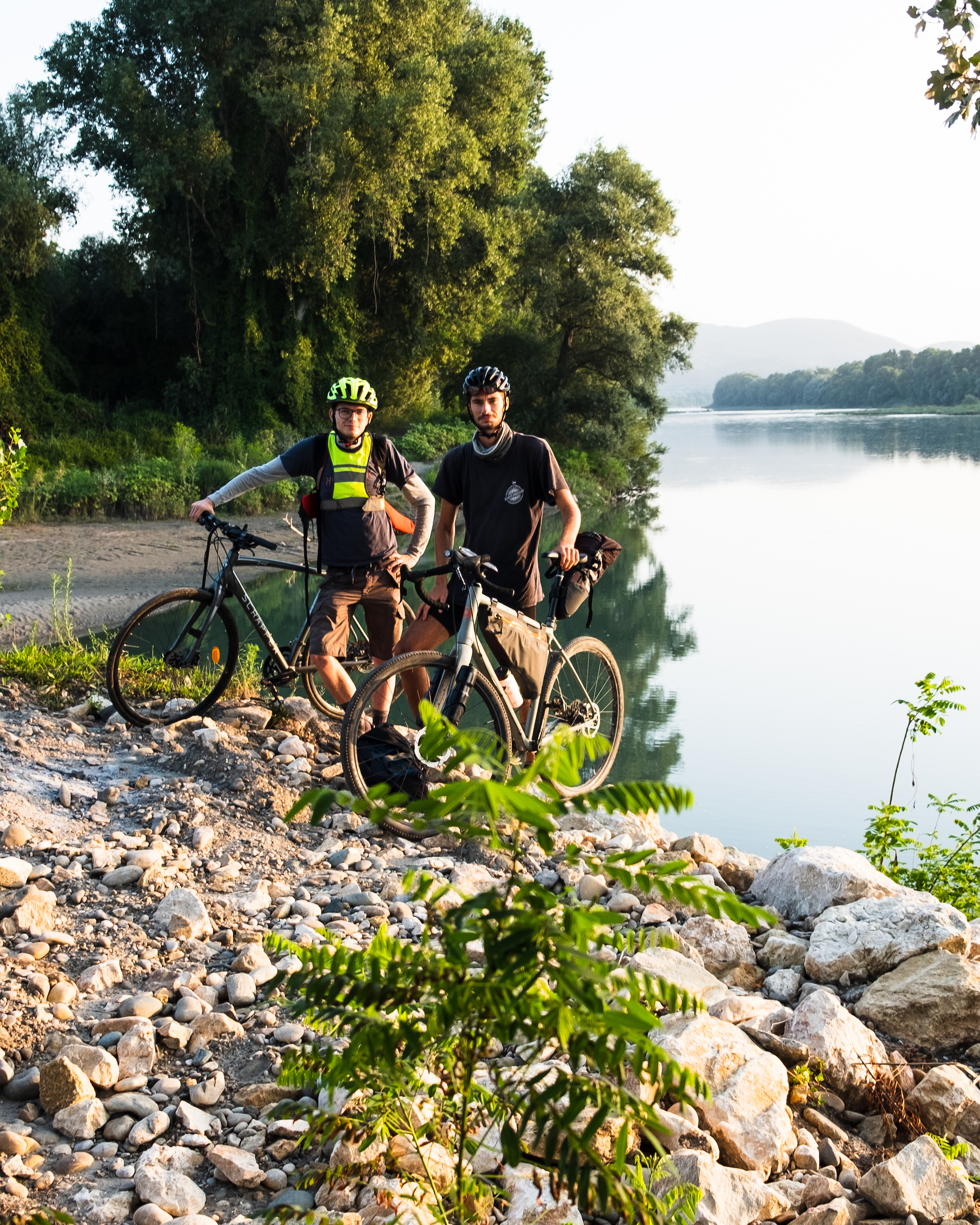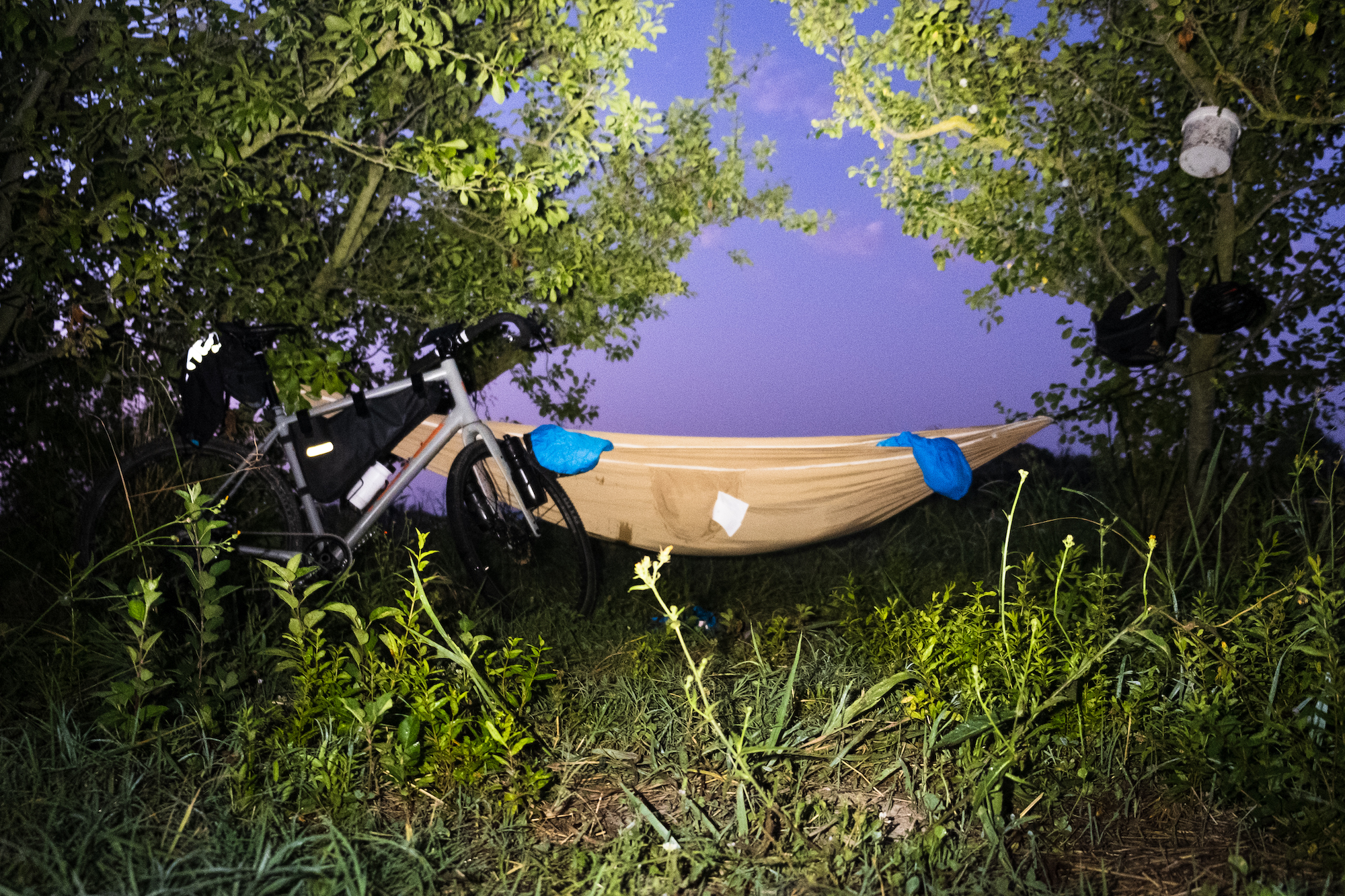 That leads us to 13h,and we begin to ride for real. Not for a long time because in the heat wave in the afternoon we do not look proud. Overwhelmed we stop in a river to take a dip in the middle of dragonflies and crayfish. During some hours we are still very hot then the sun begins to go down and we can start to have fun. Almost alone in the world on this cycle track, magnificent lights and glorious speed. While the sun sets, we arrive at the foot of a cliff underneath a castle. We toss the frisbee and and the decision is made. We would like to sleep up there. Problem is, there are only shrubs up there, impossible to stretch a hammock. So we continue to ride until midnight. Everything is peaceful and we feel really blessed to ride there under the stars. The hammocks are finally stretched, an apple tree in front and a plum tree behind.
