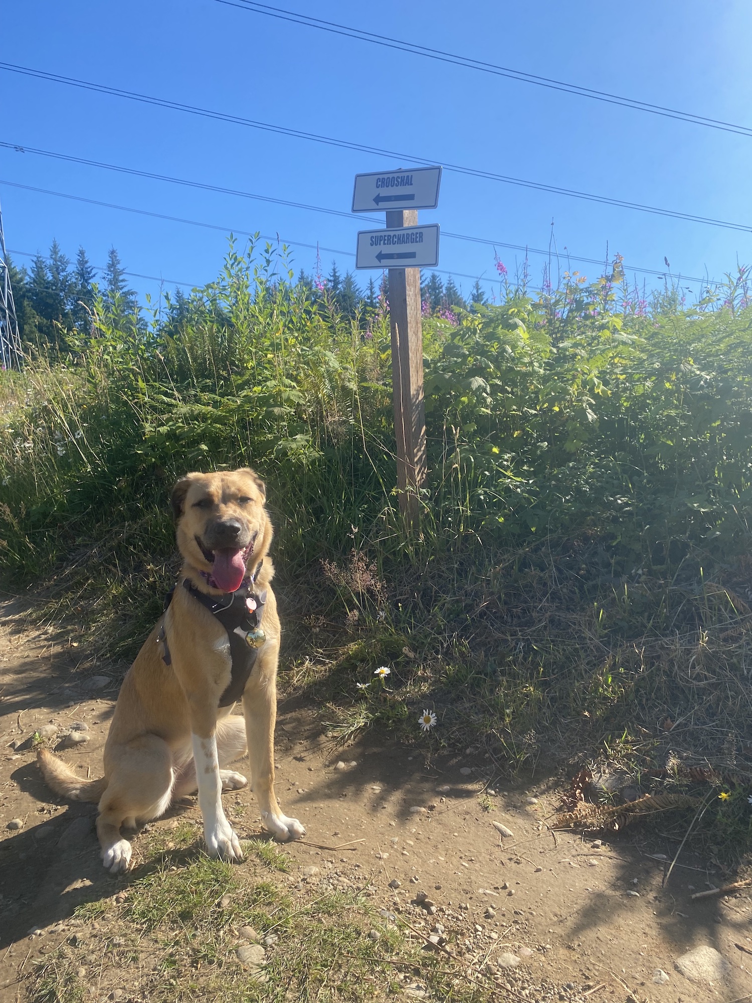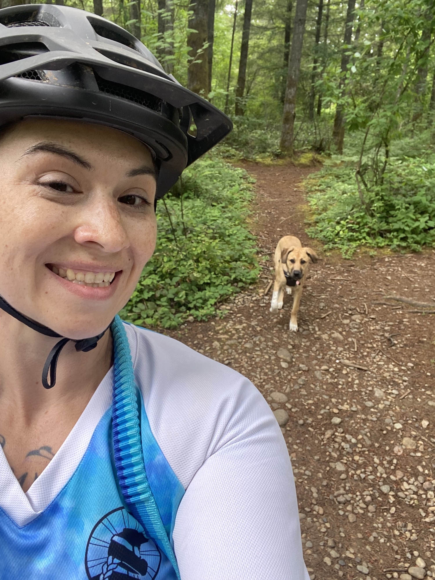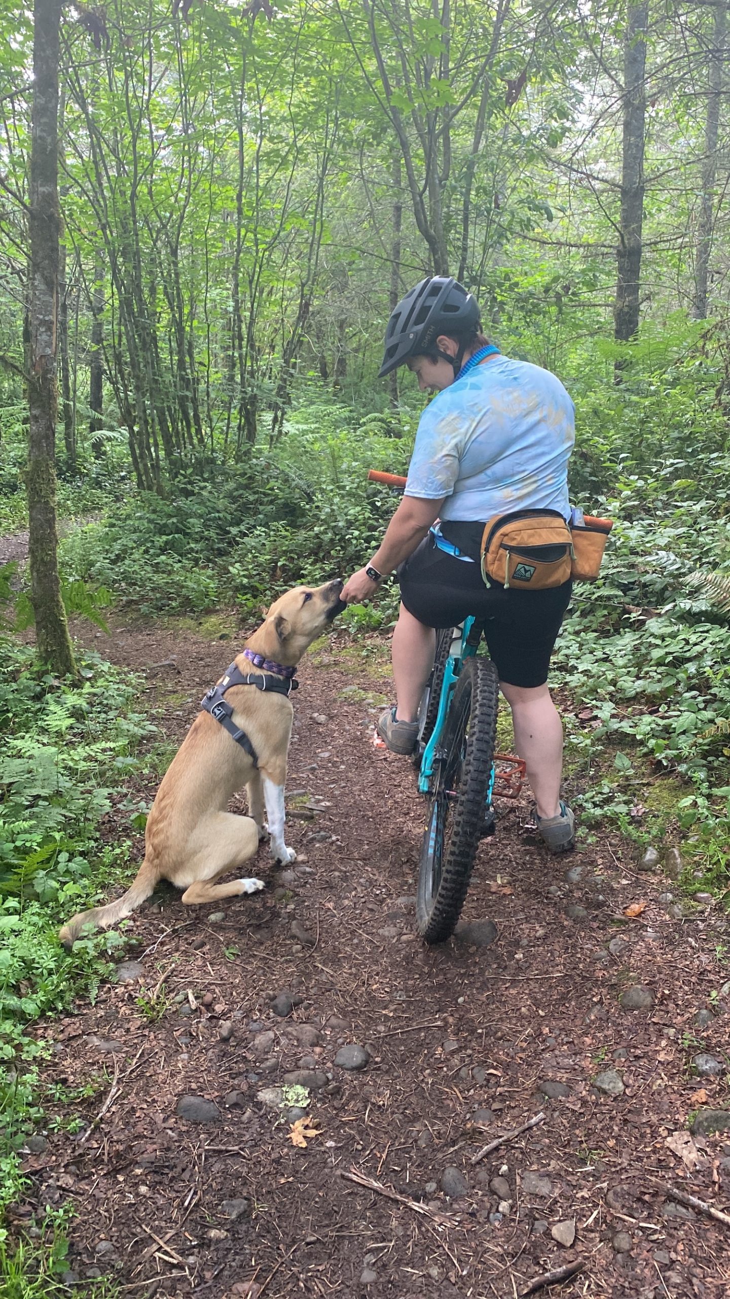 Finally, the day had come. I loaded her up and headed to the trailhead. I clipped her leash around my waist, then connected it to her harness. Off we went. She did really well for her first time. Trotted right next to my bike the entire time, only pulling away once to greet a playful golden retriever puppy.