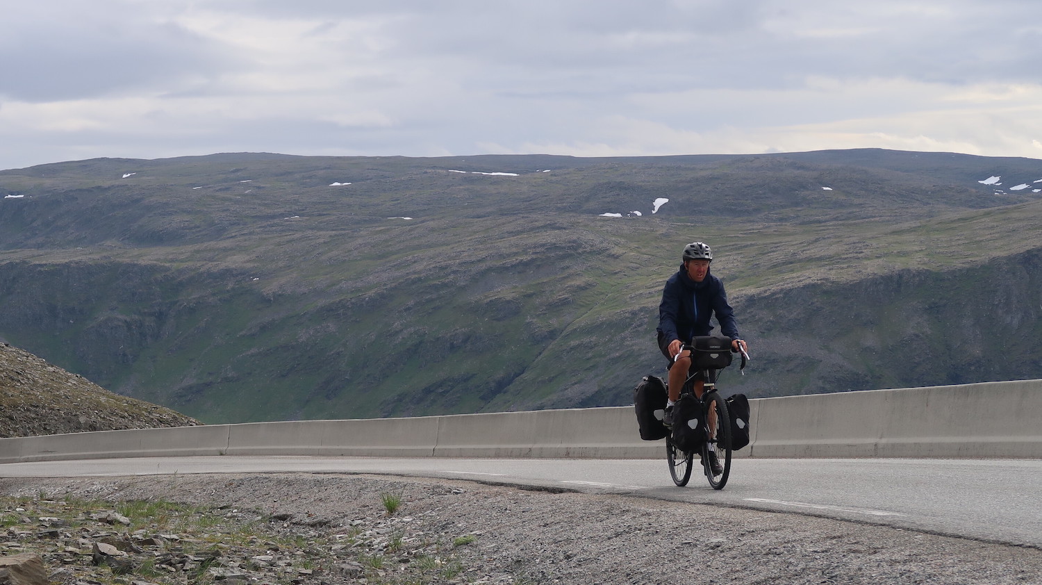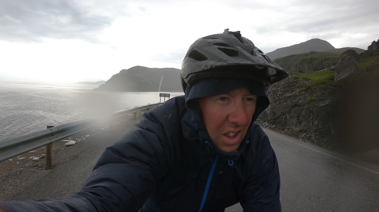 The landscape really changes during the last couple of days. Since we’re so far up north there’s hardly any vegetation that manages to survive the winters up here. As soon as you leave sea level and climb up a hill there is literally nothing growing up there. Just a barren tundra landscape. This makes everything much harder on you as a cyclist since there is no shelter from the never-ceasing head winds. iIt also makes it pretty difficult to find a sheltered spot to pitch your tent at the end of the day. On the second to last day I had to ride through an Arctic thunderstorm for a couple of hours since I couldn’t find any shelter from the pouring rain anywhere. It was pretty tough mentally, but I finally managed to find a small sheltered bay at the end of my very long day, where I was able to pitch my tent in the pouring rain.