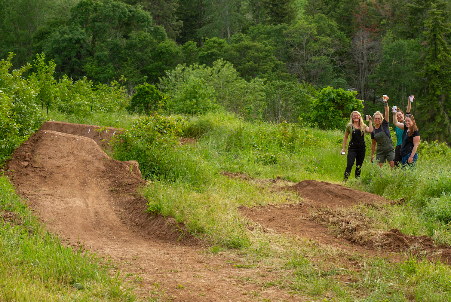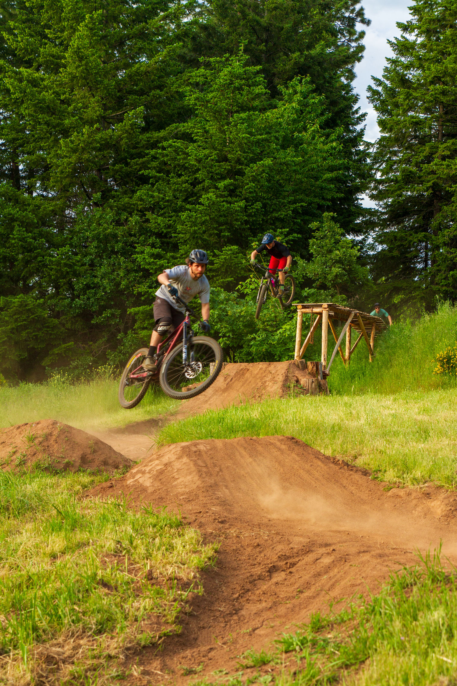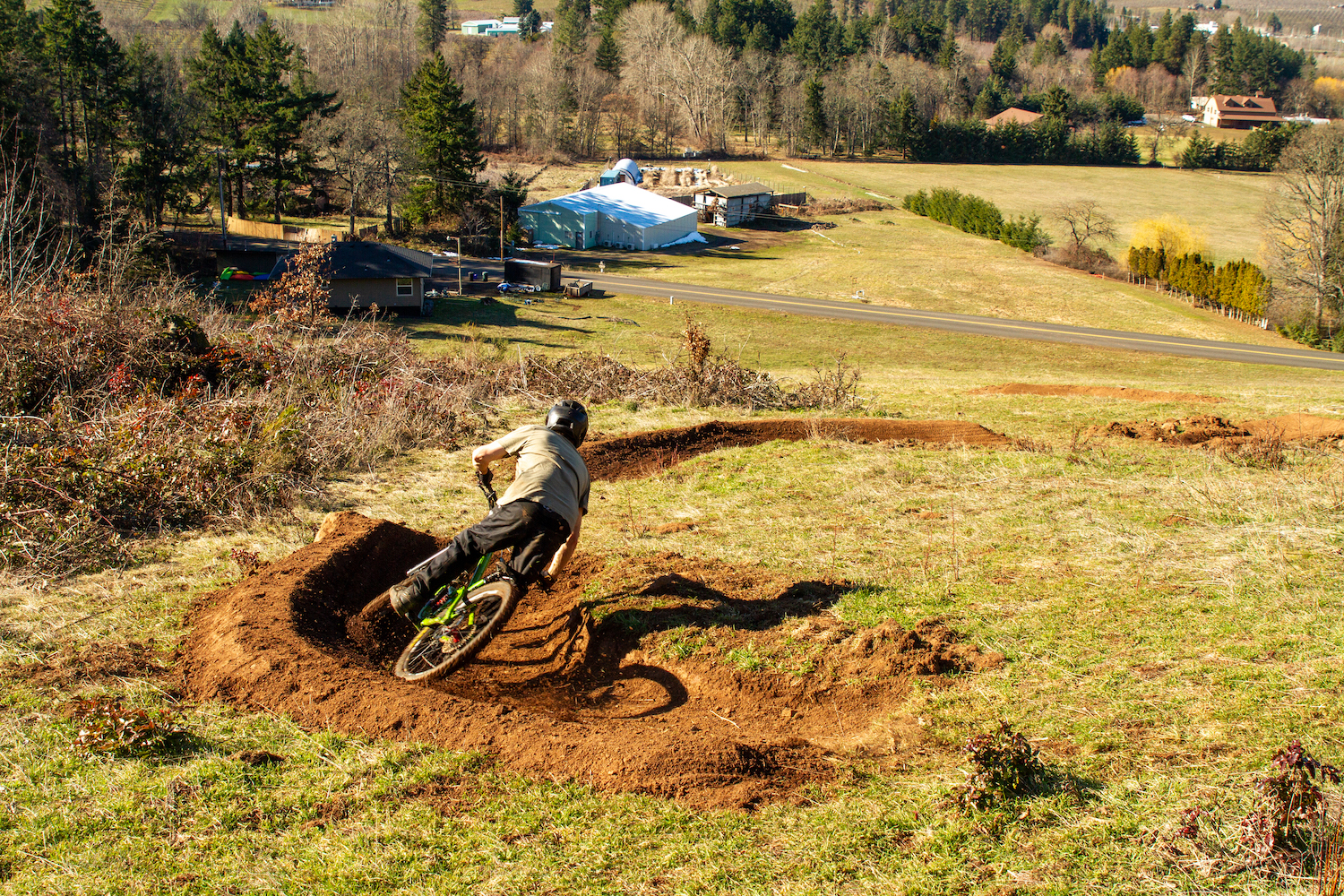 The trail started with just a few berms coming down the hillside, we wanted to be low impact on our landlords’ property. But then, I kept thinking about building a step down off the irrigation canal embankment. We couldn’t help ourselves from trying, so we gathered a bunch of down trees from behind the house, debarked them, and pieced together what is now a pretty significant step-down structure. Once the step down was finished, we couldn’t stop there, so we decided to put in a shark fin and a 25-foot kicker. It all came together relatively smooth minus accidentally breaking the neighbor’s water pipe and having to fix it…Whoops.