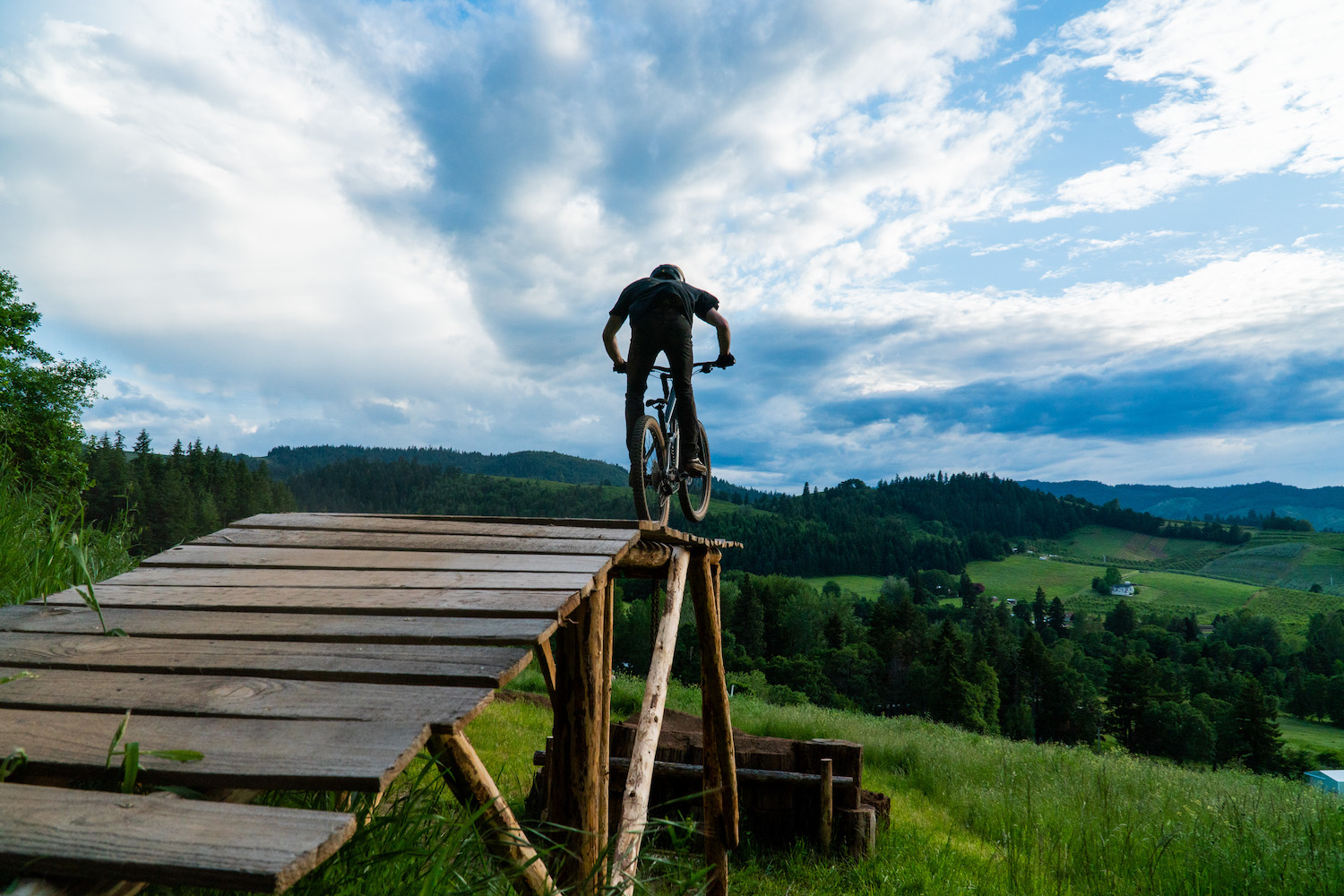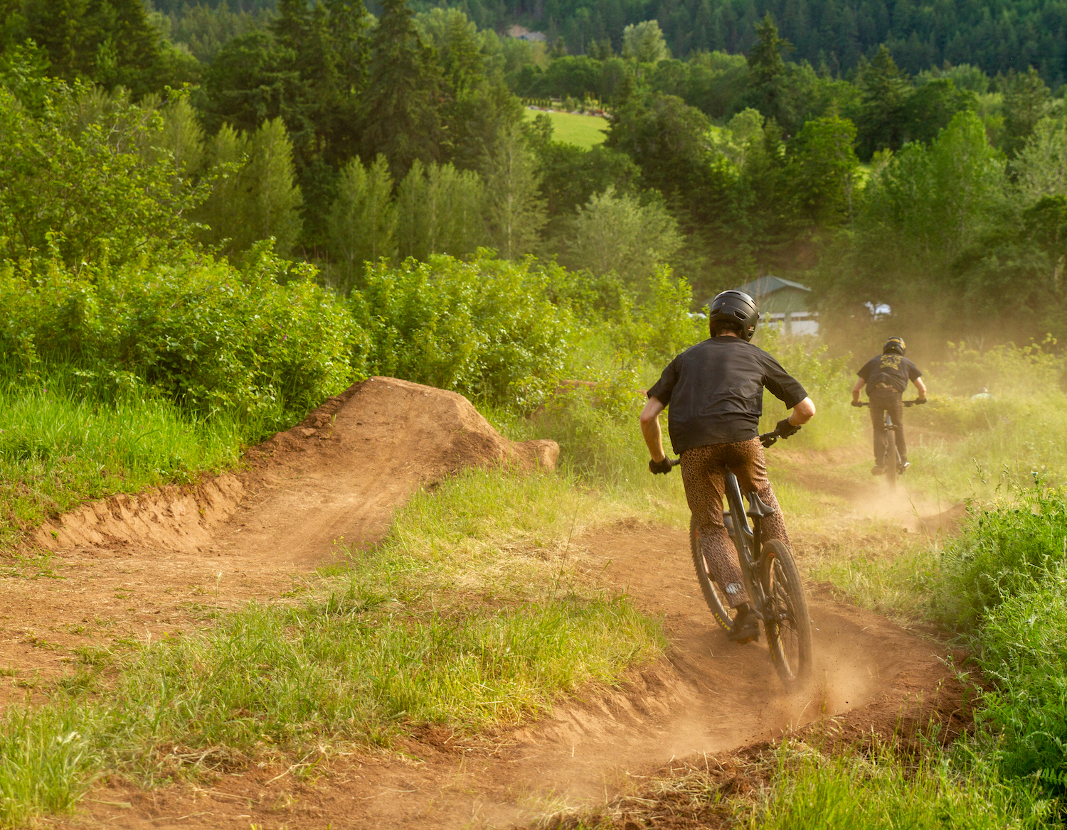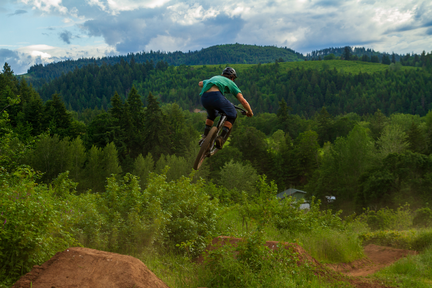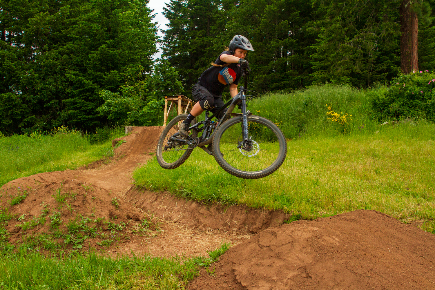 The trail started with just a few berms coming down the hillside, we wanted to be low impact on our landlords’ property. But then, I kept thinking about building a step down off the irrigation canal embankment. We couldn’t help ourselves from trying, so we gathered a bunch of down trees from behind the house, debarked them, and pieced together what is now a pretty significant step-down structure. Once the step down was finished, we couldn’t stop there, so we decided to put in a shark fin and a 25-foot kicker. It all came together relatively smooth minus accidentally breaking the neighbor’s water pipe and having to fix it…Whoops.