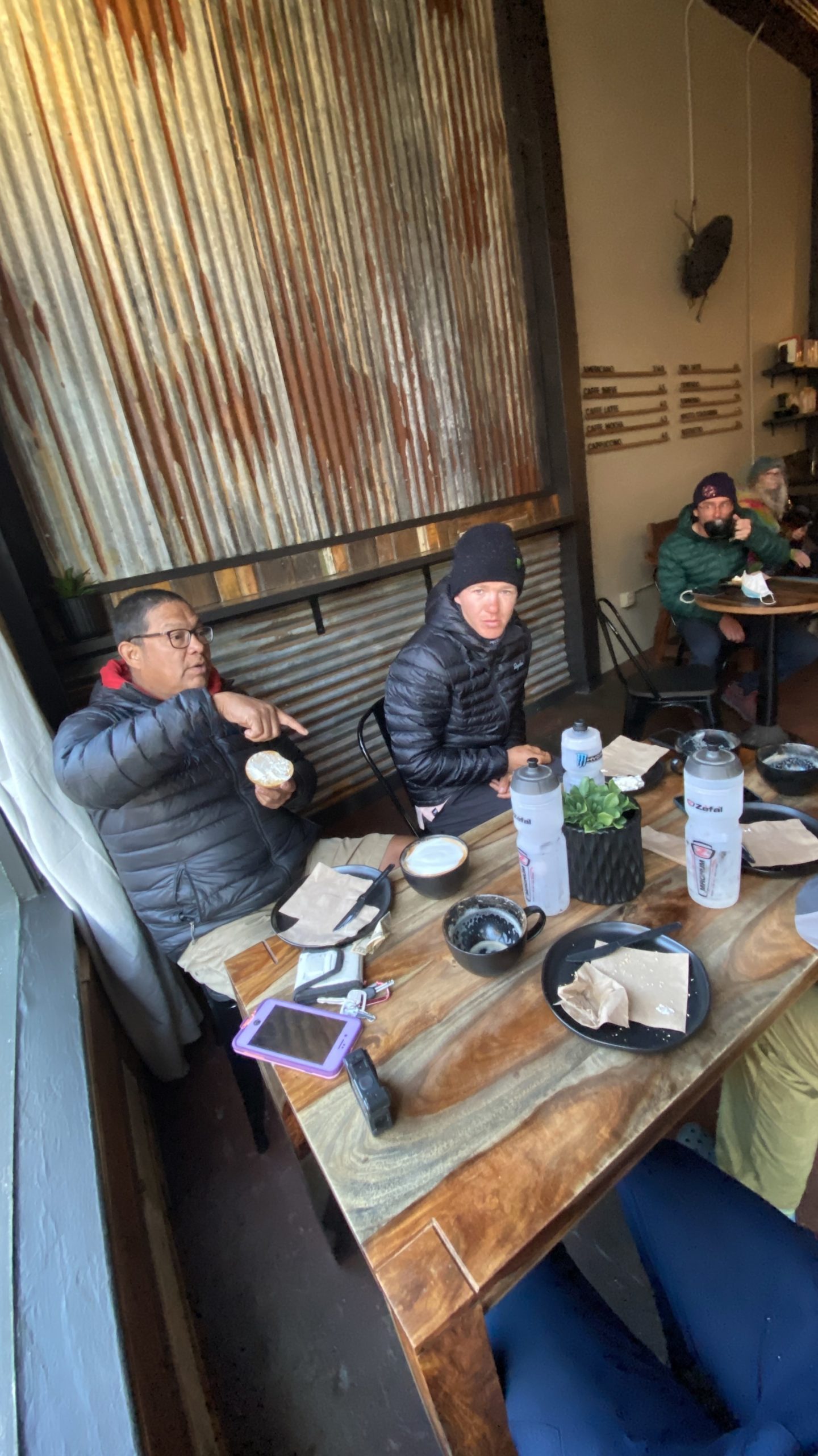 Keegan came out of the gas station with arms full of haribo gummy rolls and ho ho’s to find a Smirnoff in his bottle cage. We all got a laugh out of it.