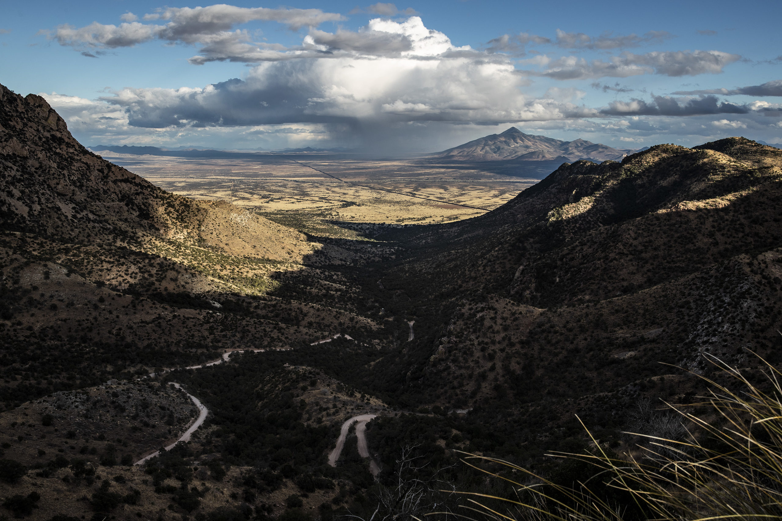 We dropped the snaking gravel road into the grass lands below and pounded pavement into Bisbee.