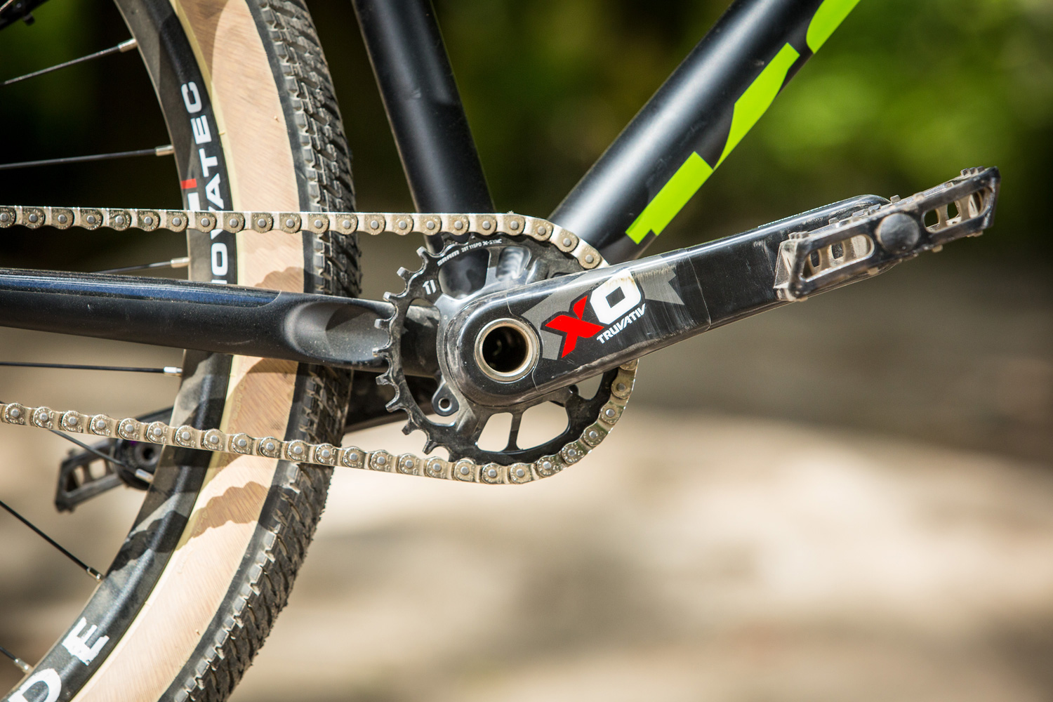 Truvativ XO cranks, a 32t X-Sync chain ring, polycarbonate pedals and a half link chain get things moving.