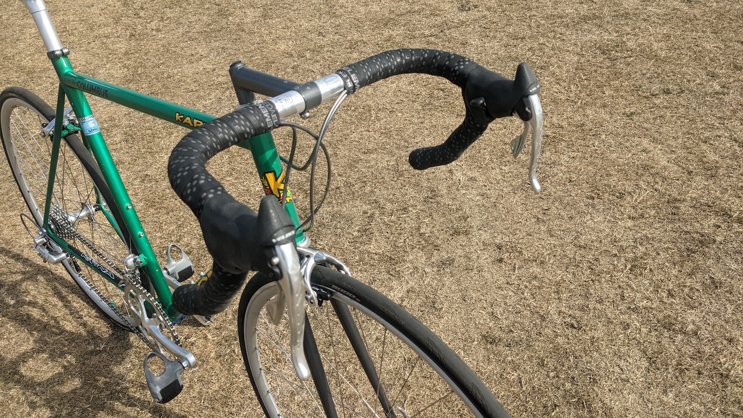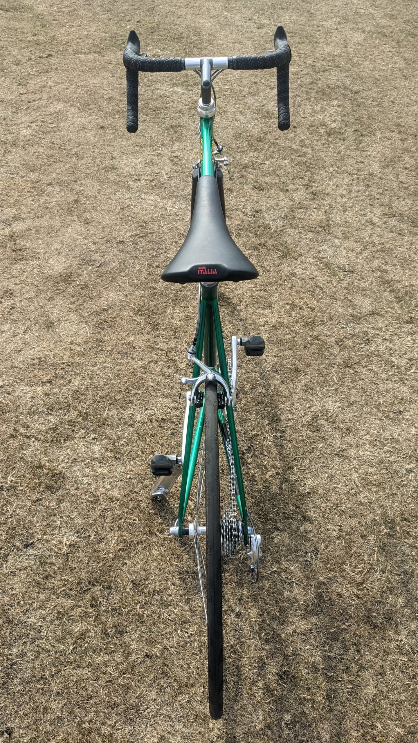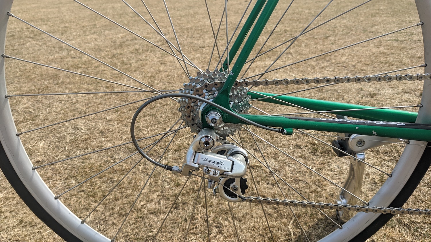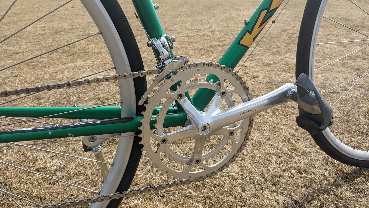 Alasdair is running a vintage Campagnolo drivetrain on this beast.