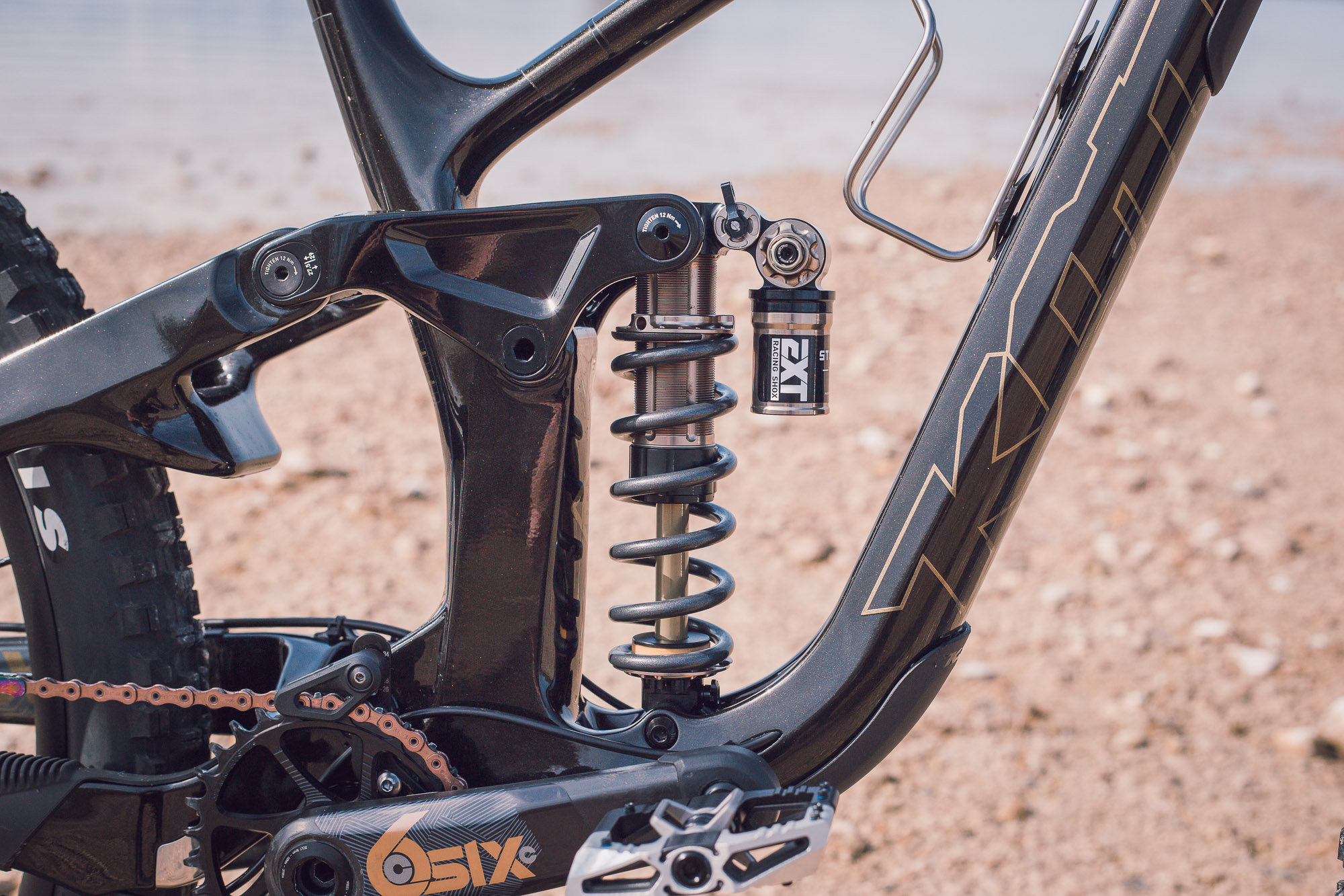 His size small Process X CR is sporting a mullet setup aith a 27.5 wheel out the back. Sticking with the rear of the bike Johannes has spec’d German-made EXT Storia Shock from @schnurrtech. The shock matches the gold dust paint job perfectly.