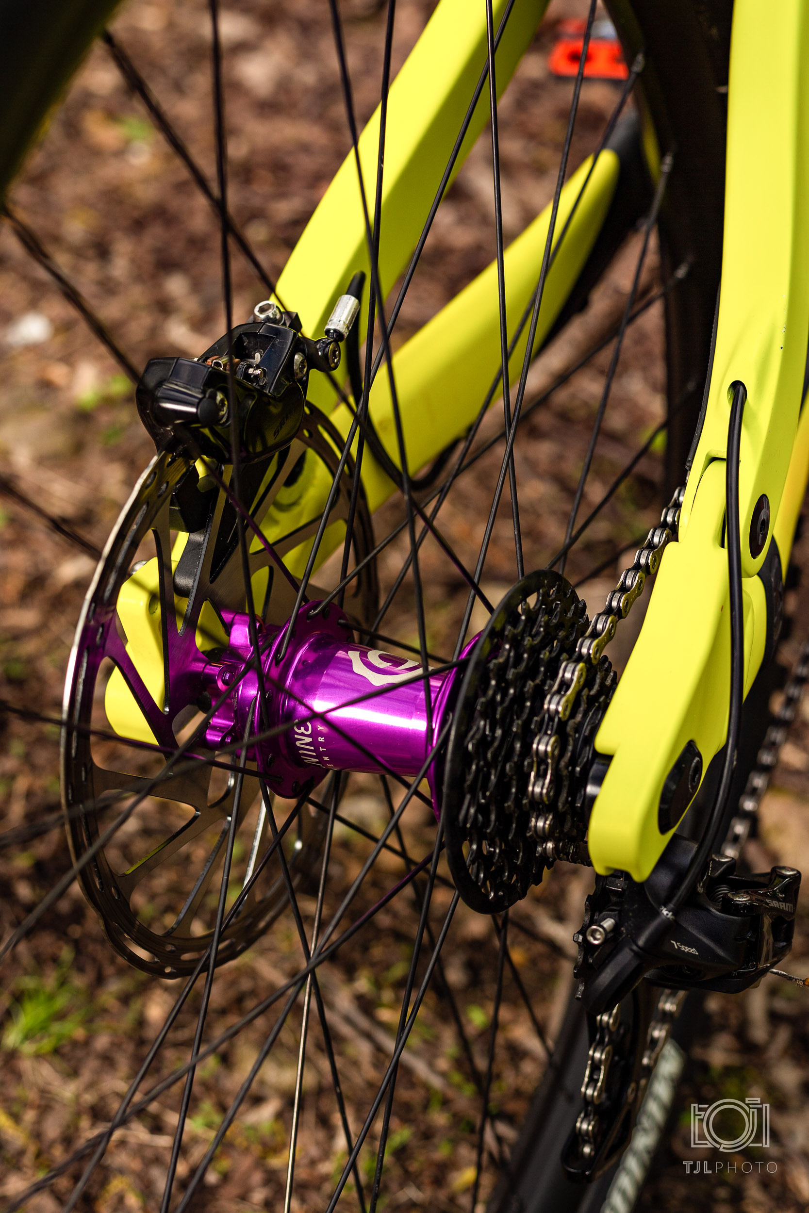 Drivetrain wise I chose to stay basic for a few reasons. On the road and at races it’s easier to find a more basic drivetrain component than it is to find the most elite. Also at my home mountain loose shale claims derailleurs and cranks constantly. With that said it has a 7 speed Sram GX build with a 36t in the front with an E.13 TRS Guide.