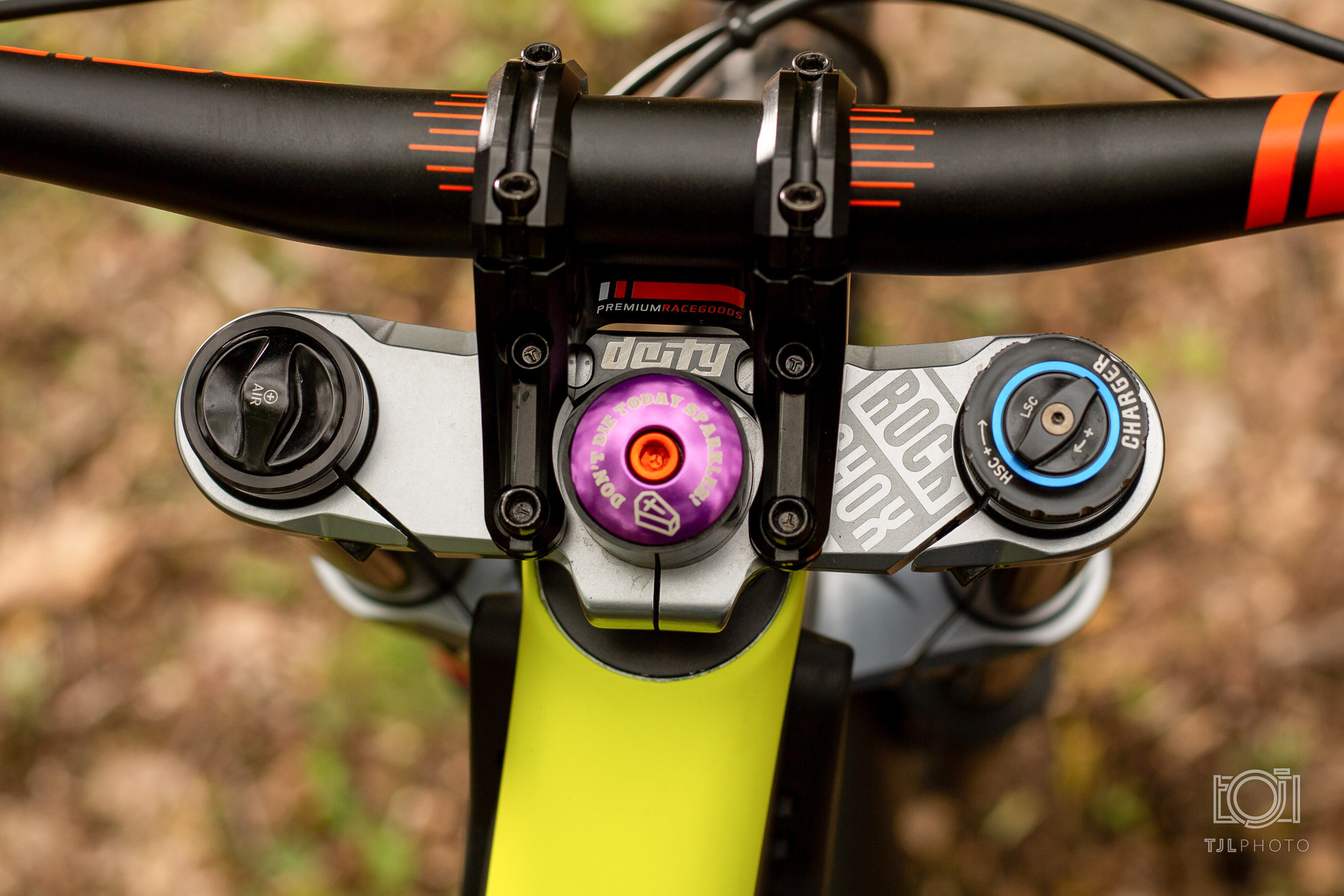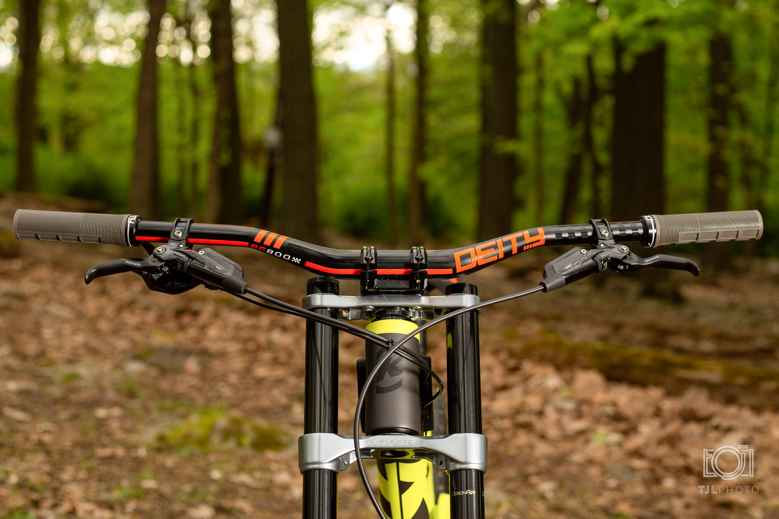 As far as stopping goes, I built her with Sram Code RSC brakes with 200mm rotors front and back with Truckerco Pads. I prefer the feel and adjustment of that system. In the cockpit area, it’s all Diety Components for me. The bars are a BF800 Brendog cut down to 787 with Knuckleduster grips. The stem is an intake DM.