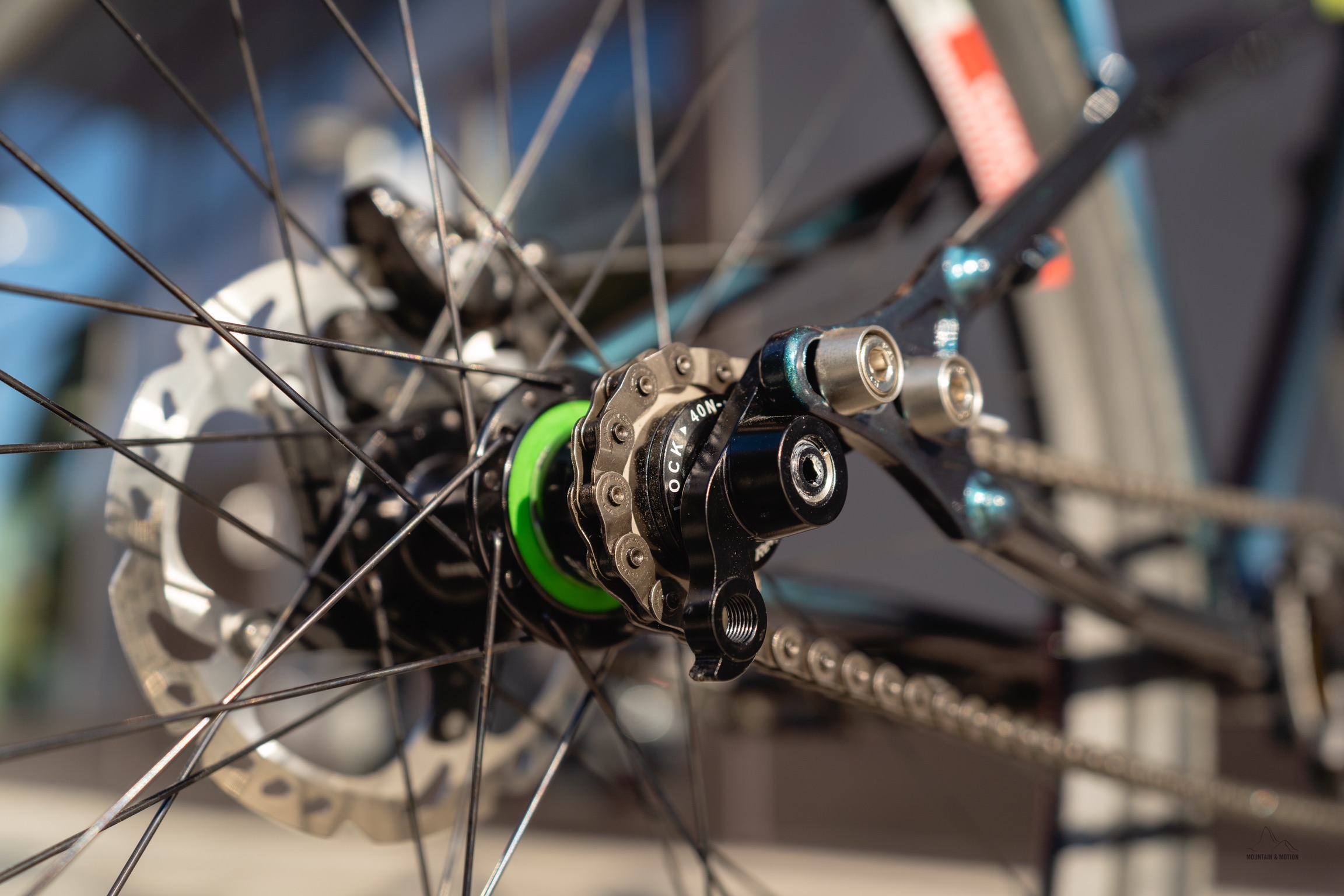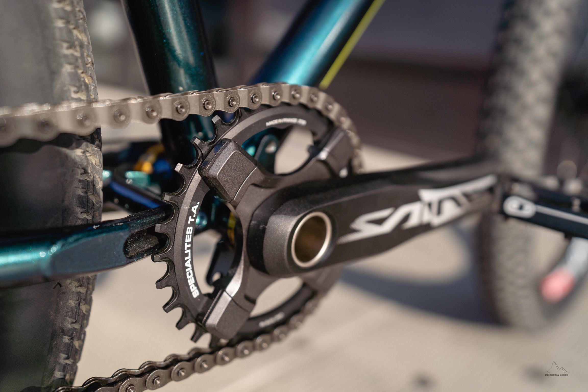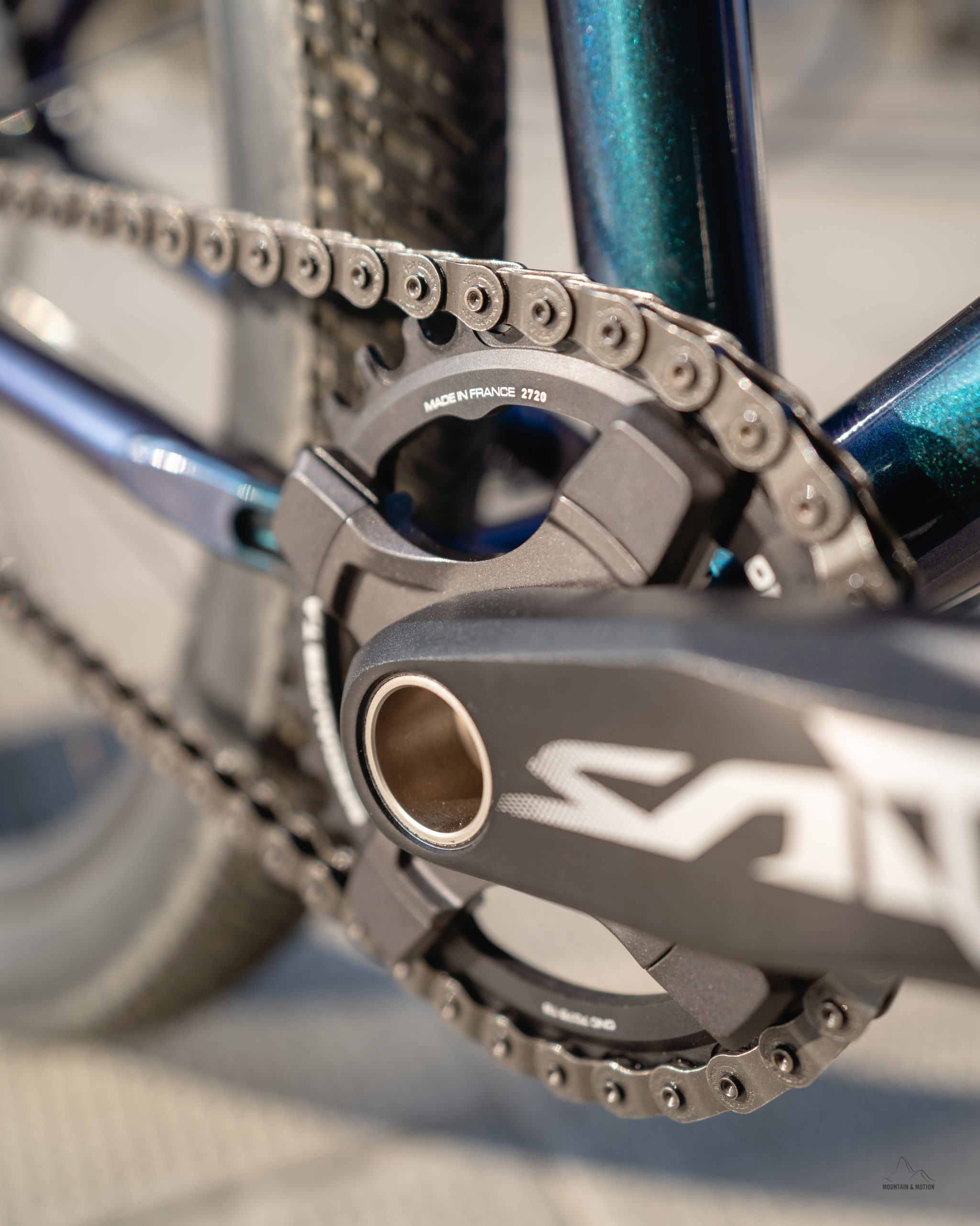 For the drivetrain, Nico went with a set of Shimano Saint cranks with a local french T.A One chainring in 32t, the rear is a 14t. The half link chain from The Shadow Conspiracy is not just burly and super rad looking, it also allows you to slam the real wheel further in than possible with a standard MTB chain.