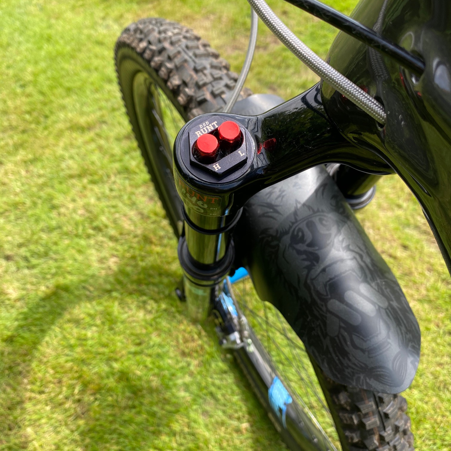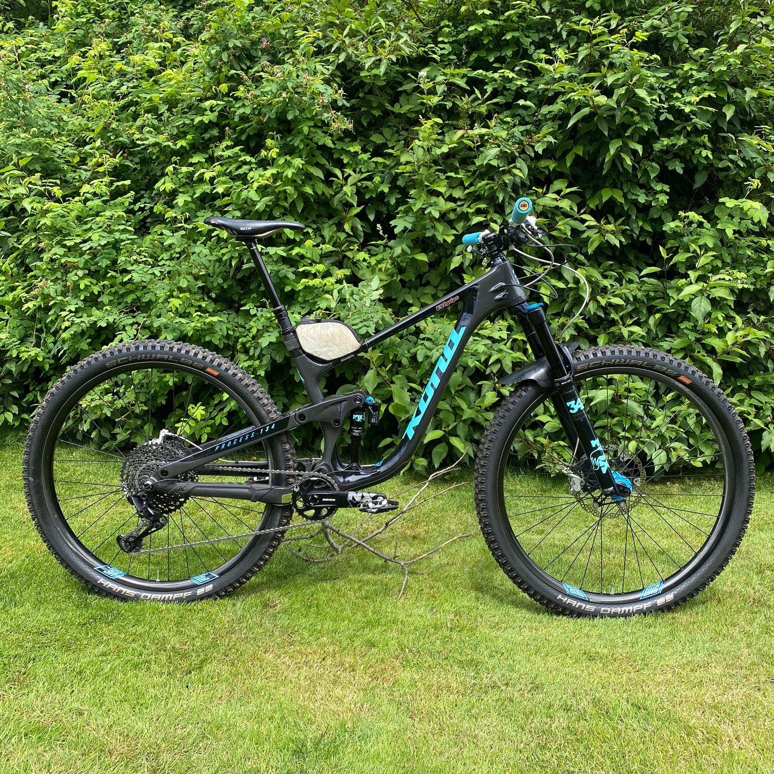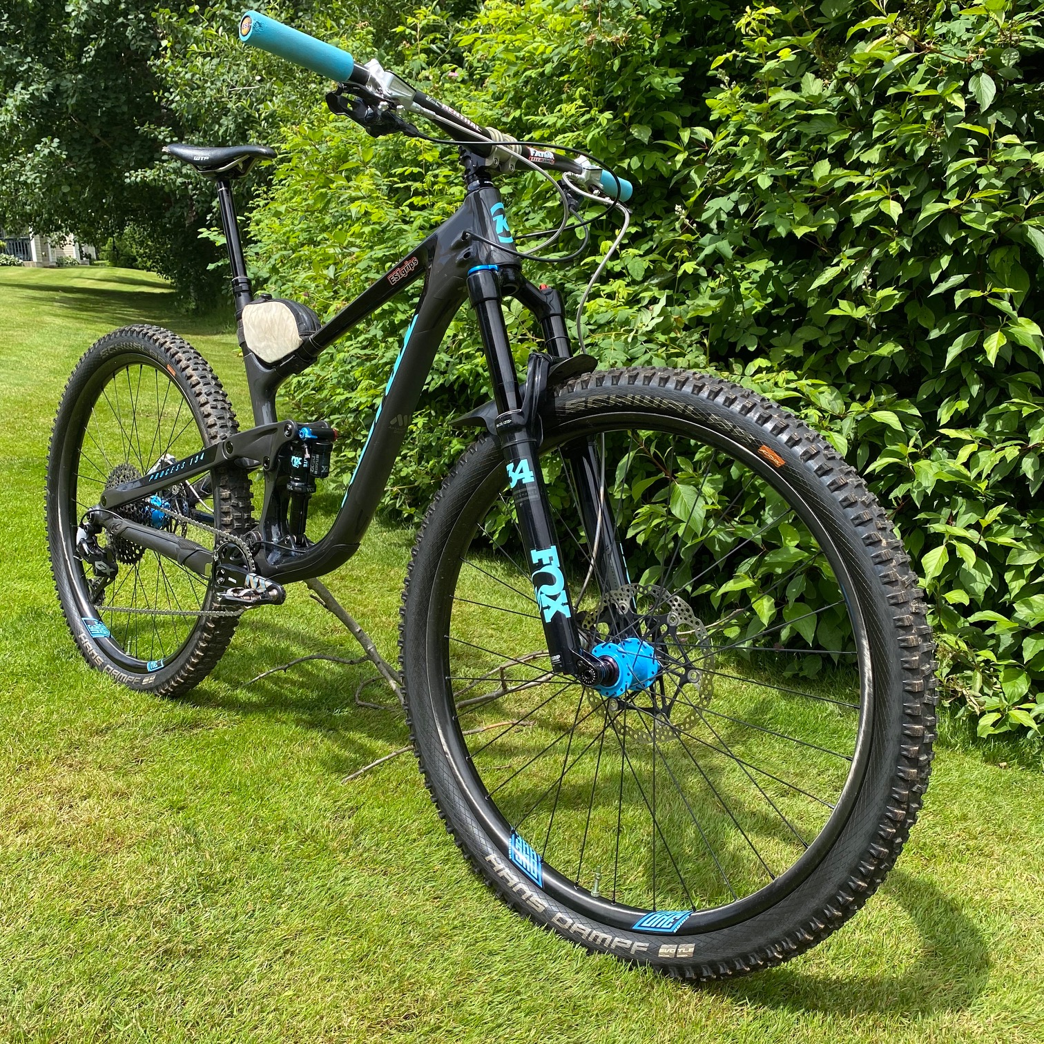 The suspension is a Fox affair, with a Float 34 Performance 140mm looking after the front end but Adam has added the Runt from Diaz Suspension Design, the Runt Air Sprint gives the Fox air fork a coil-like feeling. The build is rounded out with a Oveja Negra Small frame bag.