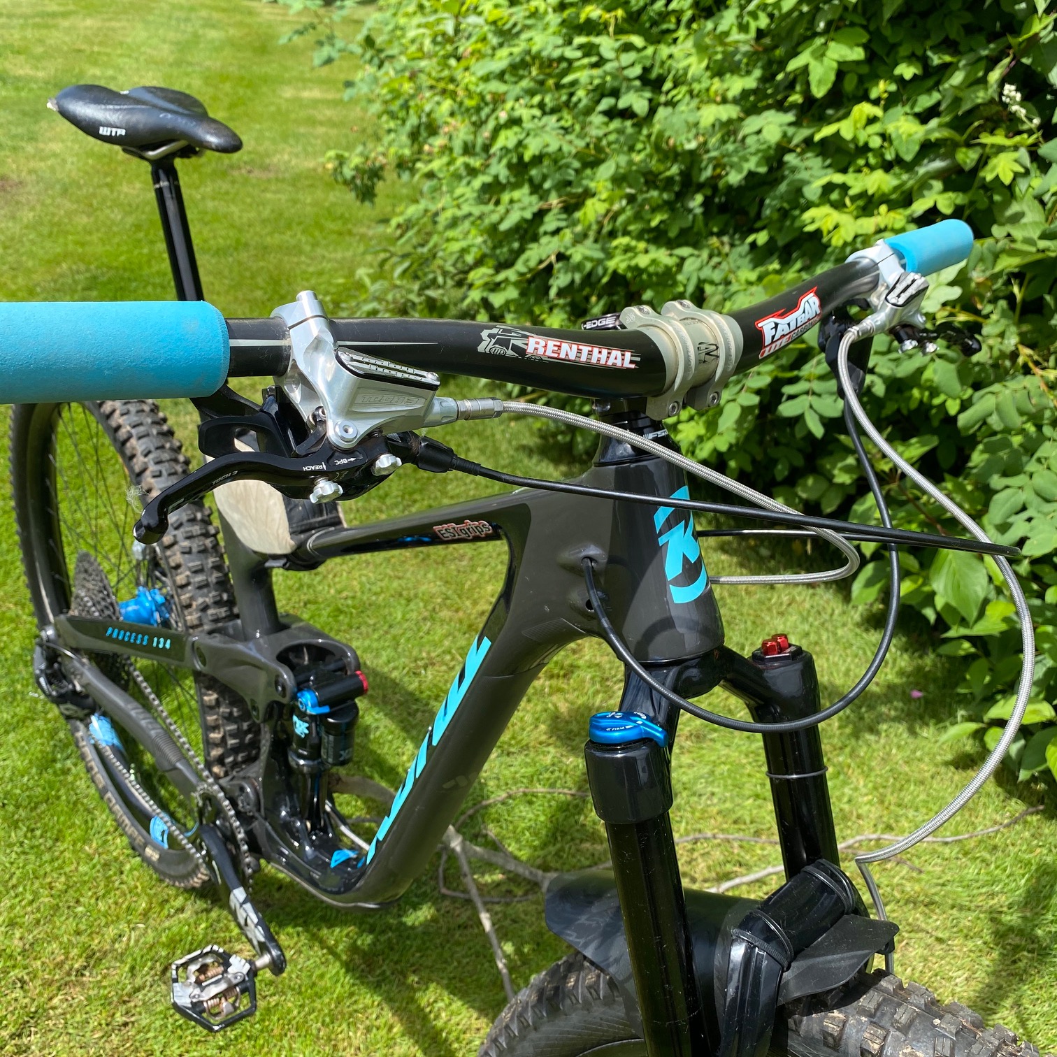 There’s a whole bunch of UK love on this 134. the cockpit featuring two classics from Renthal Racing, a carbon Fatbar Lite 35 and an Apex 35 stem. Braking comes courtesy of that famous Barnoldswick company, Hope Technology, Adam has spec’d Hope Tech 3 levers, that connect with the Hope E4 calipers via a braided steel hope hose. Both the front and rear wheels are rocking 200mm Hope Floating rotors.