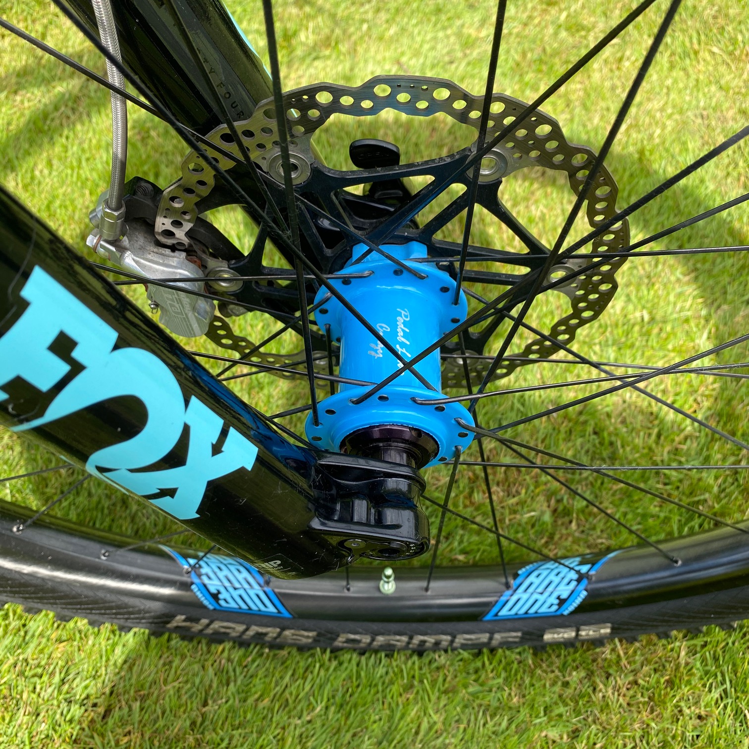 As I mentioned earlier the bike rolls on We Are One Union carbon hoops that are laced to custom painted and etched Onyx hubs via Sapim CX-Ray spokes. The “Pedal Like Crazy” is a throwback to how Adam’s Mom taught him to ride! both front and rear wheels have Cush Core inserts and the are wrapped in Schwalbe Hans Dampf Snakeskin Addix Soft 2.35 tires.